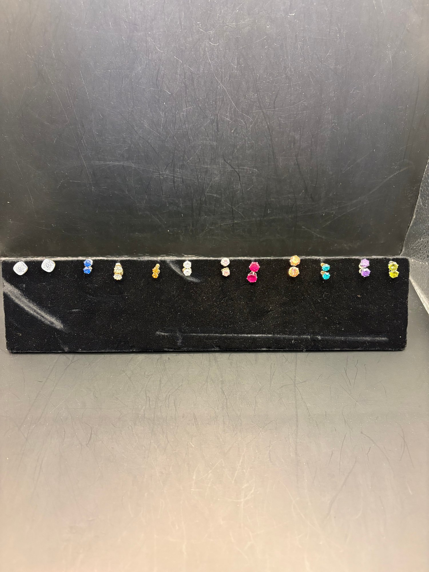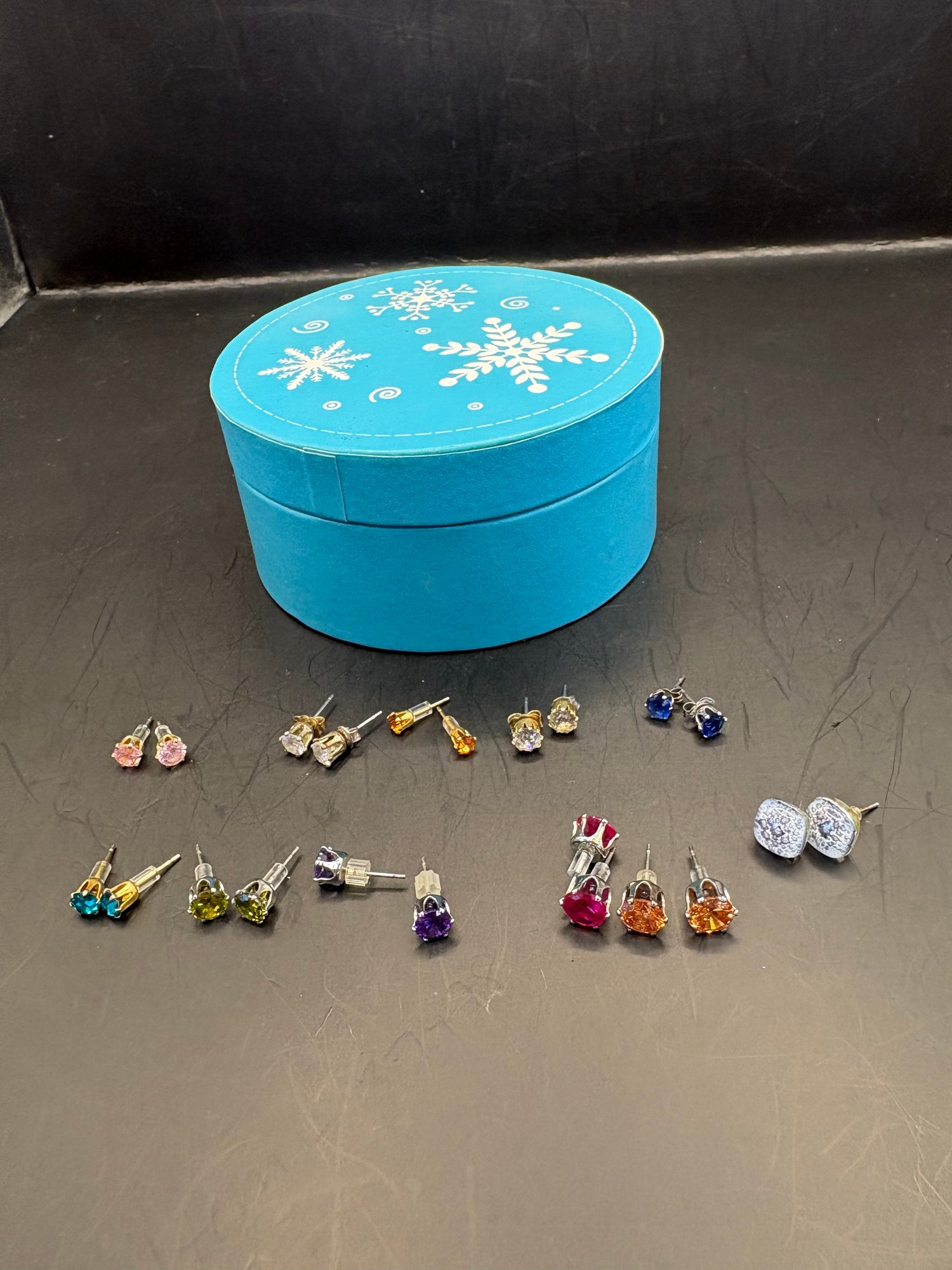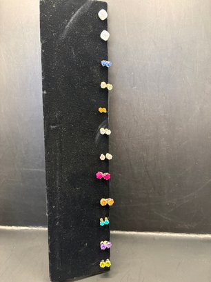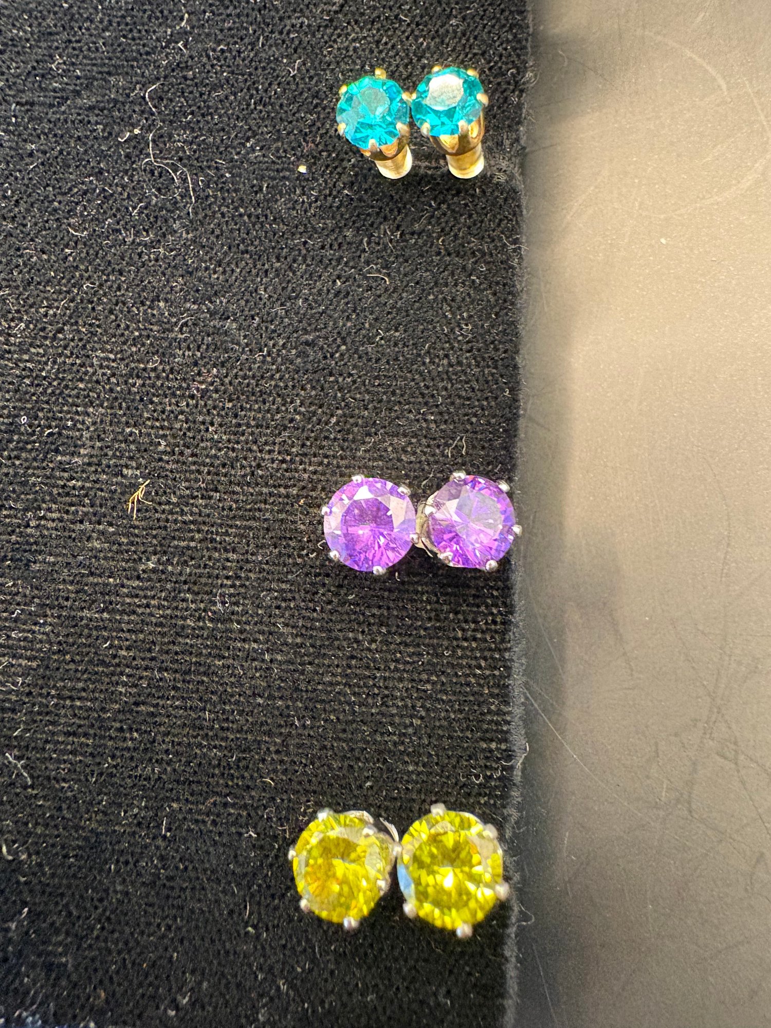 11 pairs of cubic zirconia, colorful, earrings, studs, some larger some smaller stainless steel posts