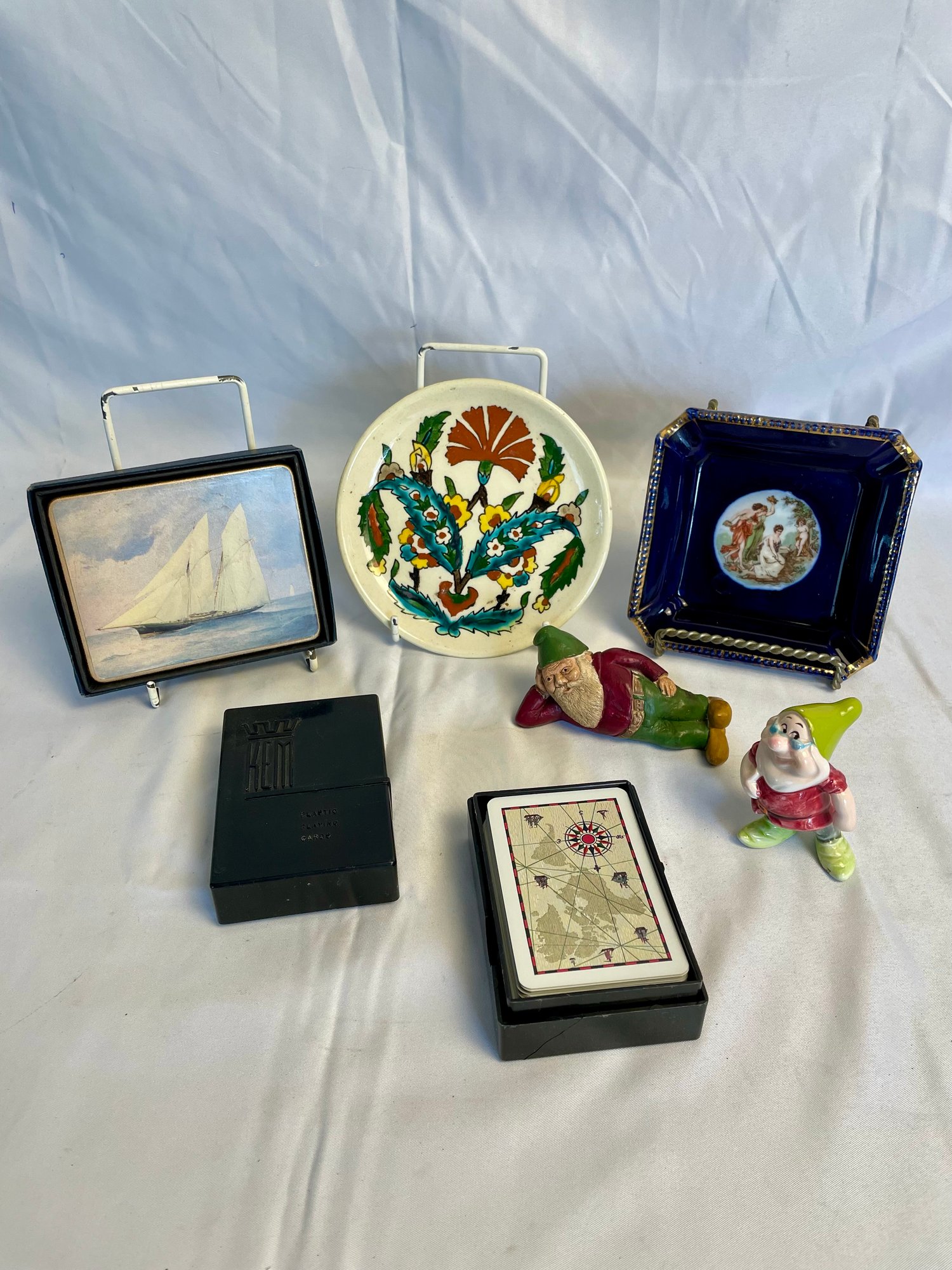 Decorative dish made in germany, small decorative plate, 2 figurines, 2 sets of playing cards and 3 sailboat coasters