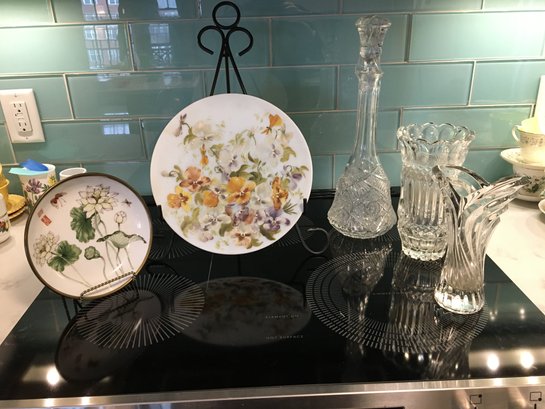 Carafe, vases, floral paint design on larger plate appears textured like plate is hand done