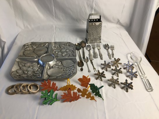 Napkin holders, assorted silverware, variety items of kitchen items