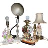 includes seven assorted desk sized table lamps
