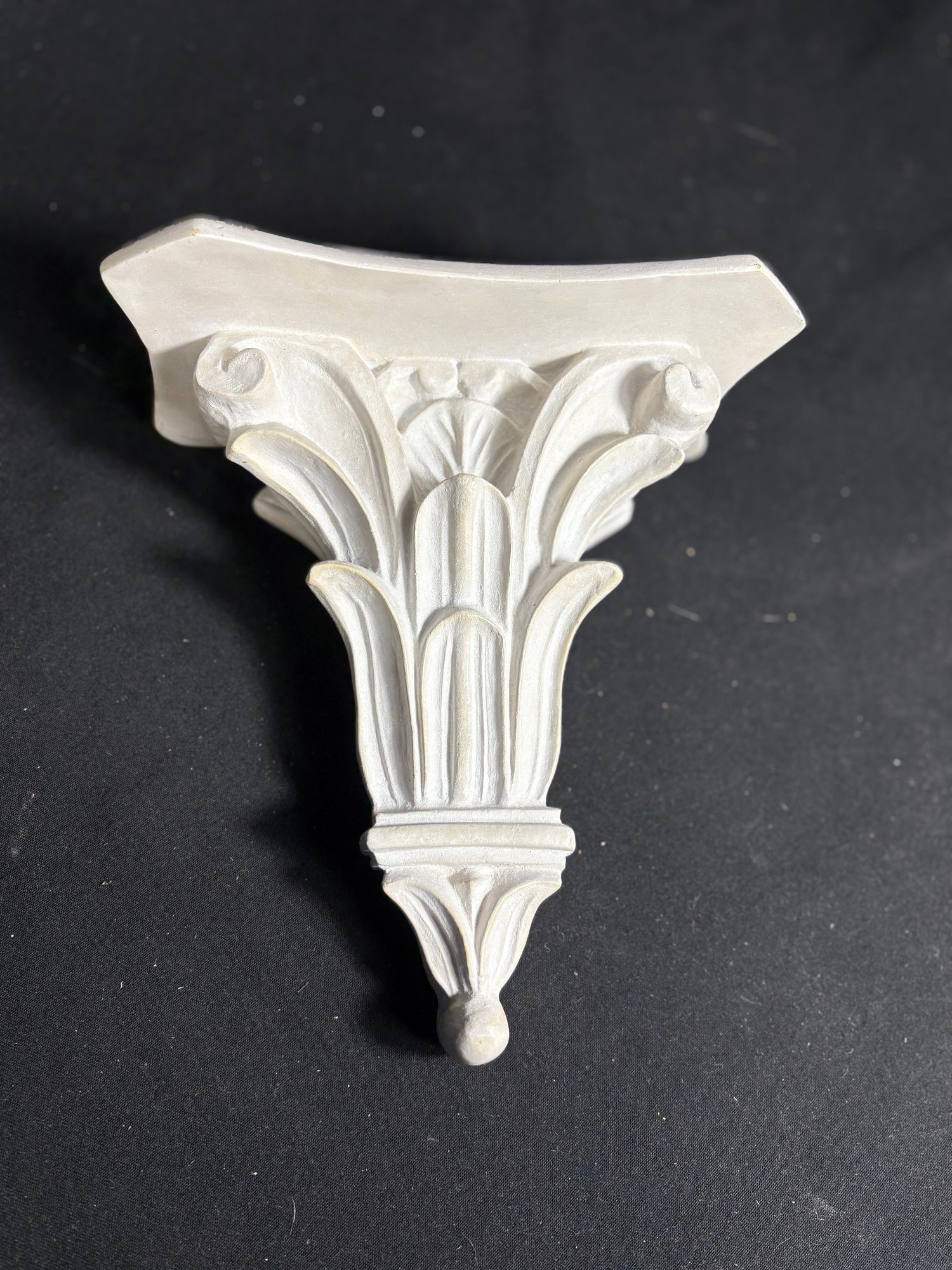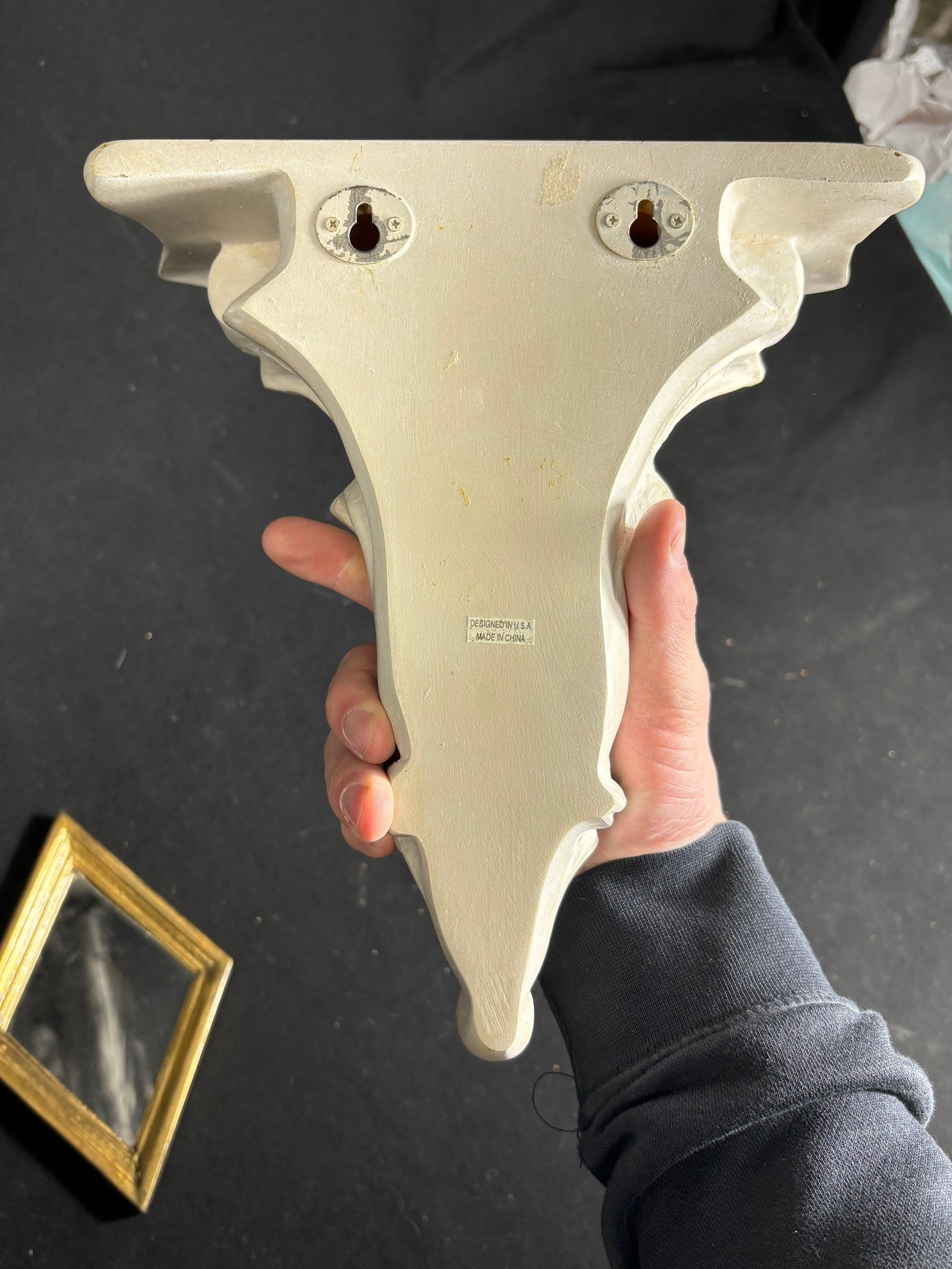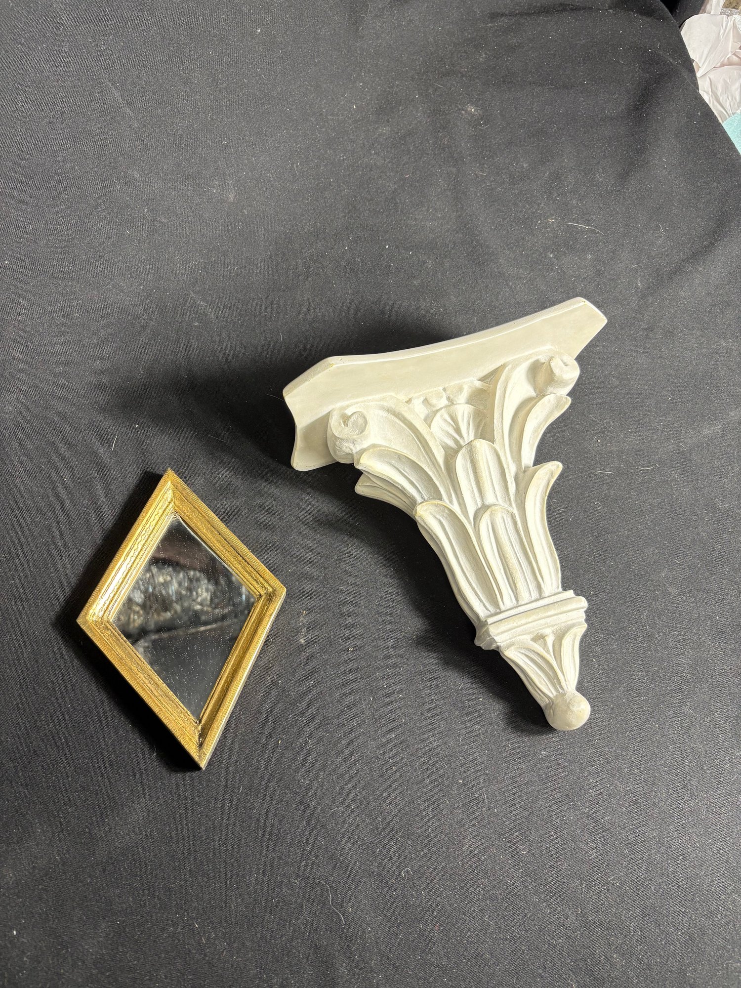 Dimensions ornate wall shelf 9 by 10 inches long. Mirror 5 by 8 inches long