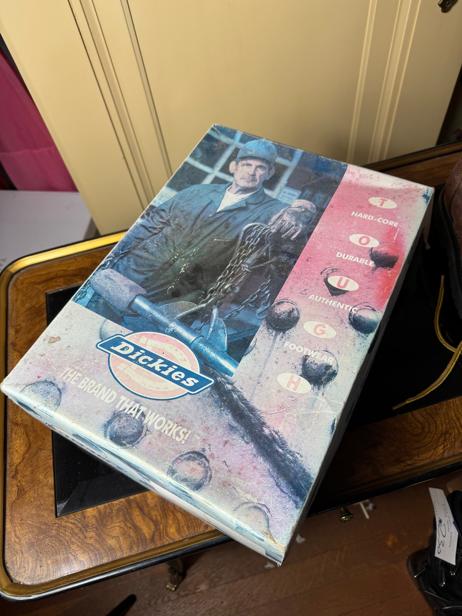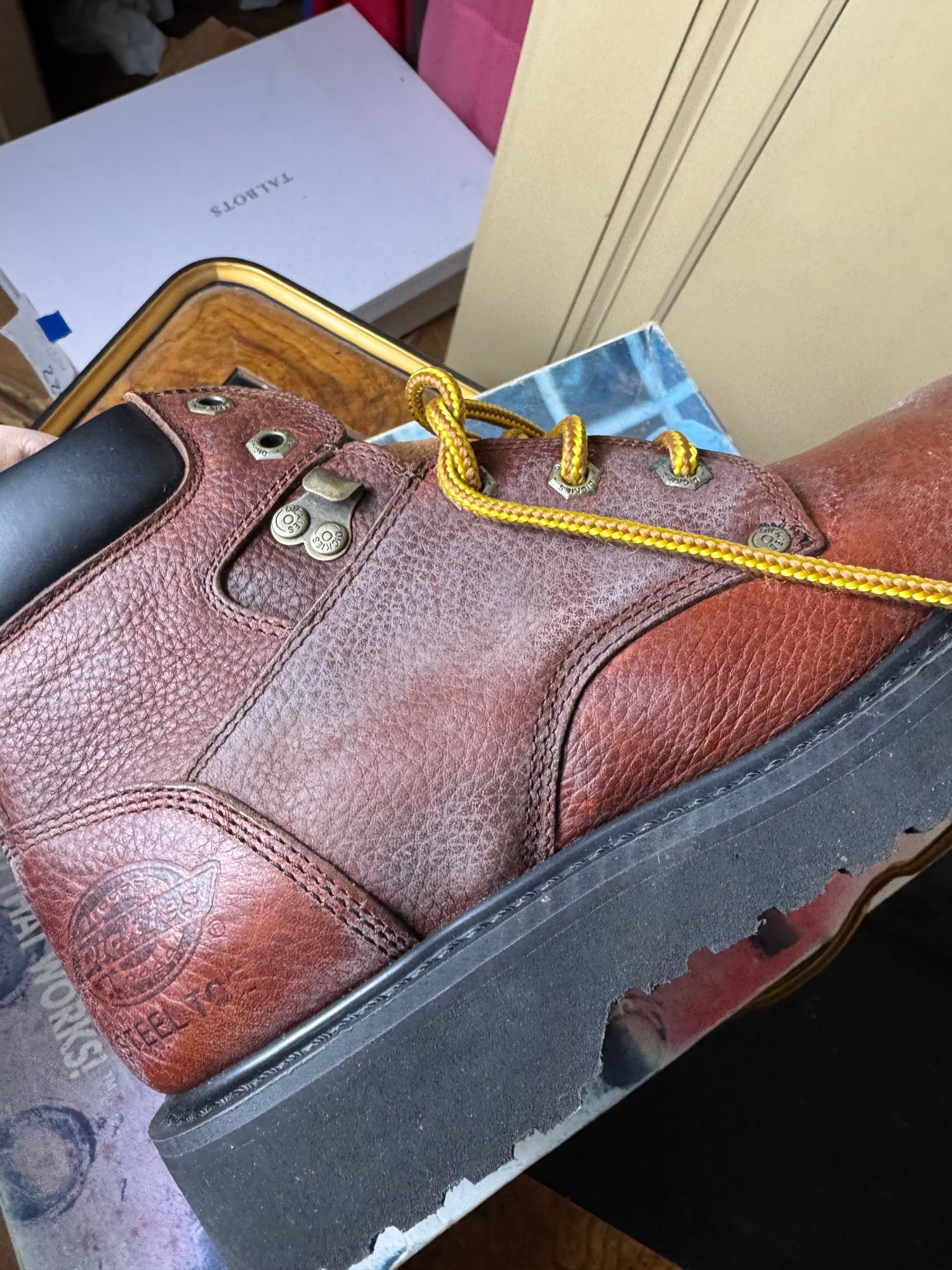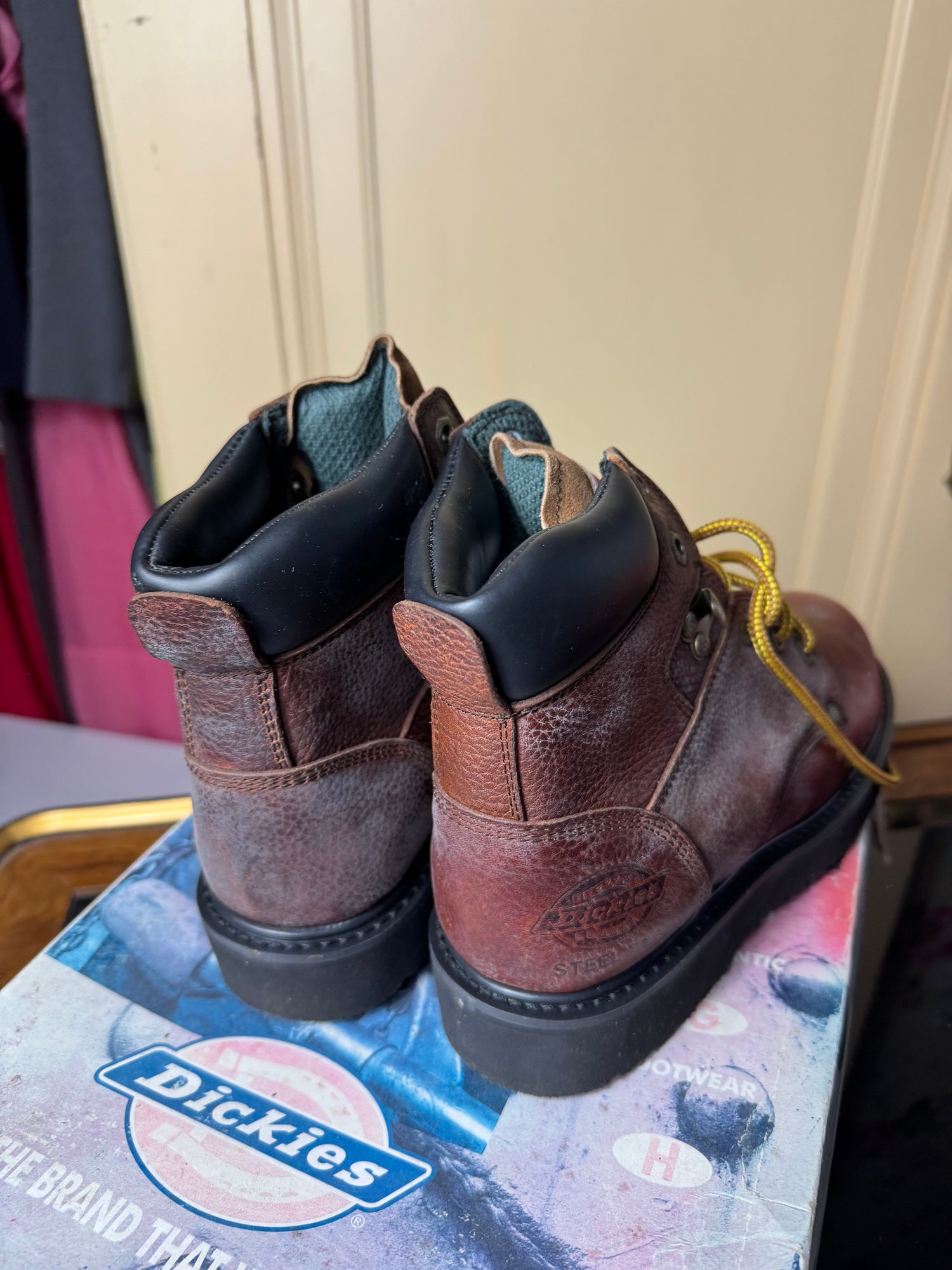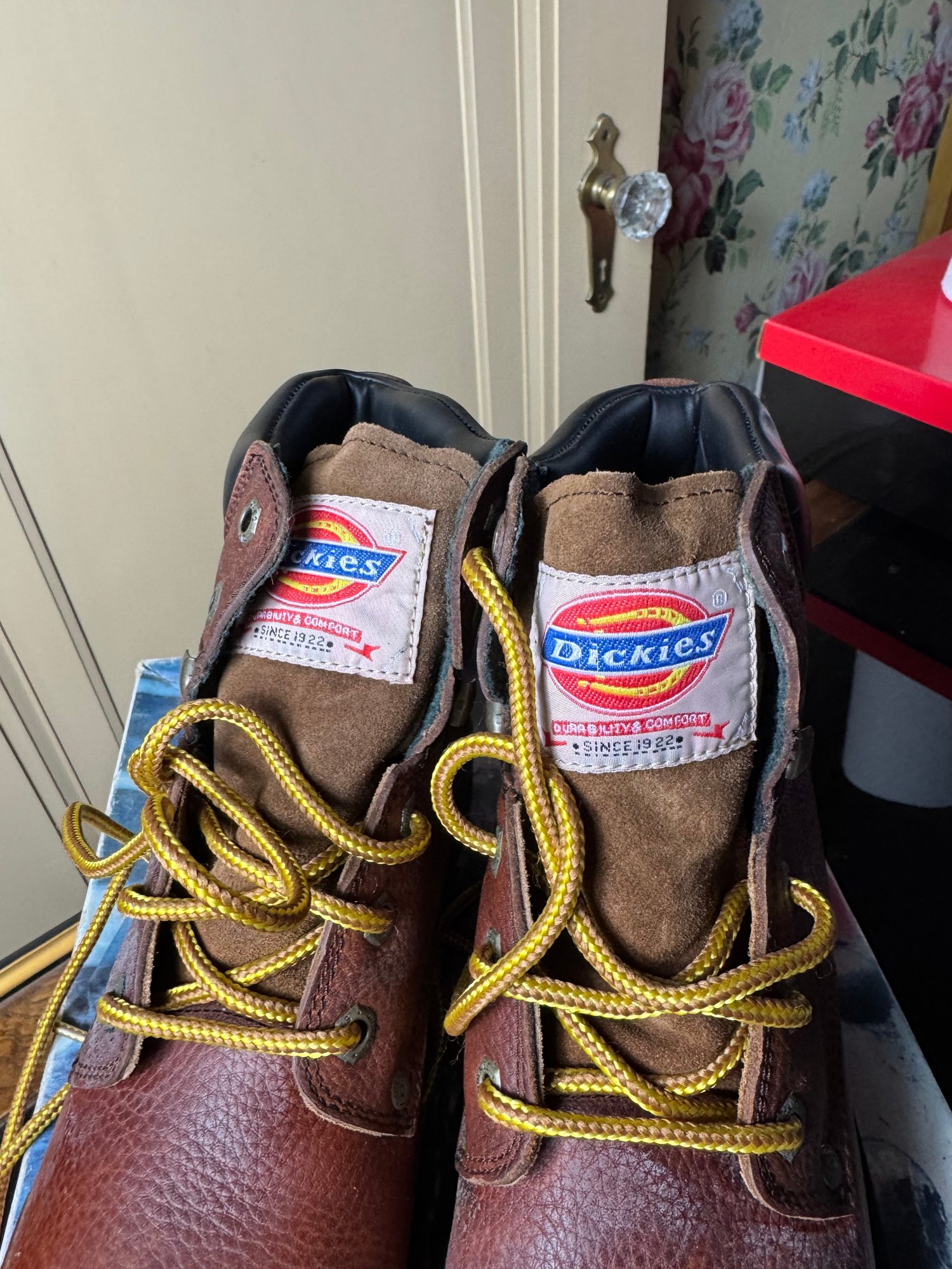 good condition, some areas of discoloration from being stored so long, the soles are in good shape & it appears this pair hasn’t been worn much