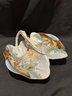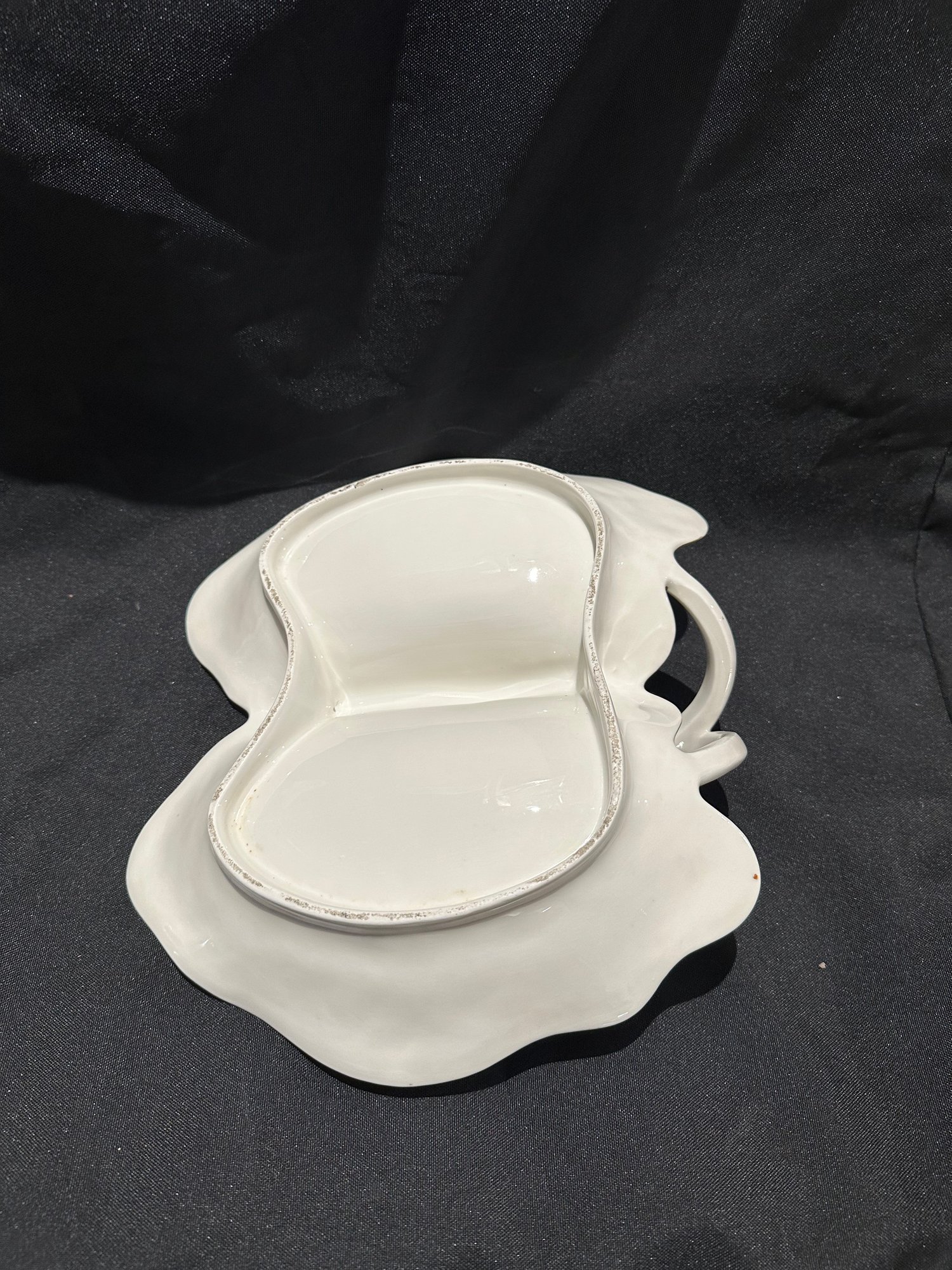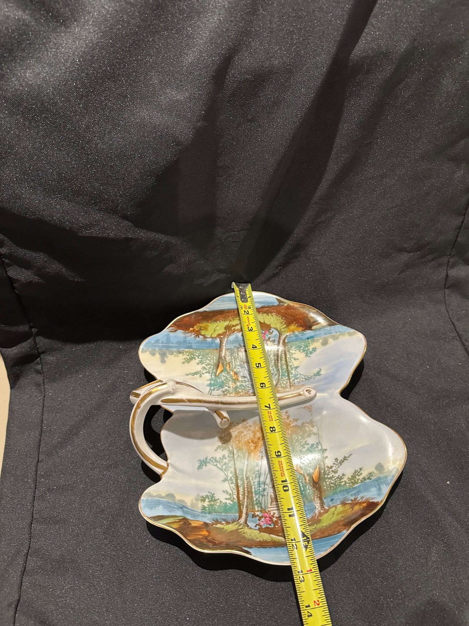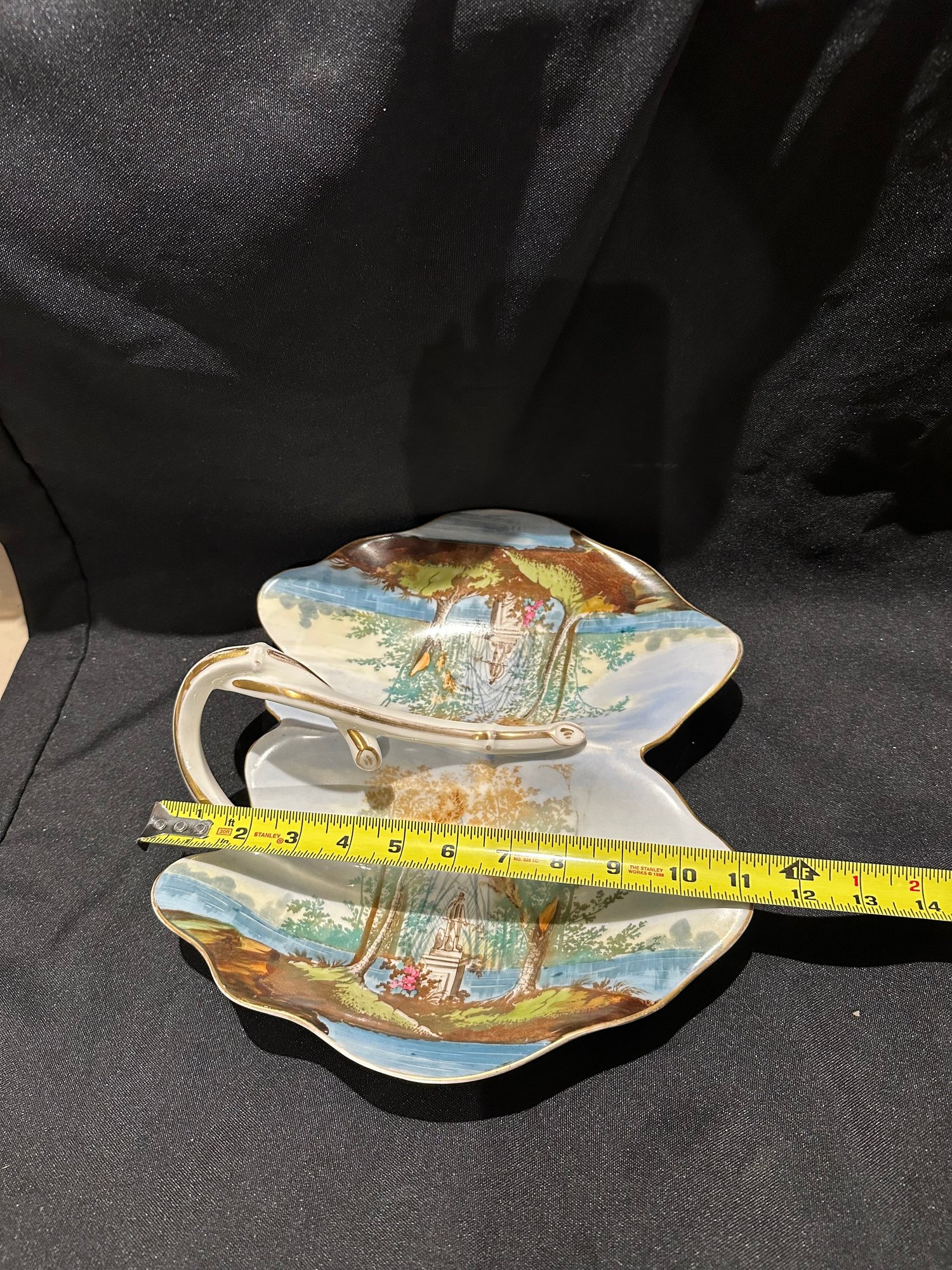 two sided serving dish with outside scene with a statue, may be from Germany no markings
