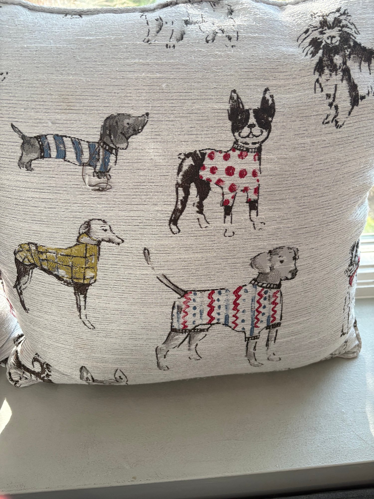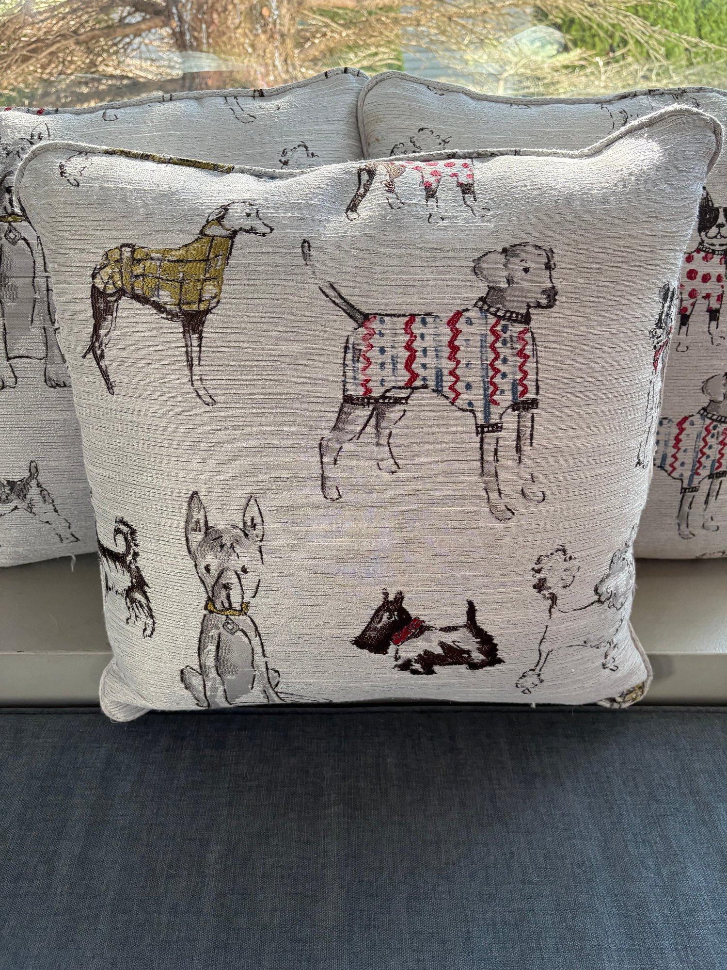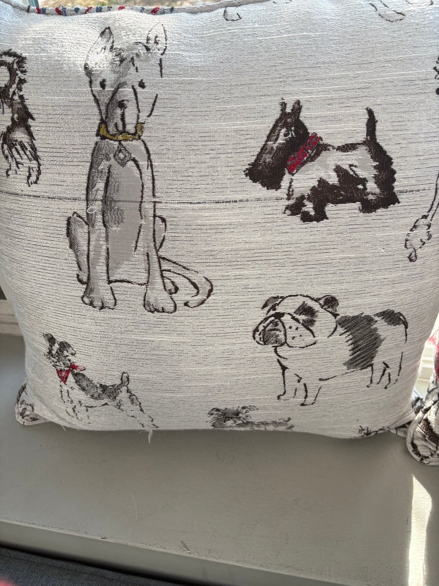 Three dog printed throw pillows they’re mostly gray and black and white with colorful accents. There’s a lot of pulls thou. 18 by 18