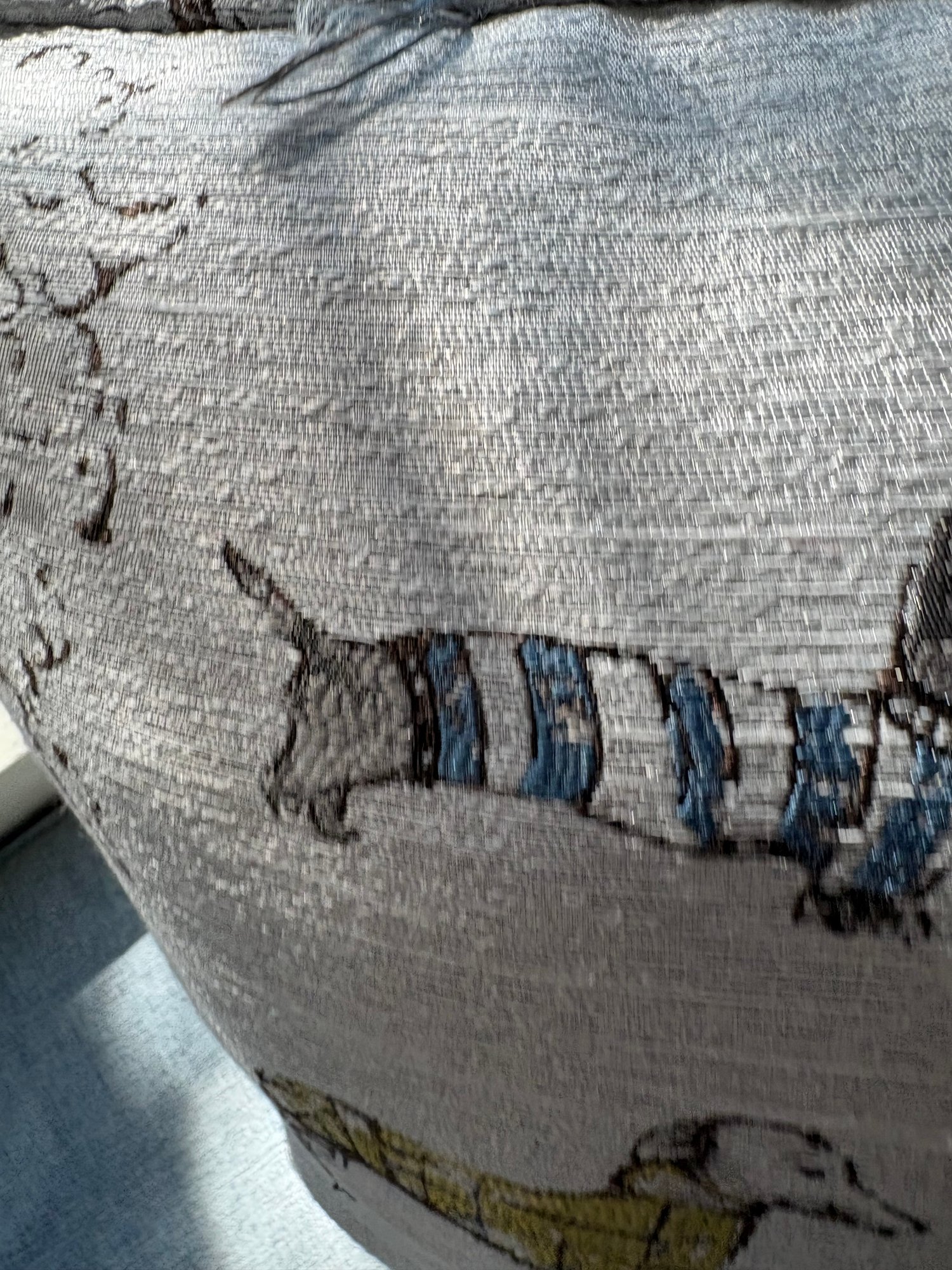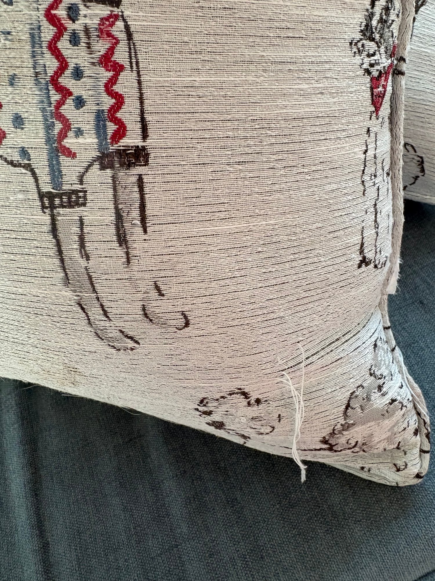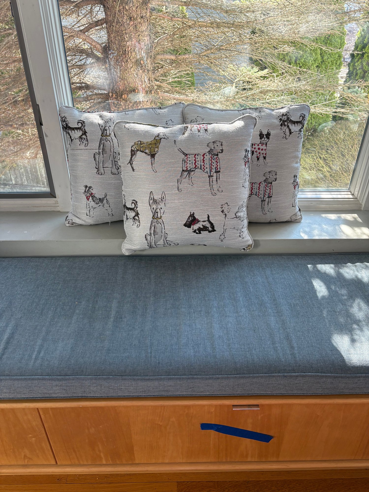 Three dog printed throw pillows they’re mostly gray and black and white with colorful accents. There’s a lot of pulls thou. 18 by 18