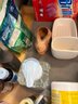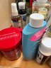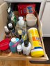 Jewelry cleaner, wood, polish, cascade, hand soap, glass, cooktop cleaner, Brillo, pads, ceramic bunny, and white ceramic sponge holder