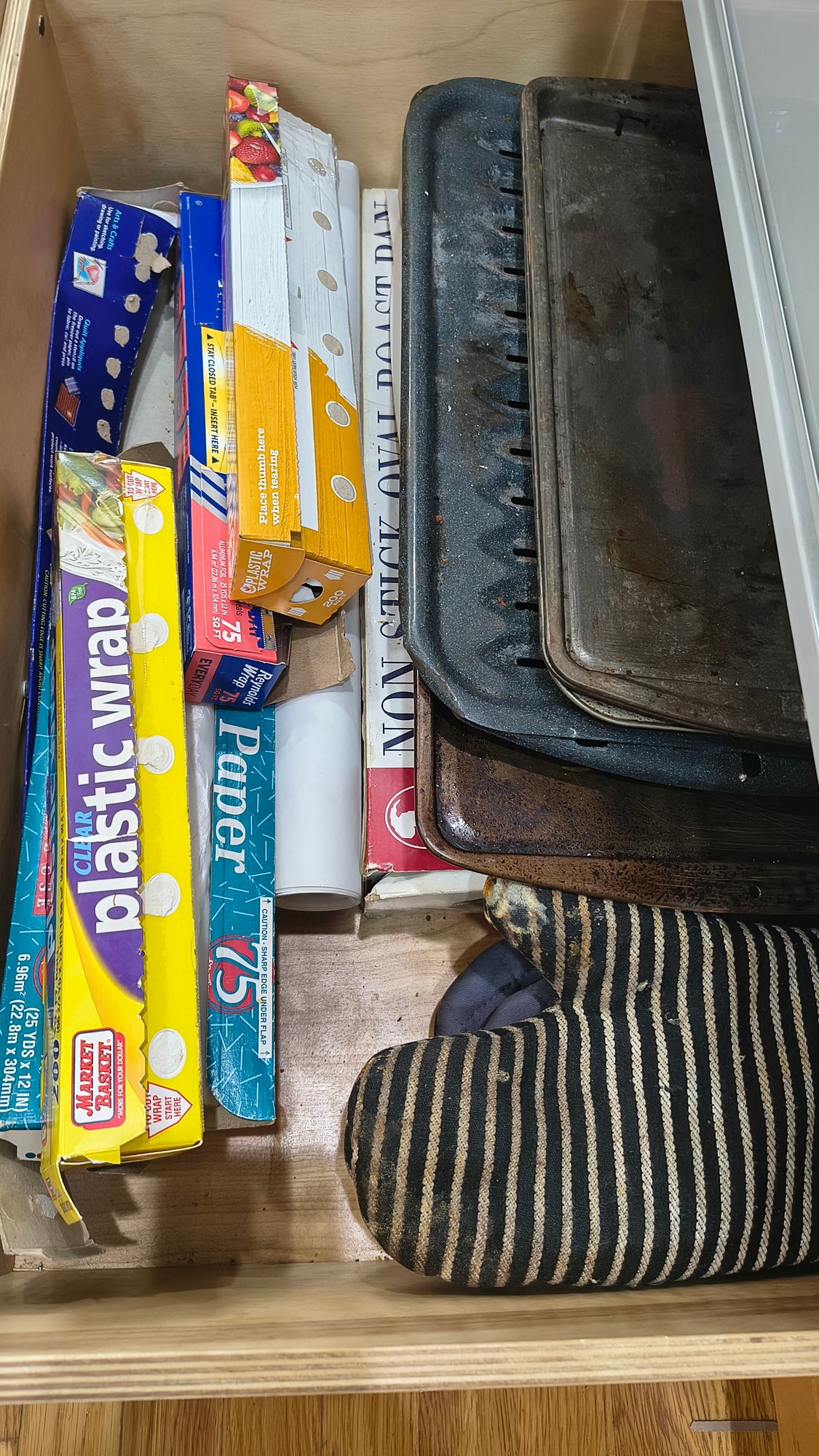 Drawer Full Of Tin Foil, Plastic Wrap, And Parchment Paper, Pans...