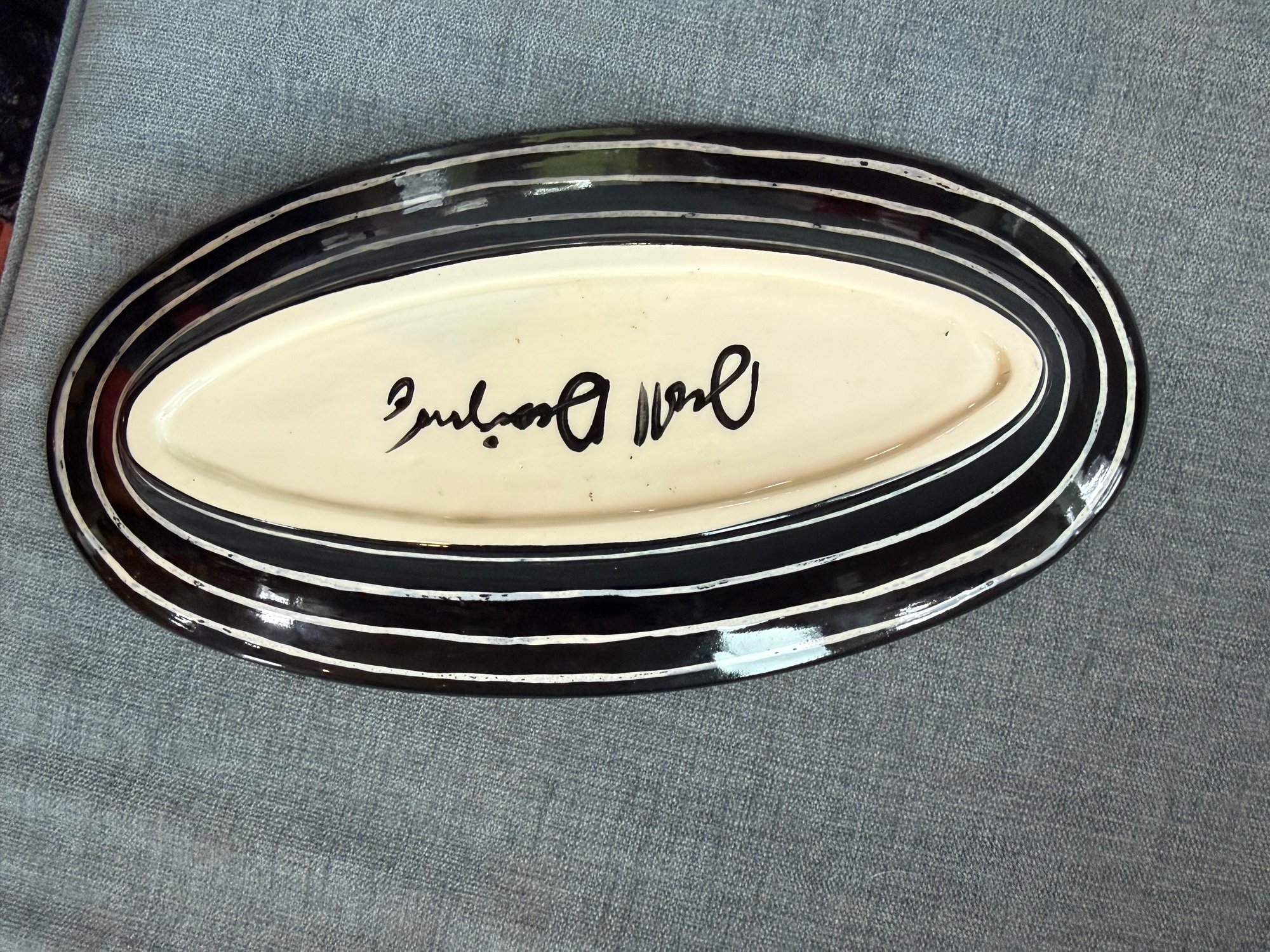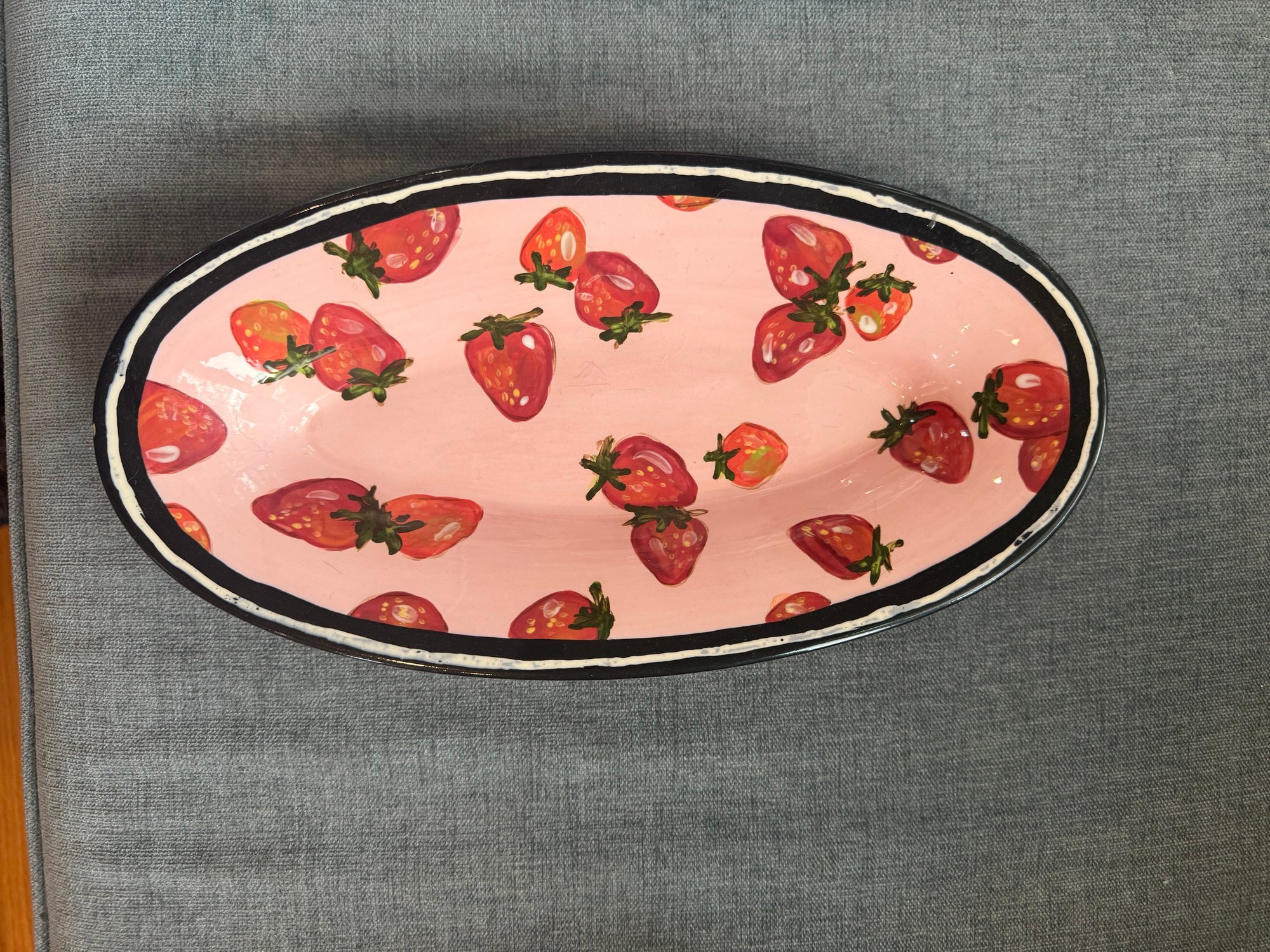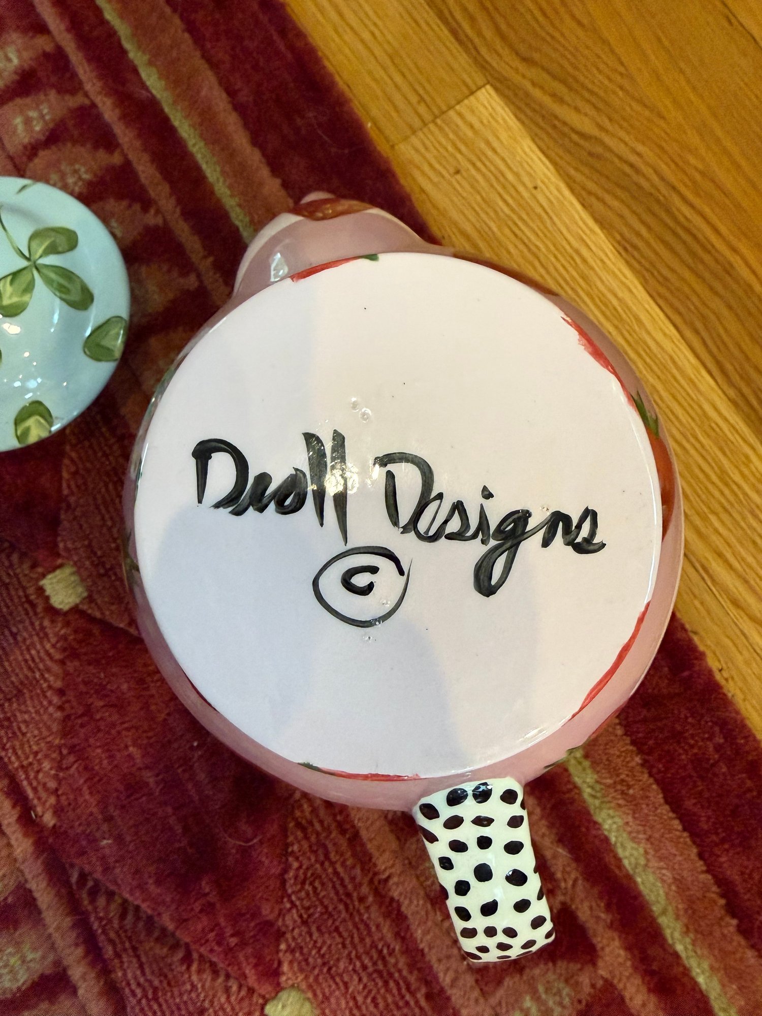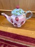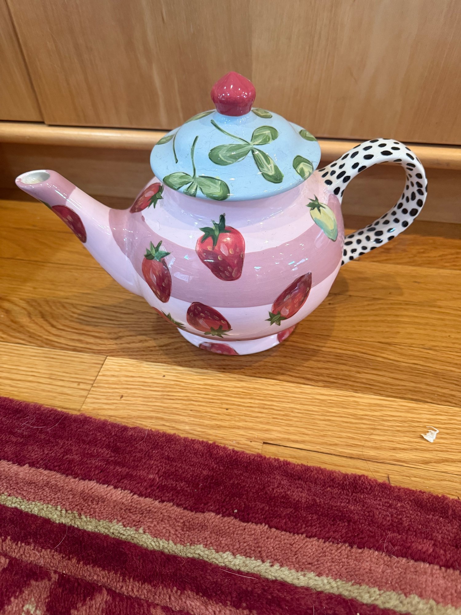 Adorable Droll teapot and platter with strawberries in pinks and reds. Teapot is 12” x9”. Plater is 13”x7”.
