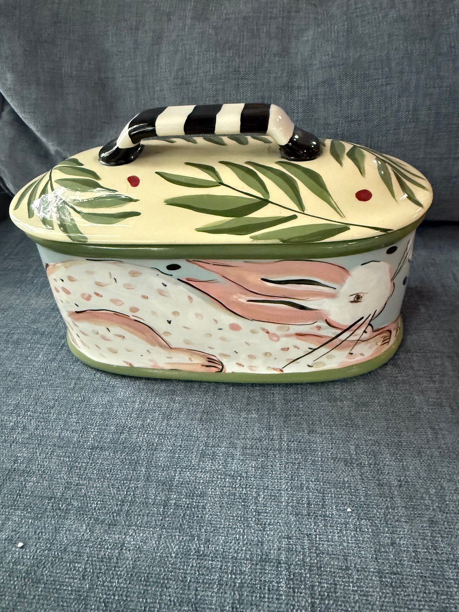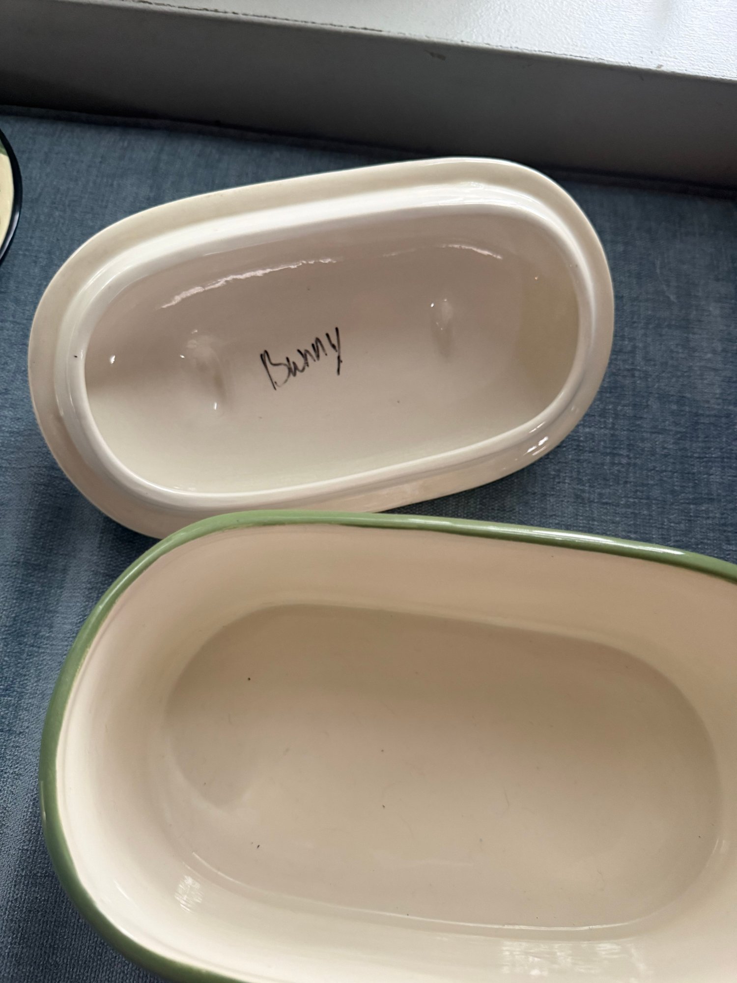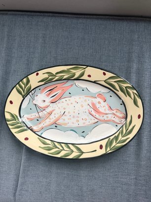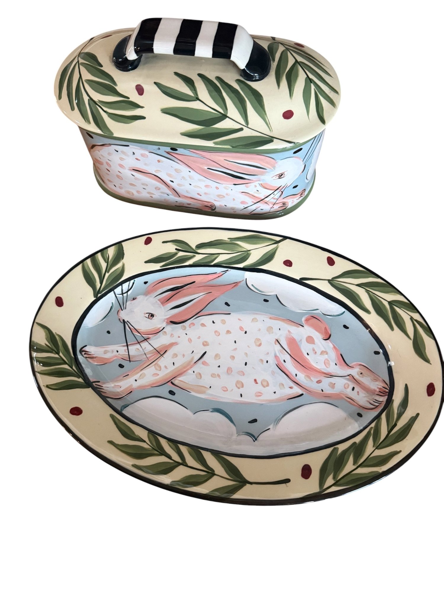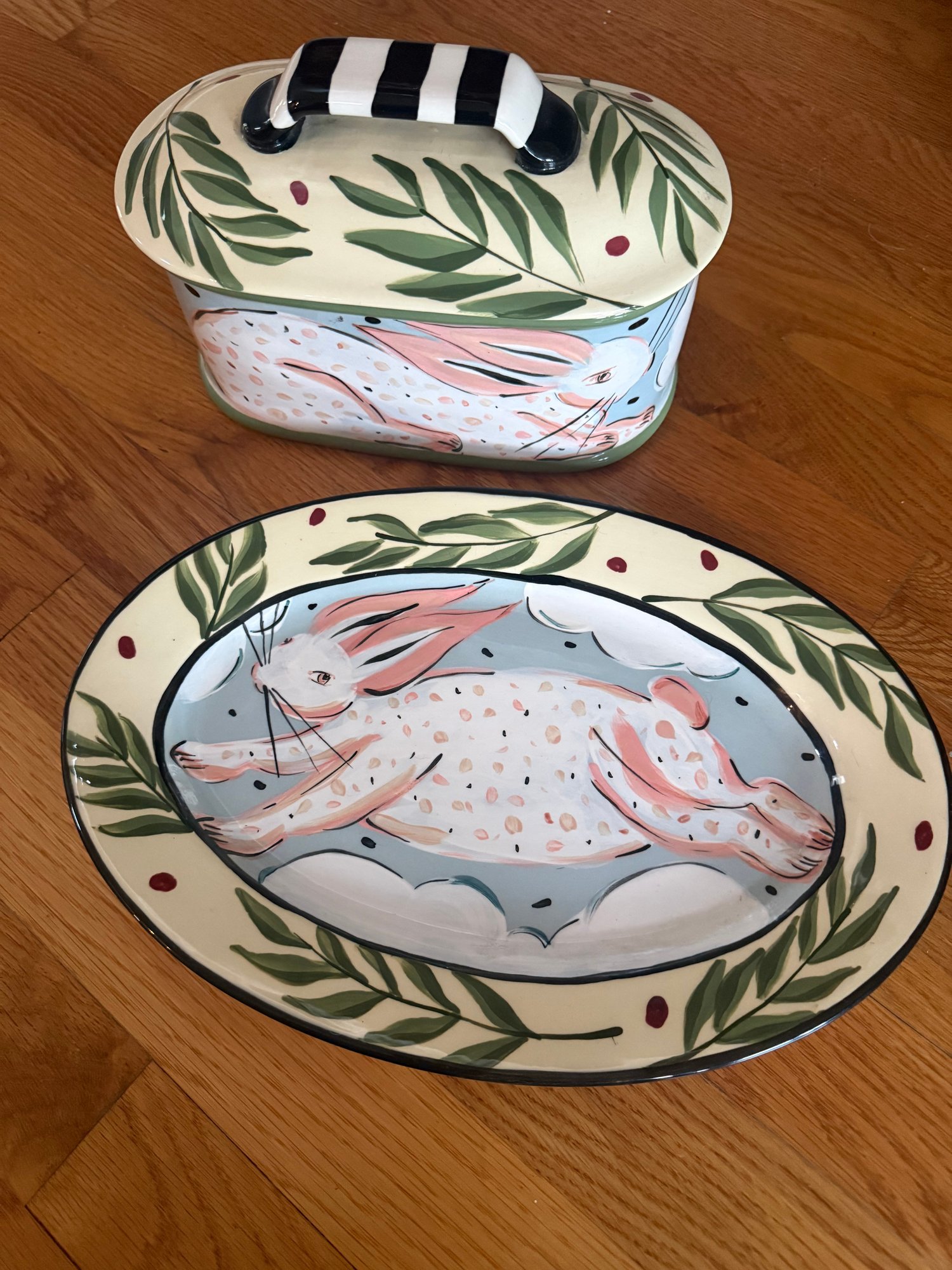 Sweet bunny Droll Designs platter and casserole in pinks, greens and greys. Platter is 13” x 9”. Casserole is 9”x5”x6”.