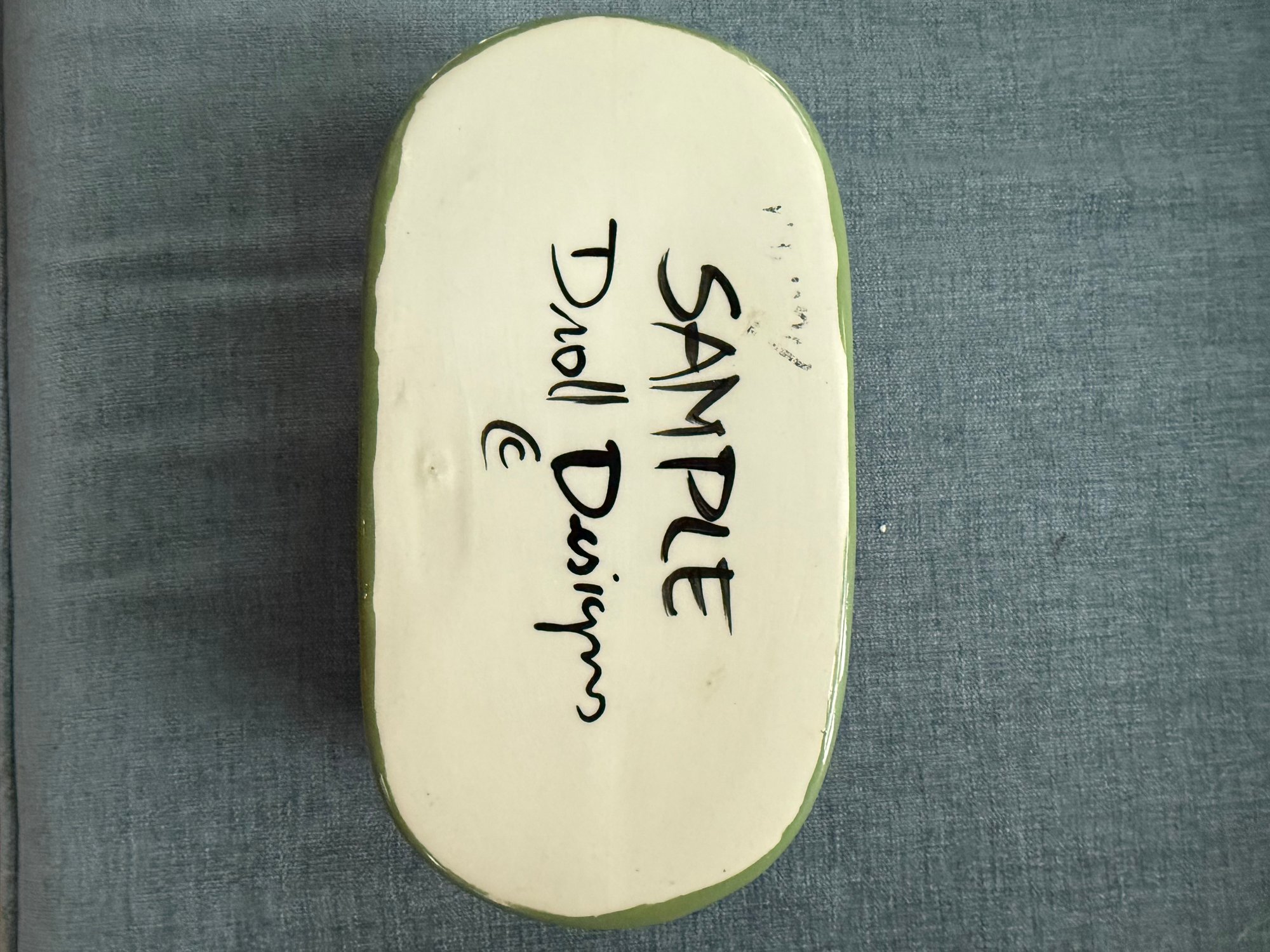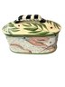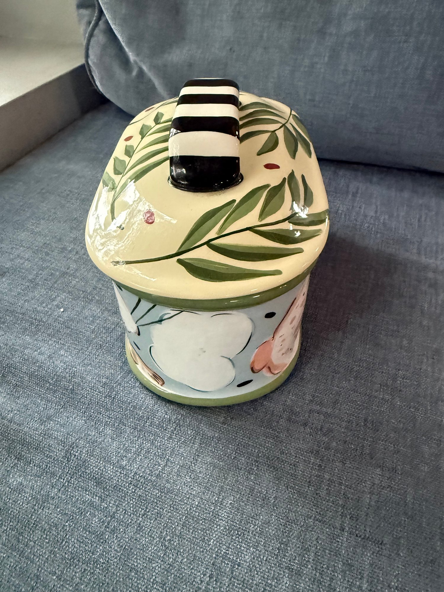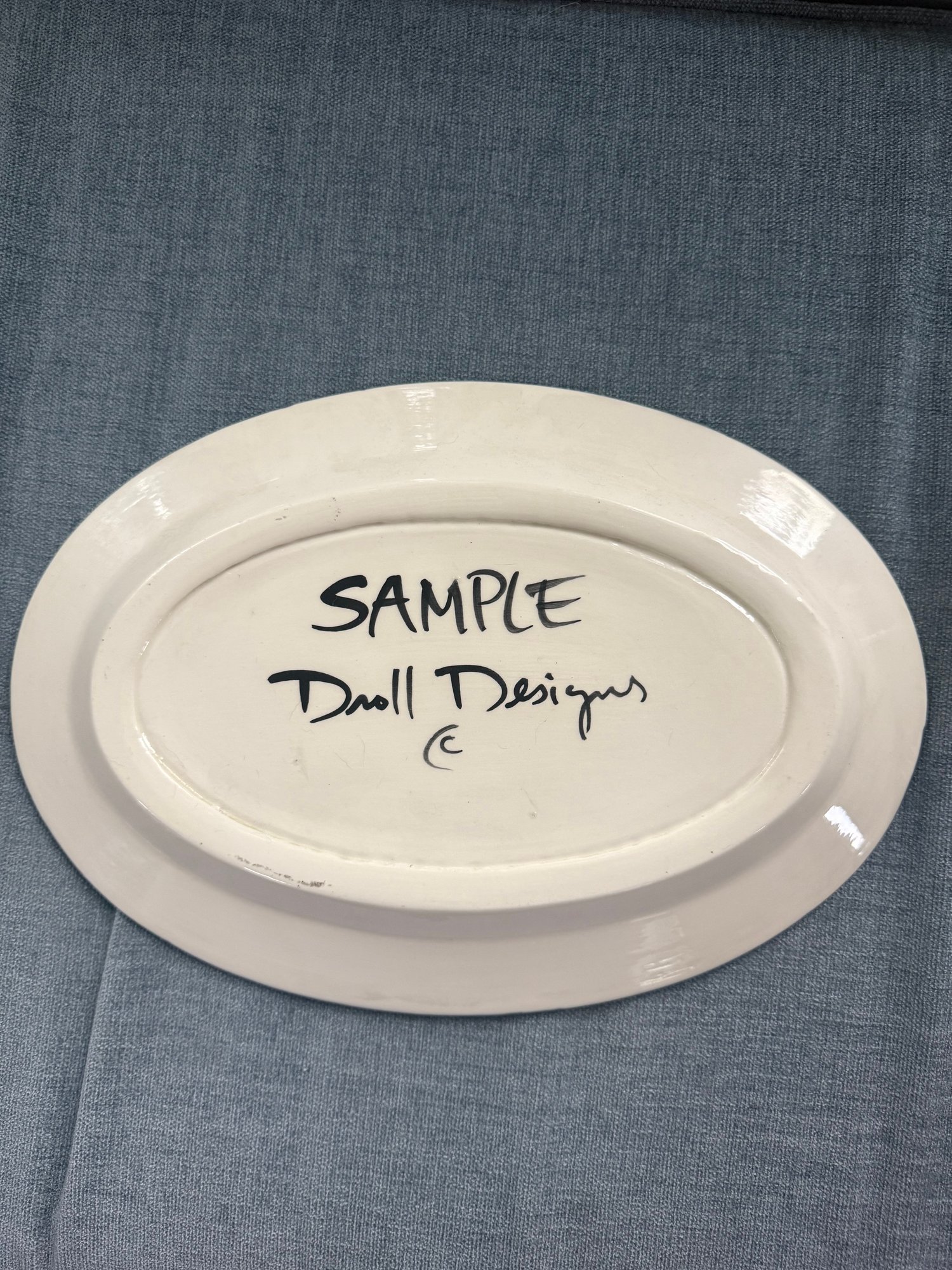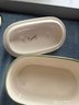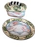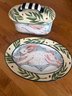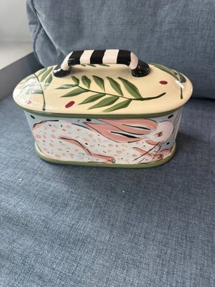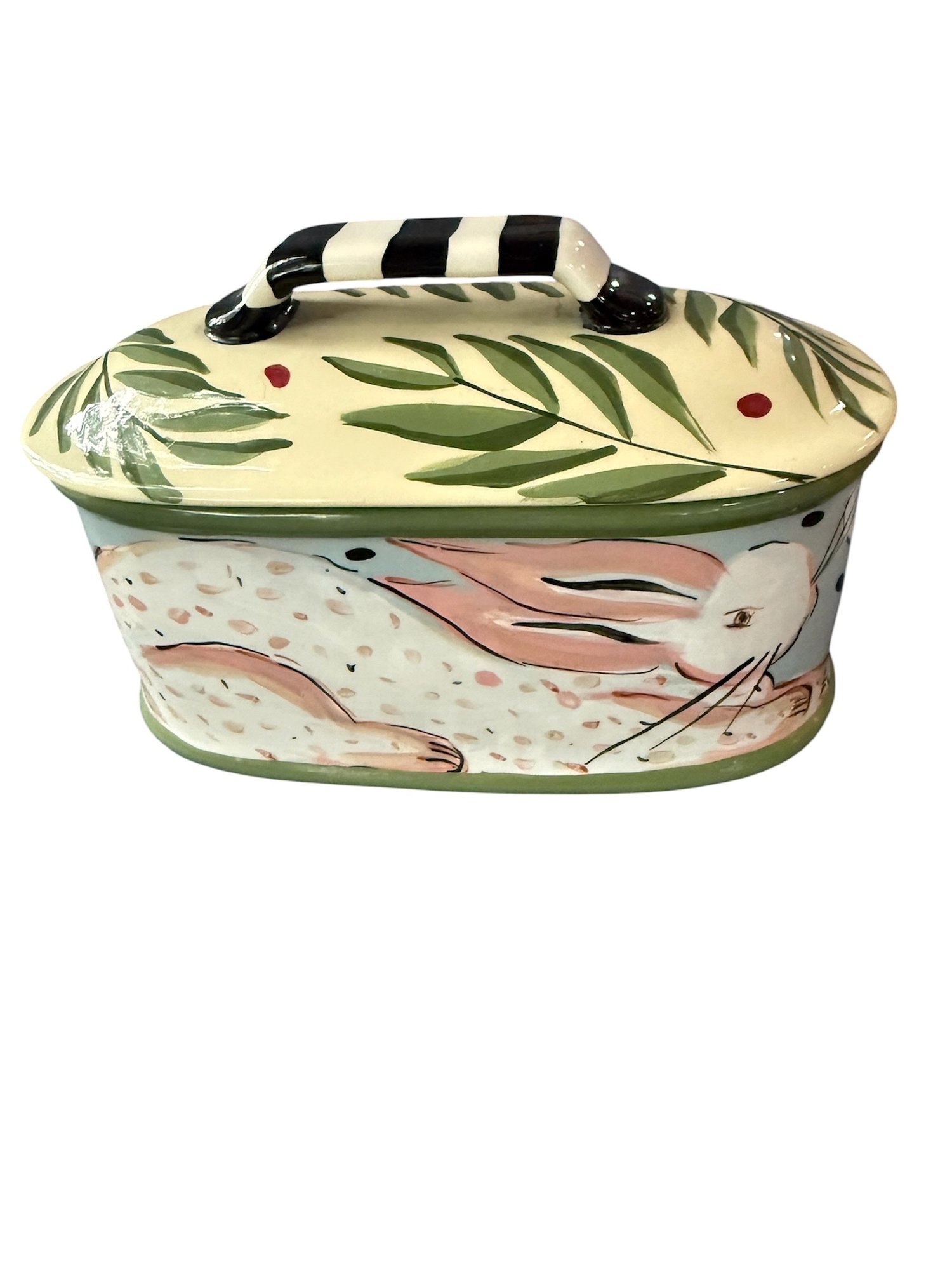 Sweet bunny Droll Designs platter and casserole in pinks, greens and greys. Platter is 13” x 9”. Casserole is 9”x5”x6”.