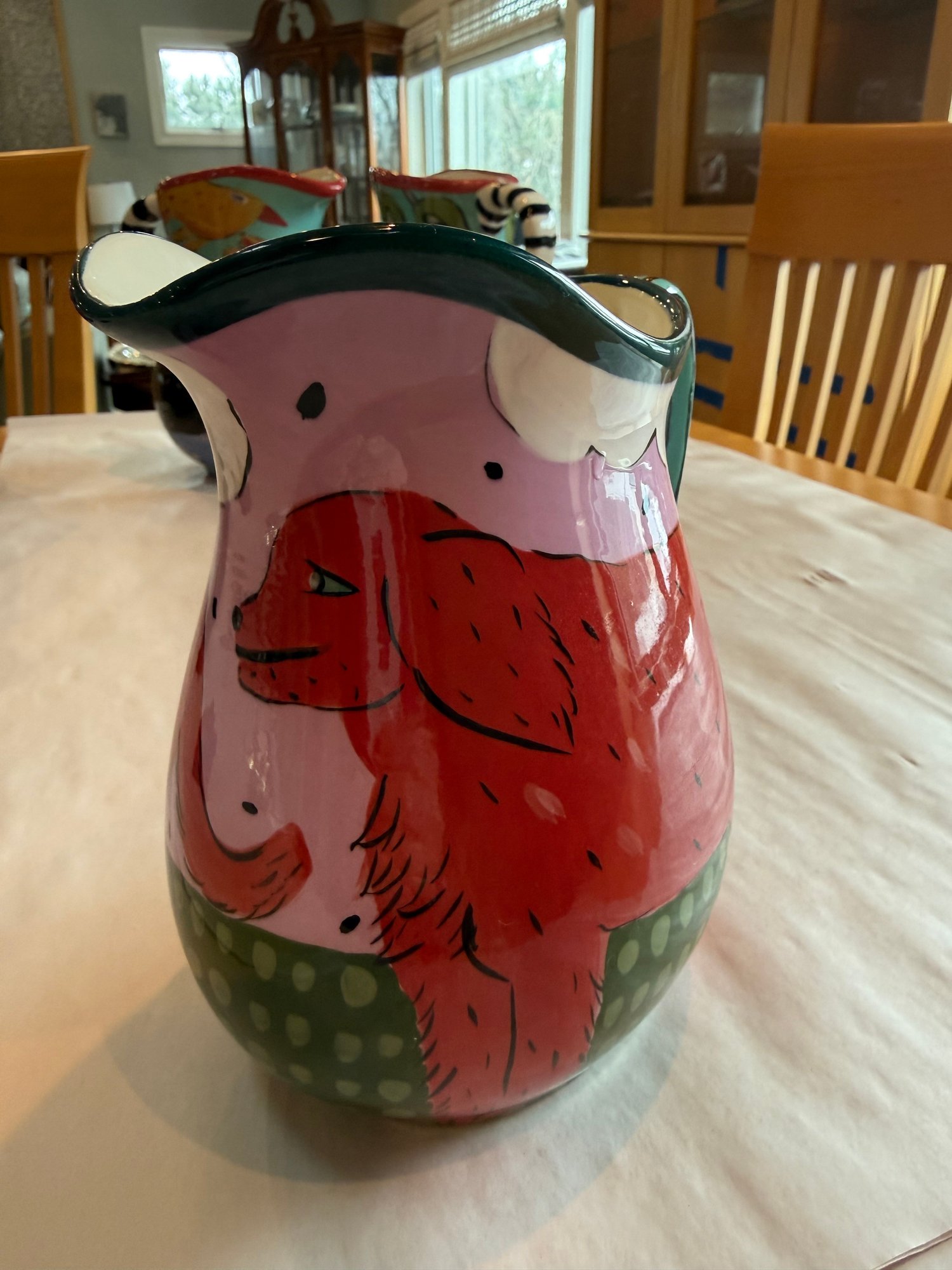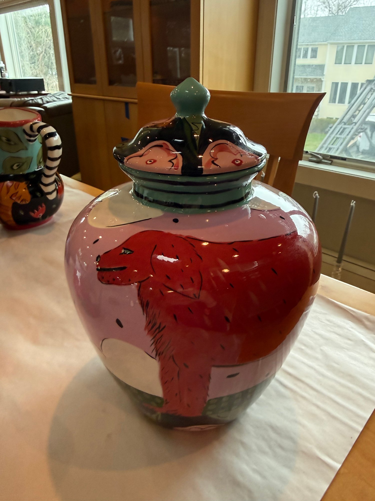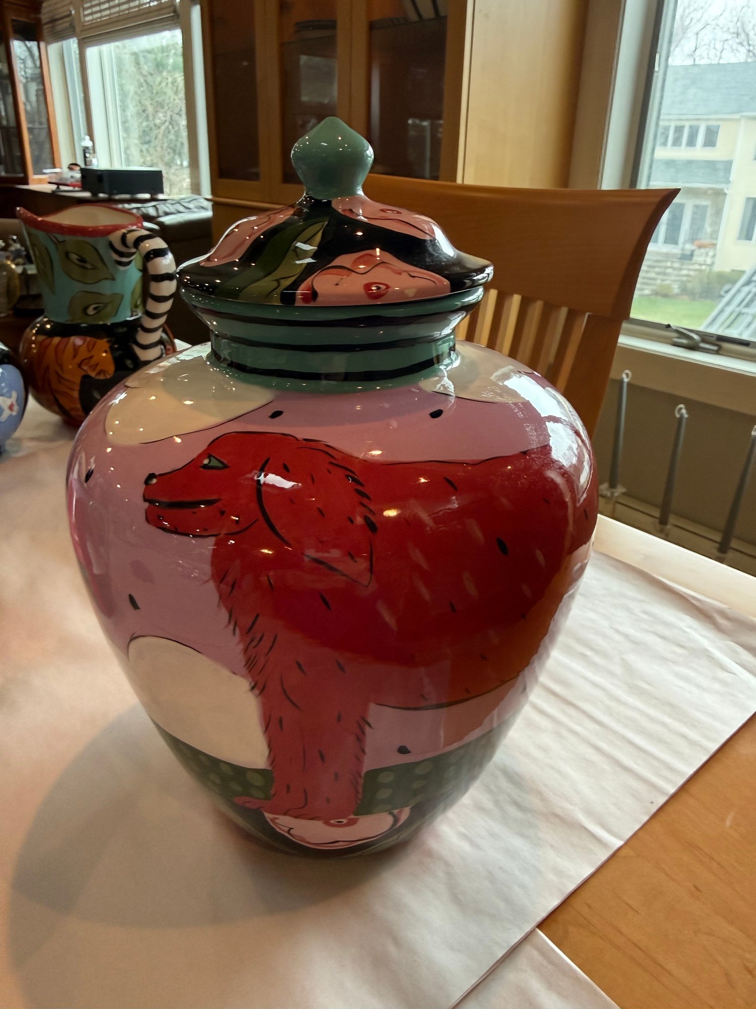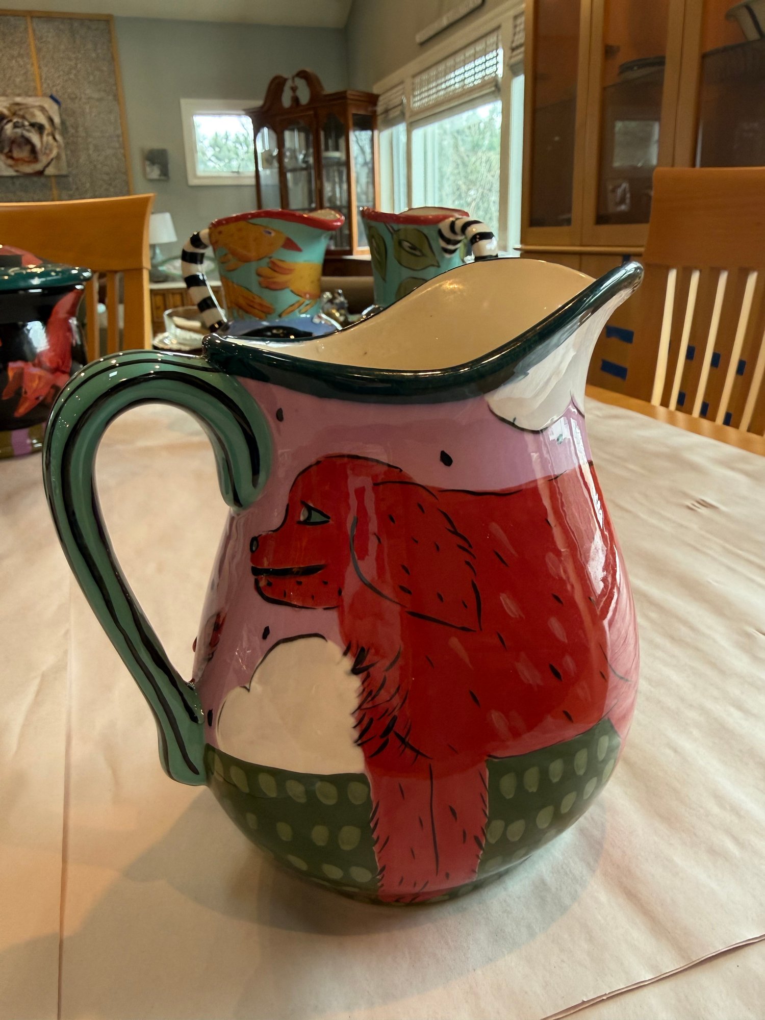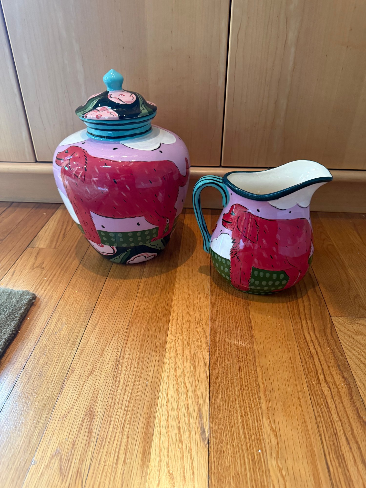 Droll ceramic vase and pitcher with a golden retriever motif. The vase with lid is 12”x 9” and the pitcher is 8”x 7”.