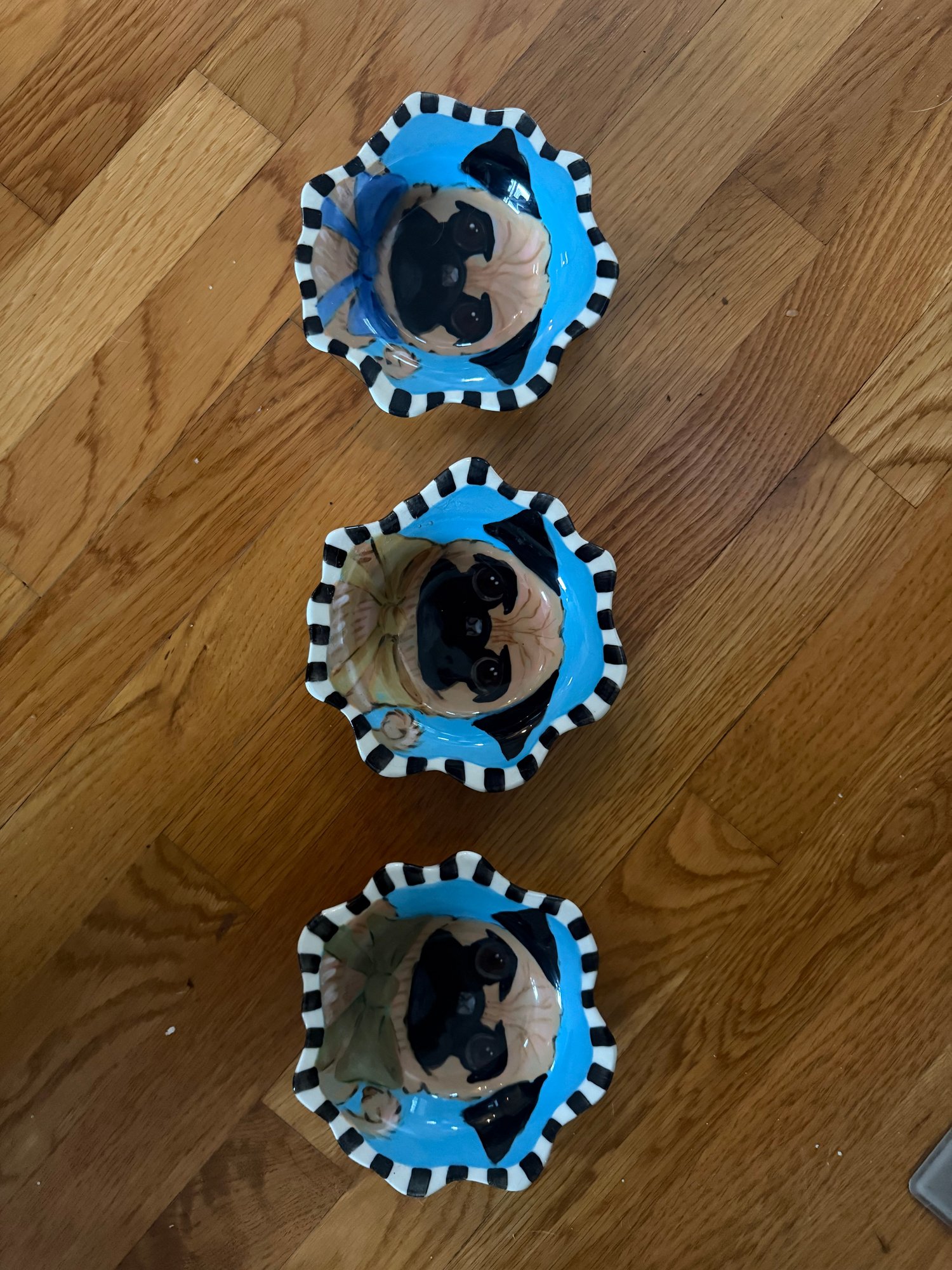 Sweet pug dog Droll bowls set of 3. 6” round.