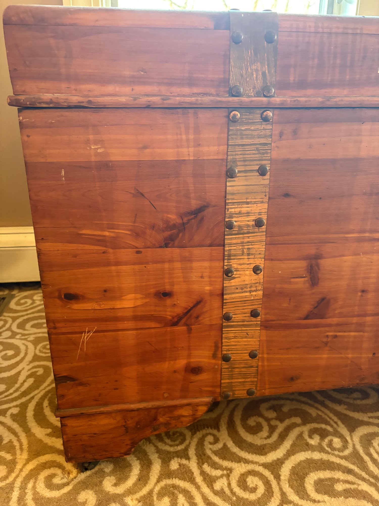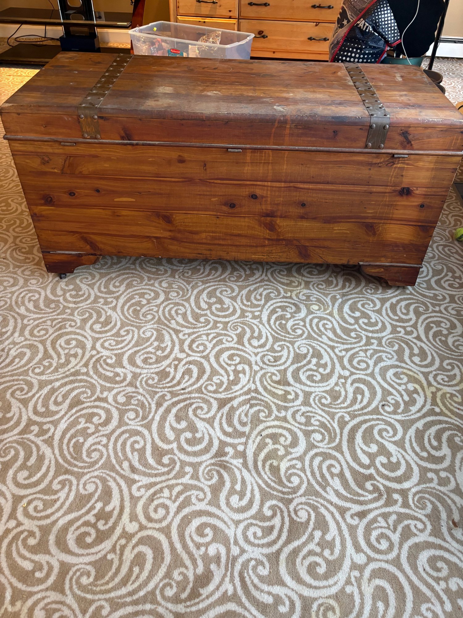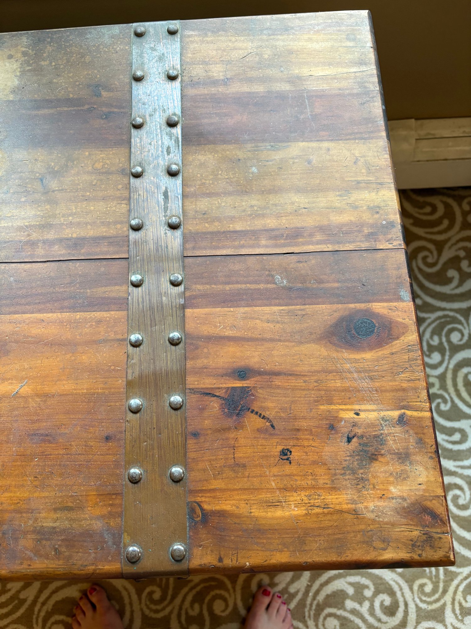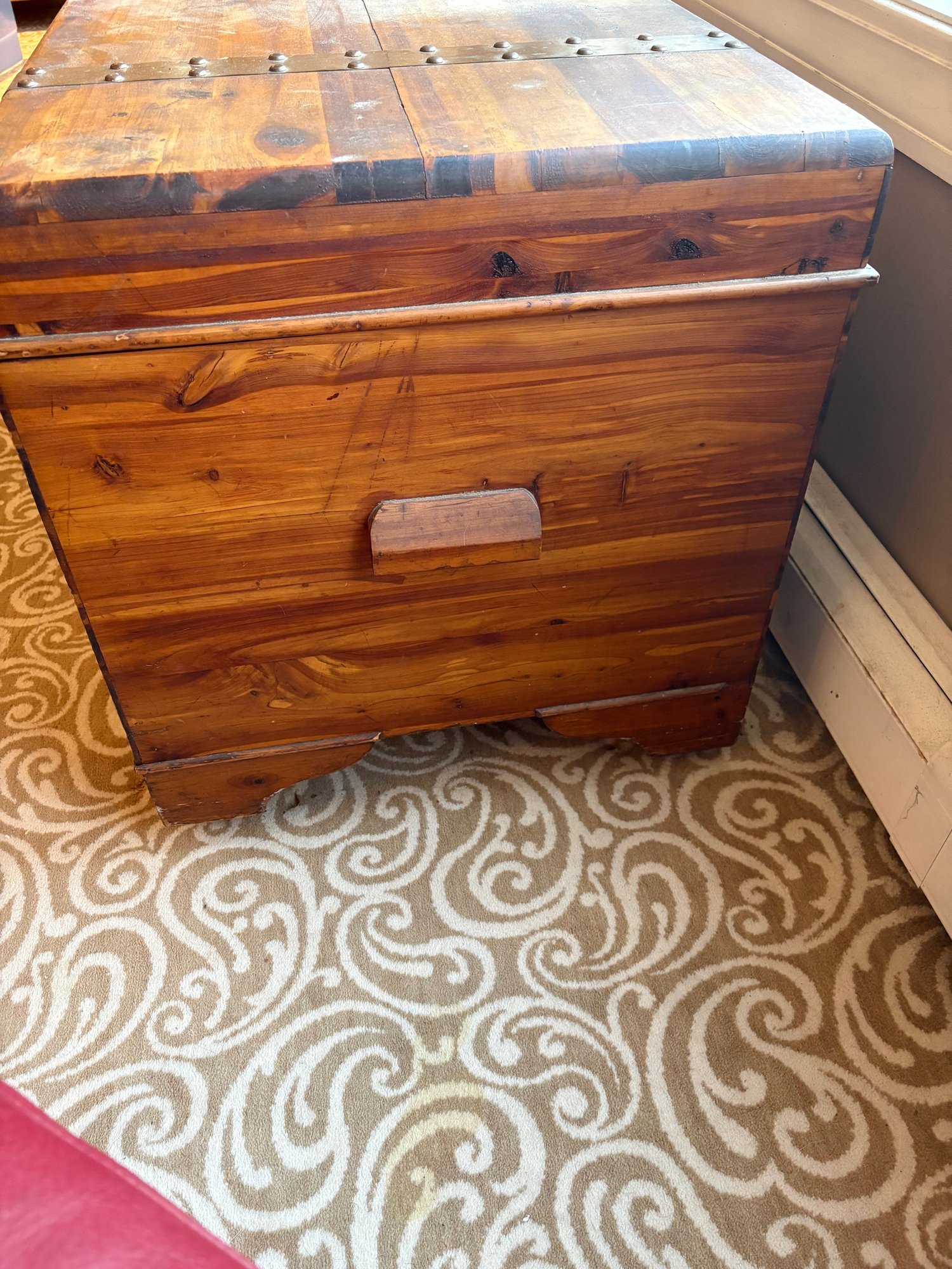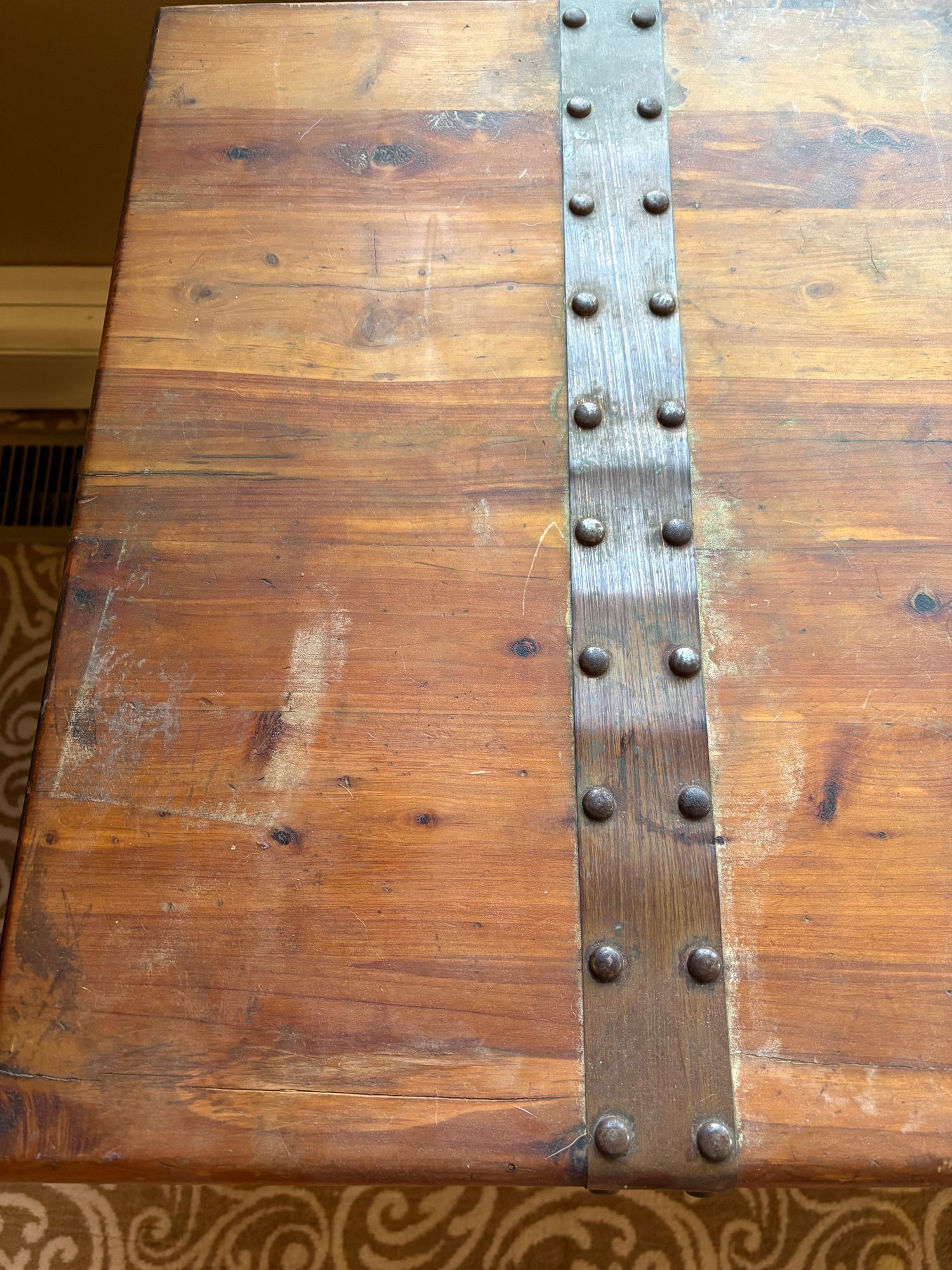 This is a pine trunk. I’m pretty good shape has metal detail it’s 49.5 x 21.5 x 24“ high.