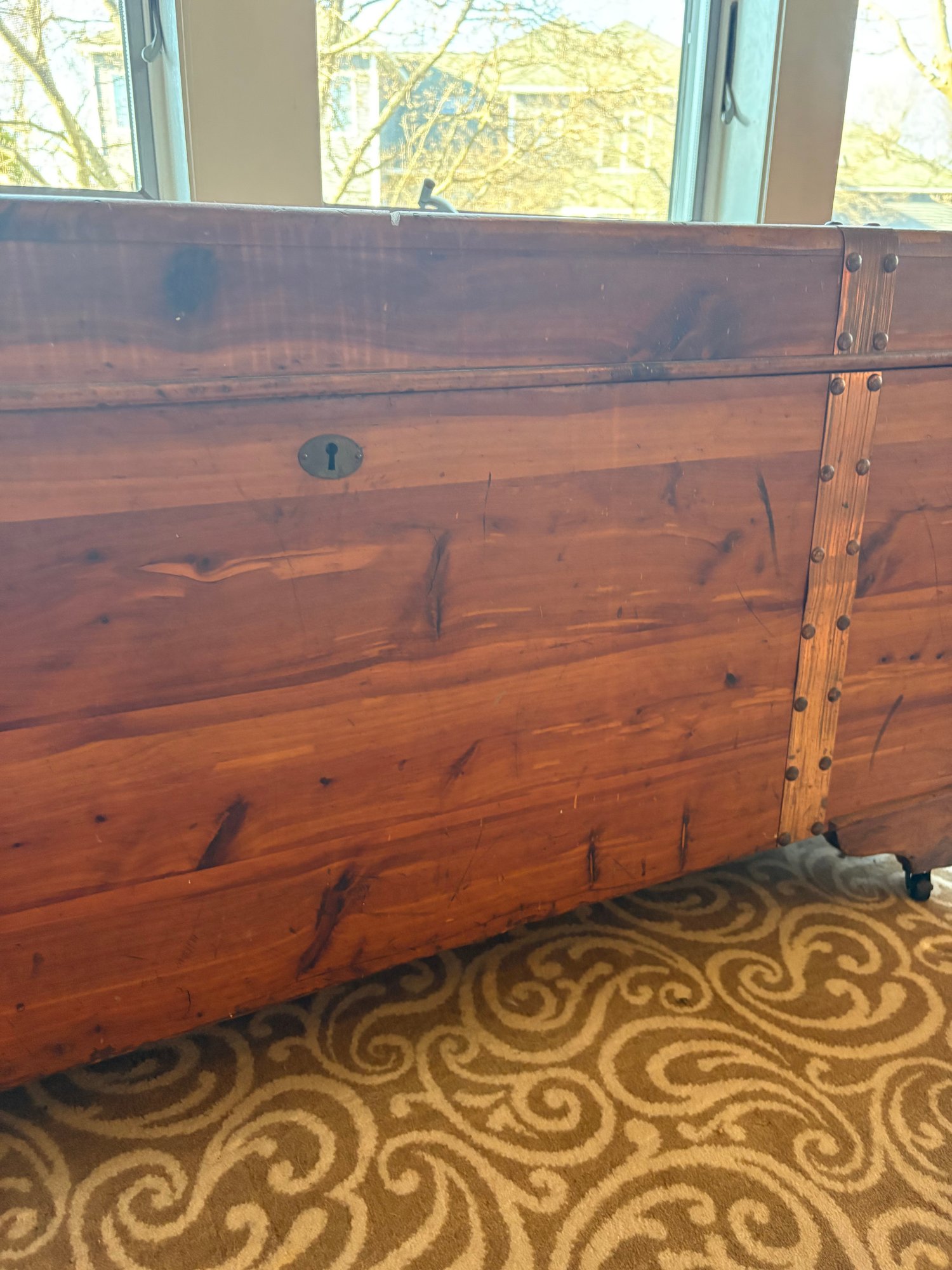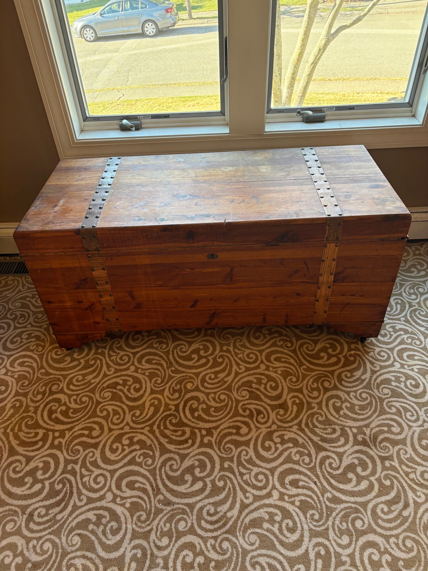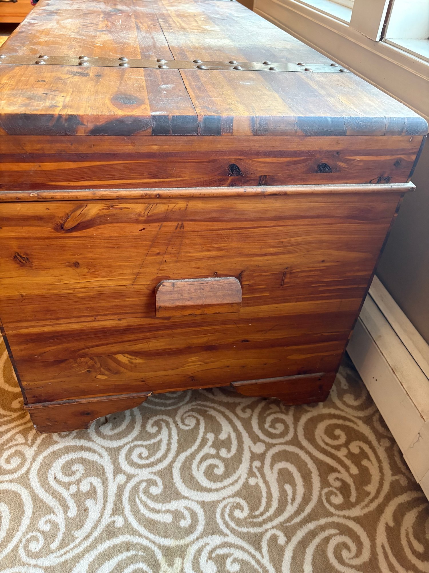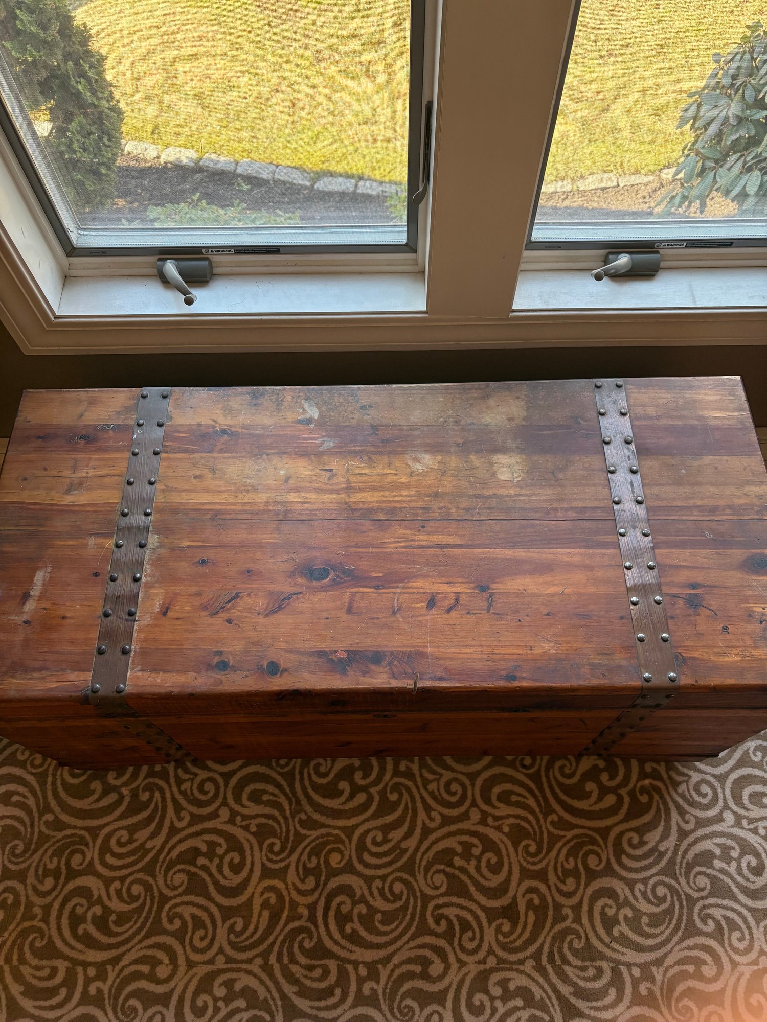 This is a pine trunk. I’m pretty good shape has metal detail it’s 49.5 x 21.5 x 24“ high.