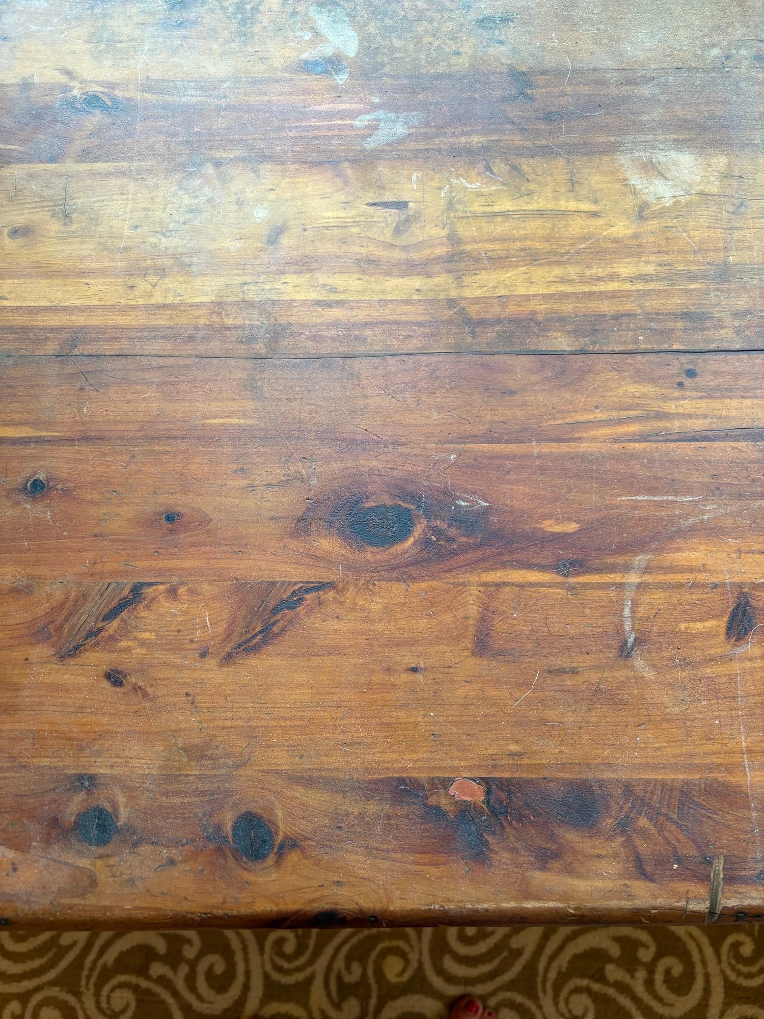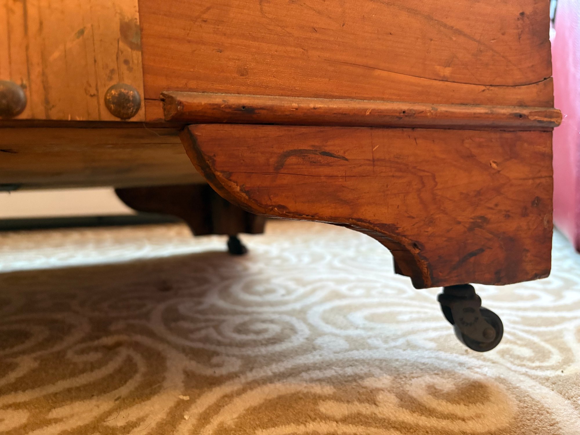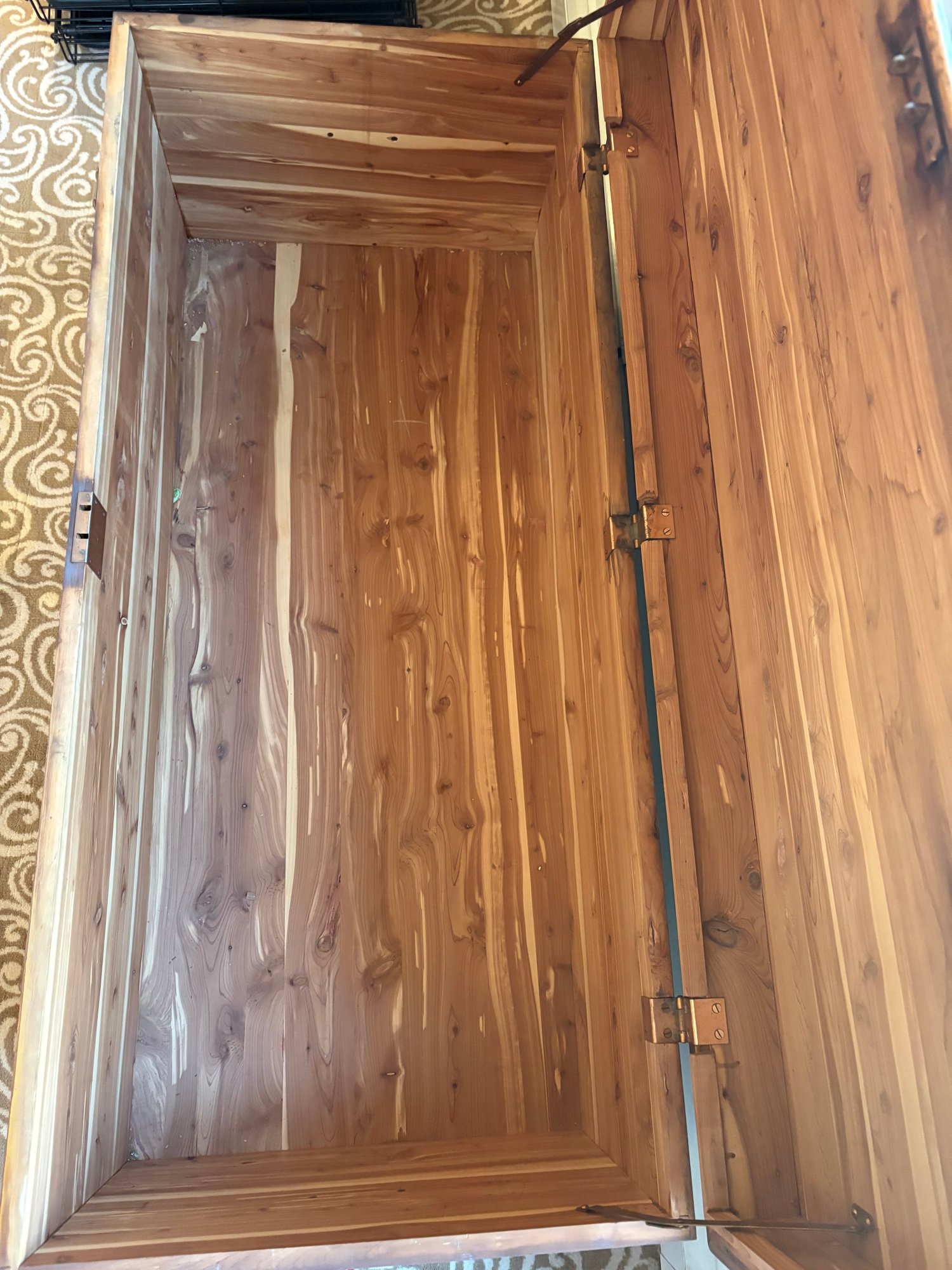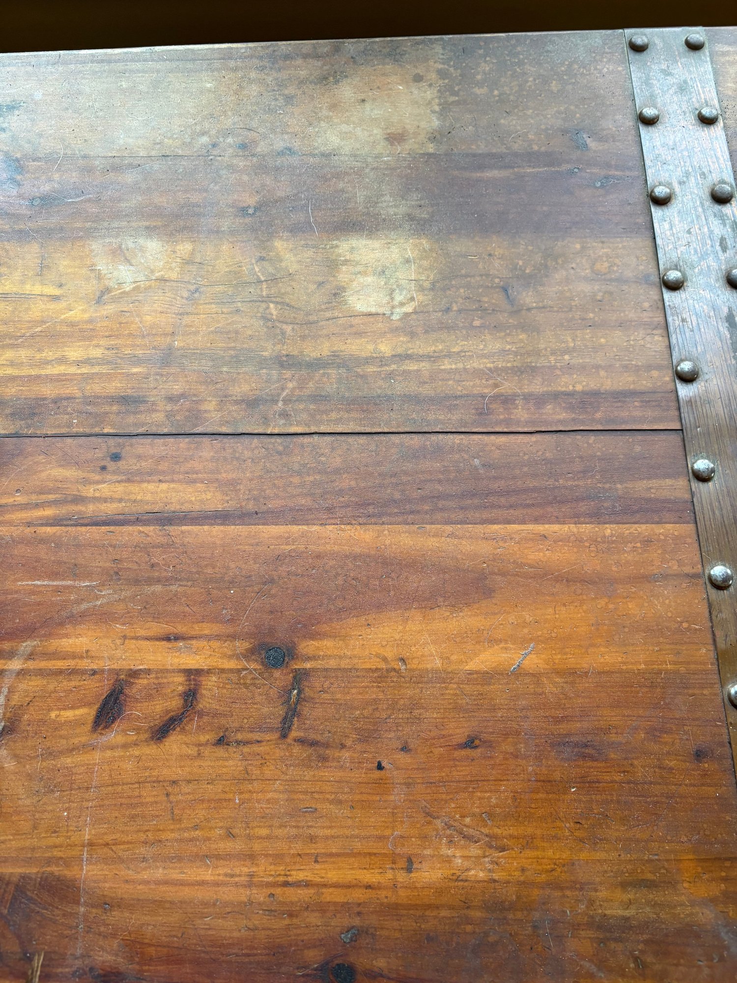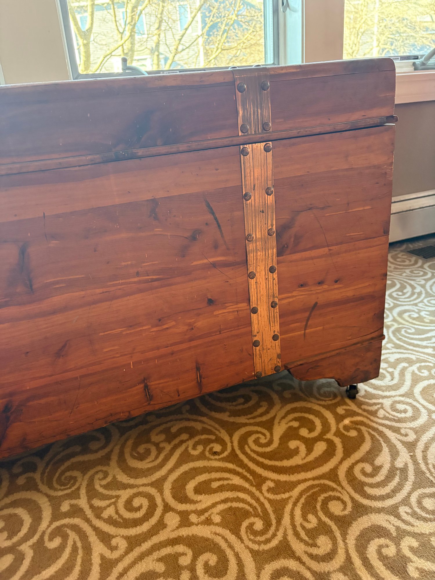 This is a pine trunk. I’m pretty good shape has metal detail it’s 49.5 x 21.5 x 24“ high.