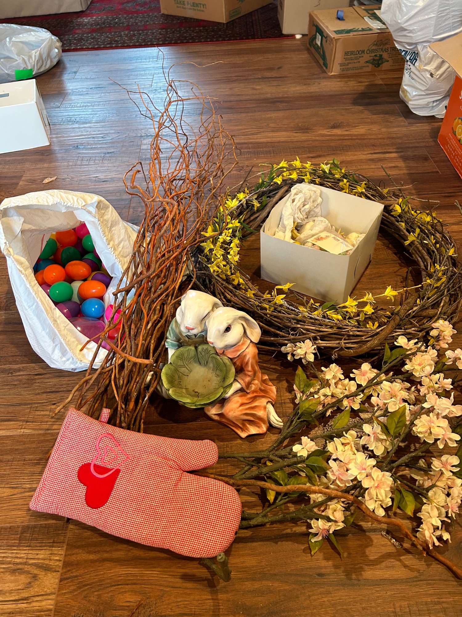 See pictures, all items are sold as is. Most are in very good condition, including bunny statue and porcelain Easter items, wreath is crackling slightly due to age.
