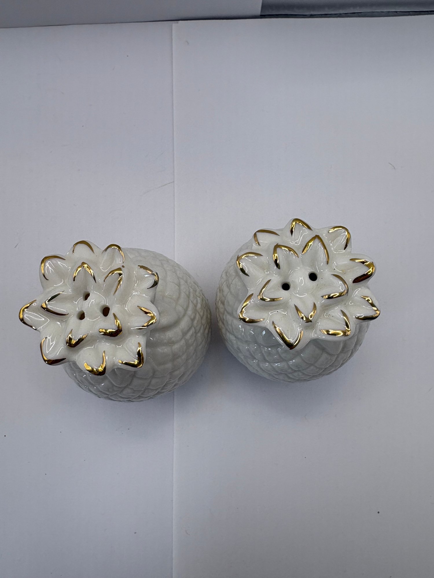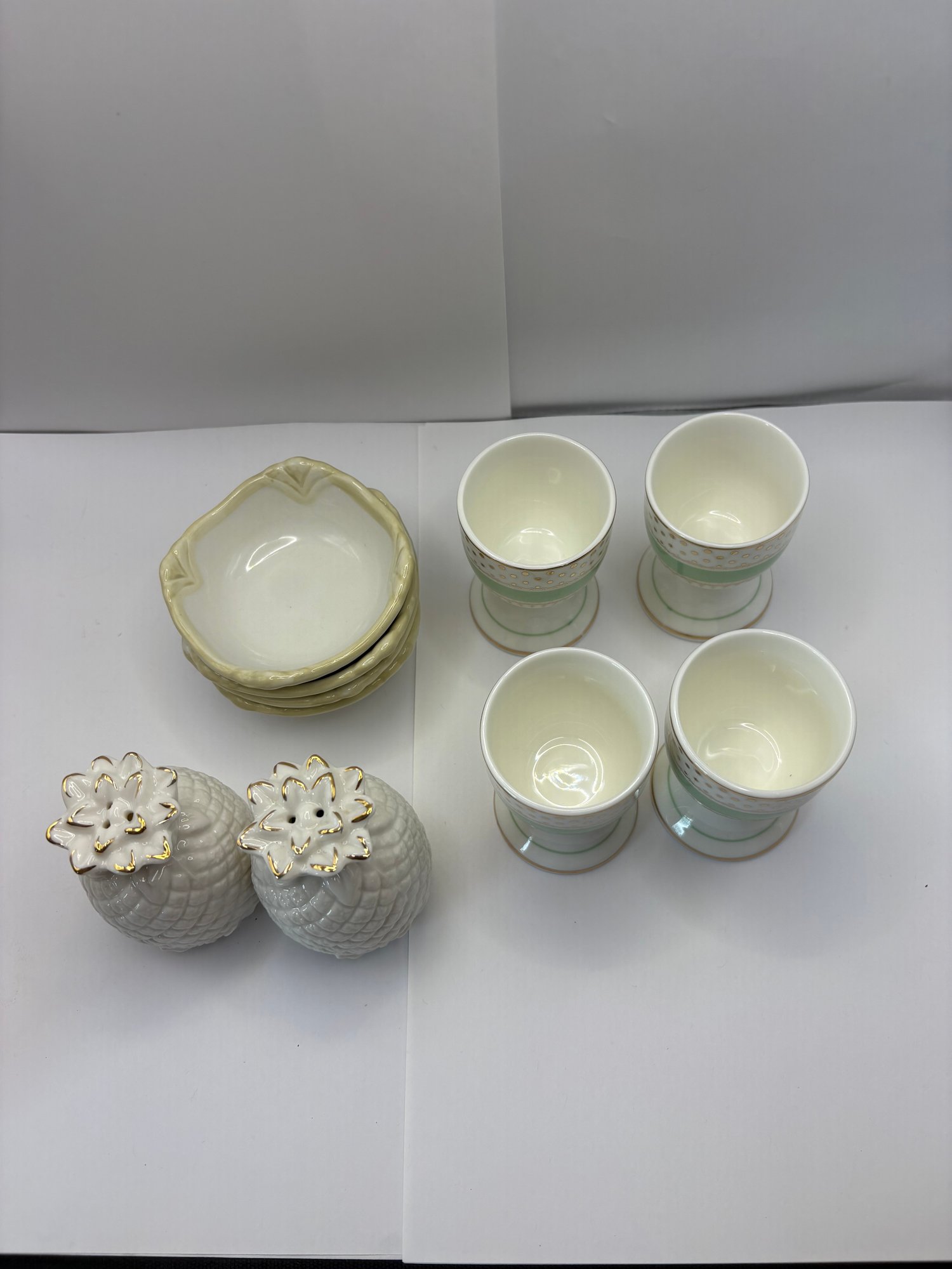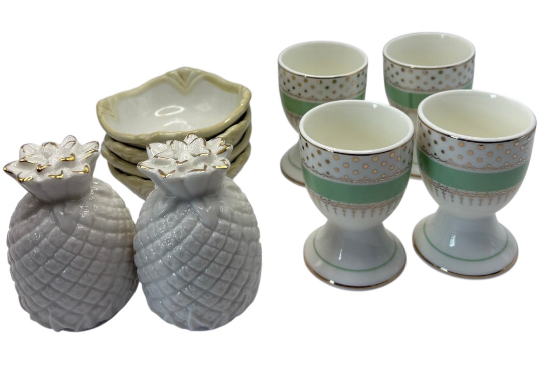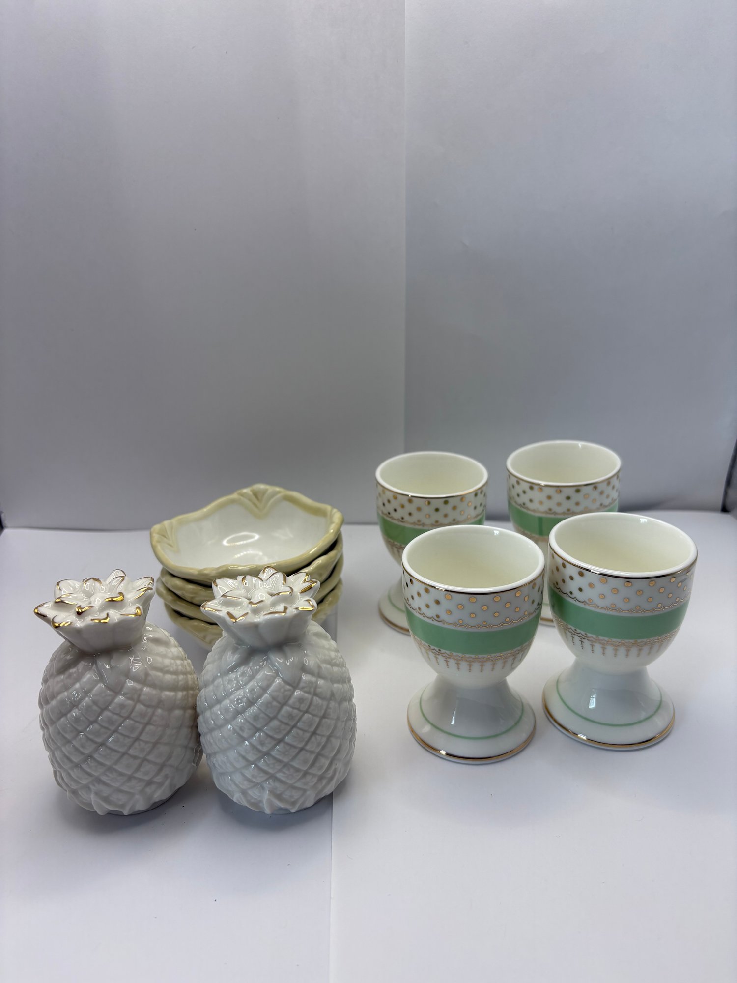 Everything is about 3 inches. There’s four egg cups with green and gold decor or paint for little ramekin bowls and pineapple salt and pepper. Shakers.
