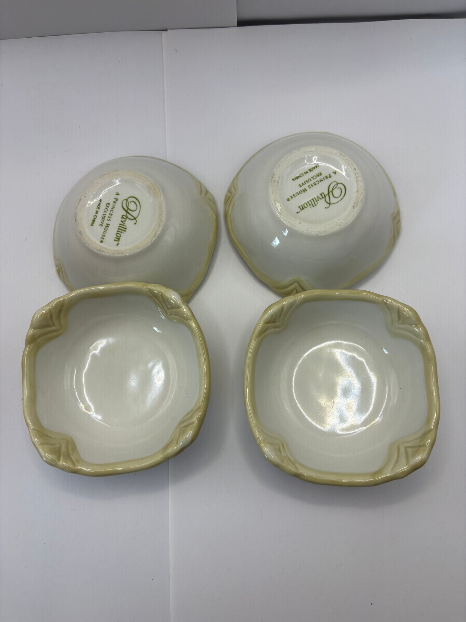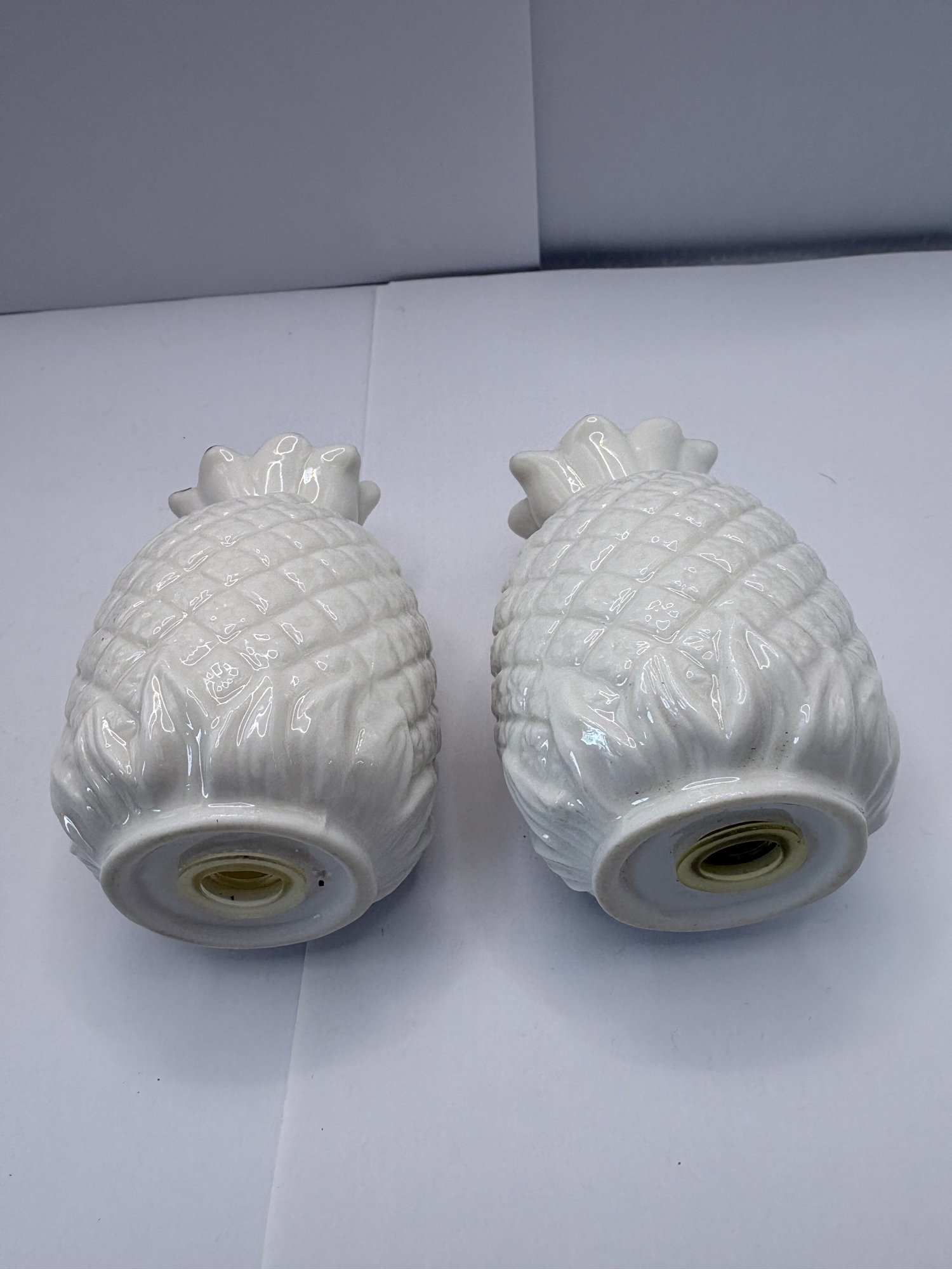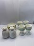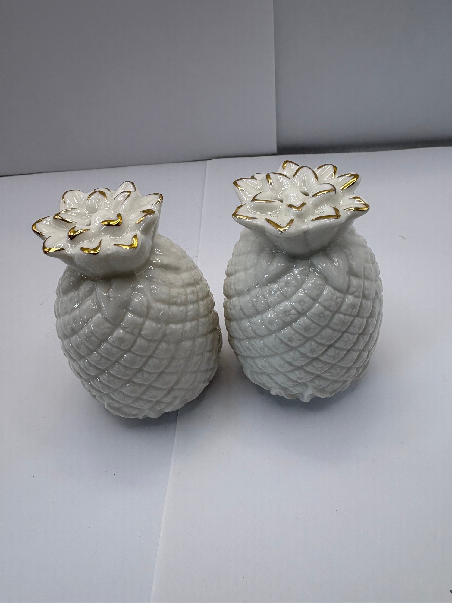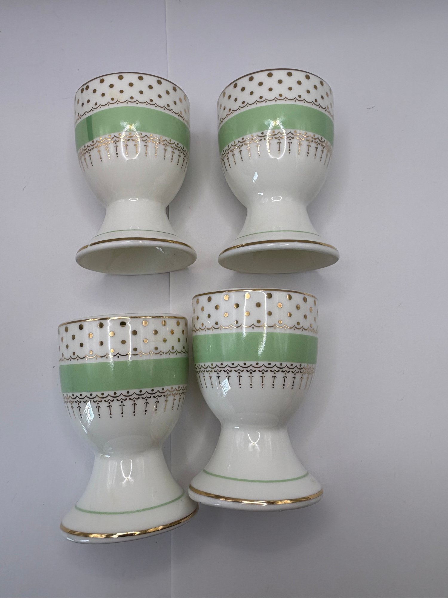 Everything is about 3 inches. There’s four egg cups with green and gold decor or paint for little ramekin bowls and pineapple salt and pepper. Shakers.