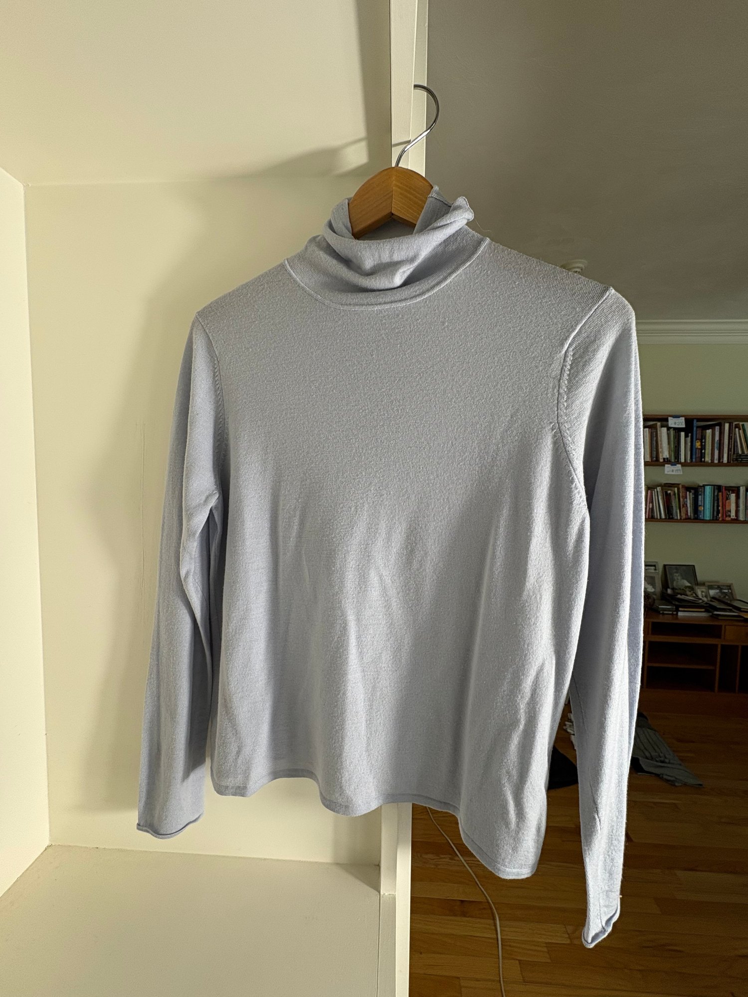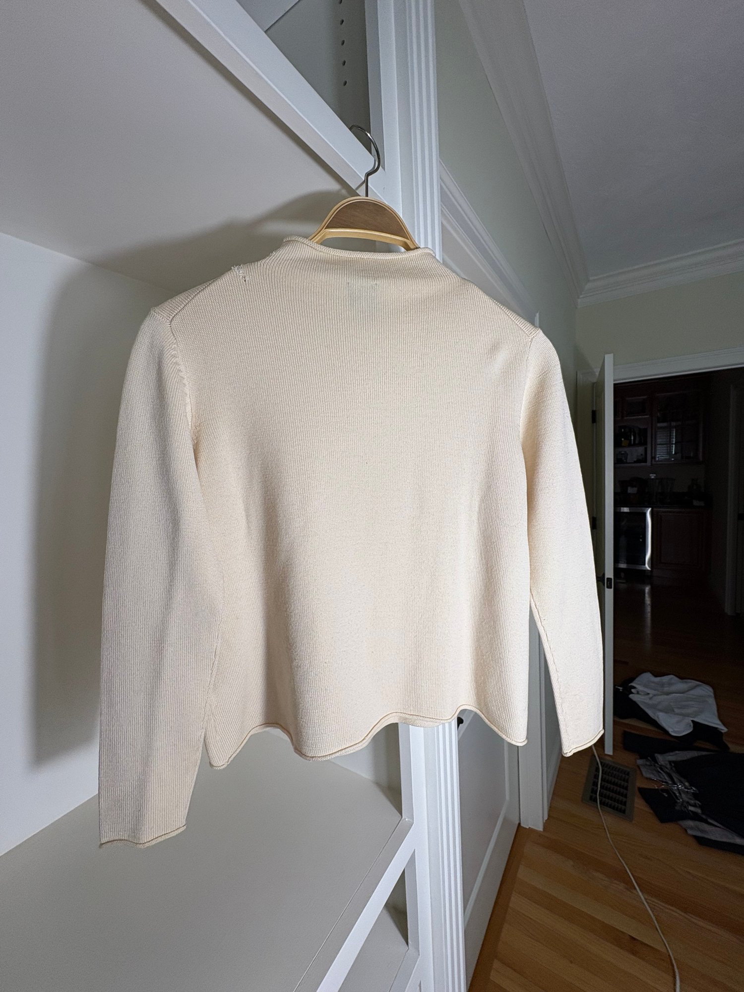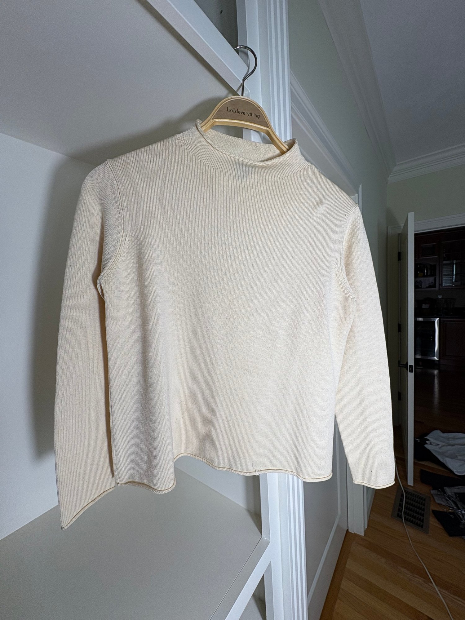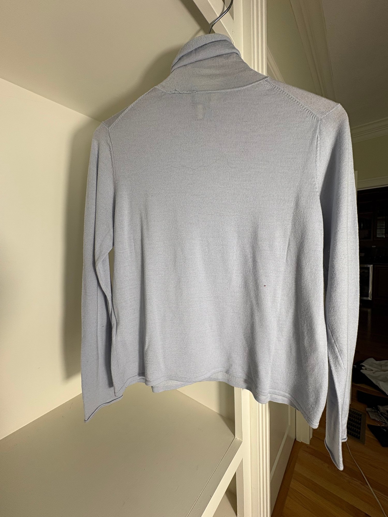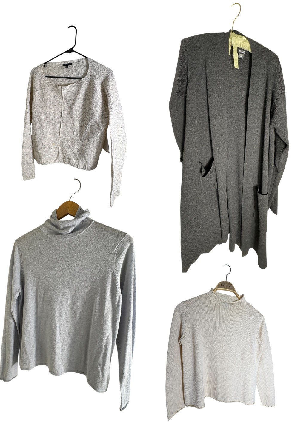 Black sweater size women’s medium. Blue sweater women’s size large. Yellow sweater size small. White sweater size small