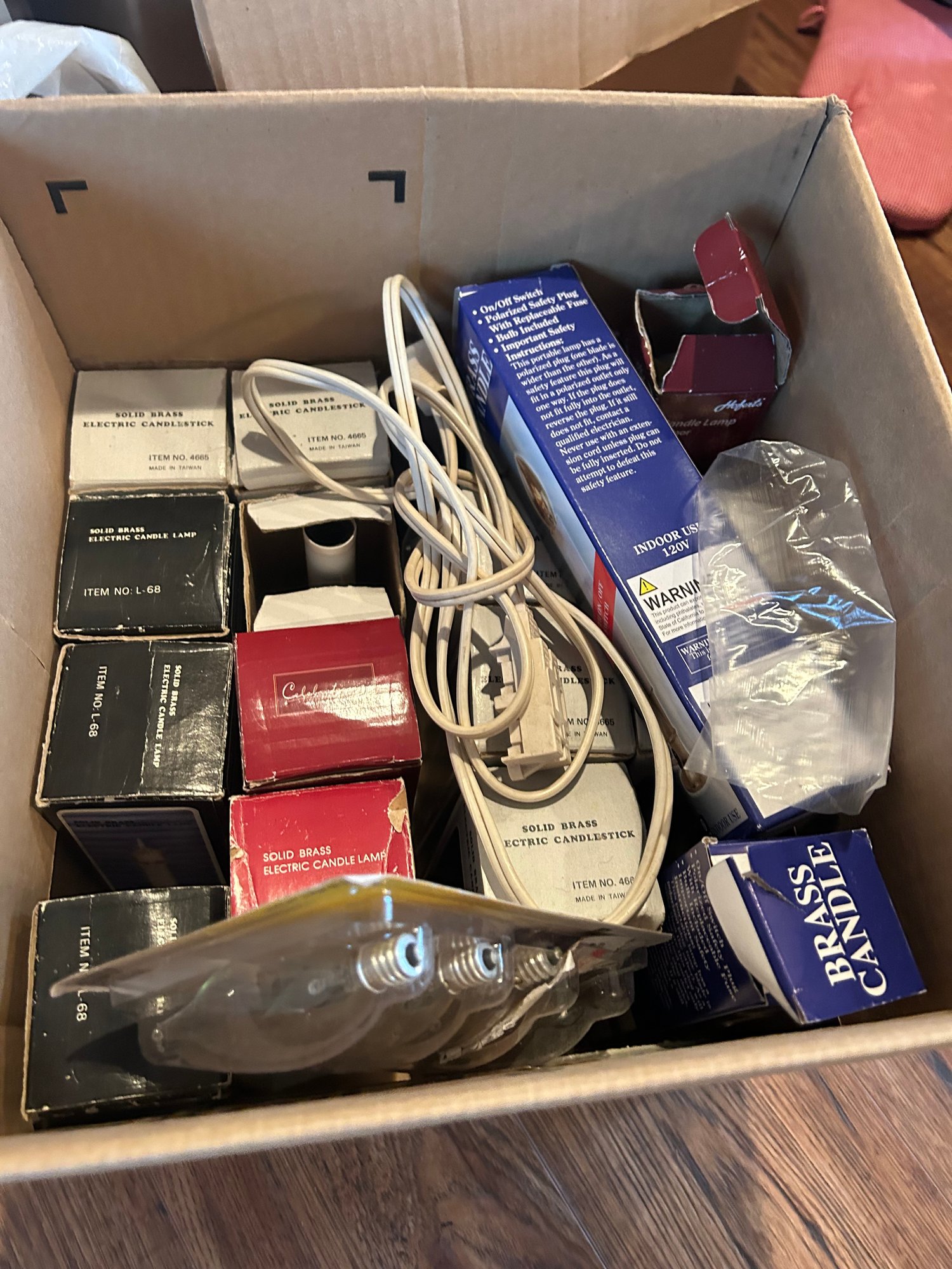 Box of Christmas electric candles, bulbs and extension cord