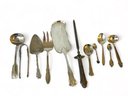 Assorted spoons and serving pieces . Some of the pieces are labeled, see photos. The handle is weighted and the knife sharpener is monogrammed with an H, no other mark was found on it.