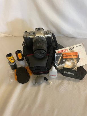 Pentax ZX-M 35 mm camera w/ case, 2 rolls of Jodak film, lense covers, lense cleaning items, instruction booklet