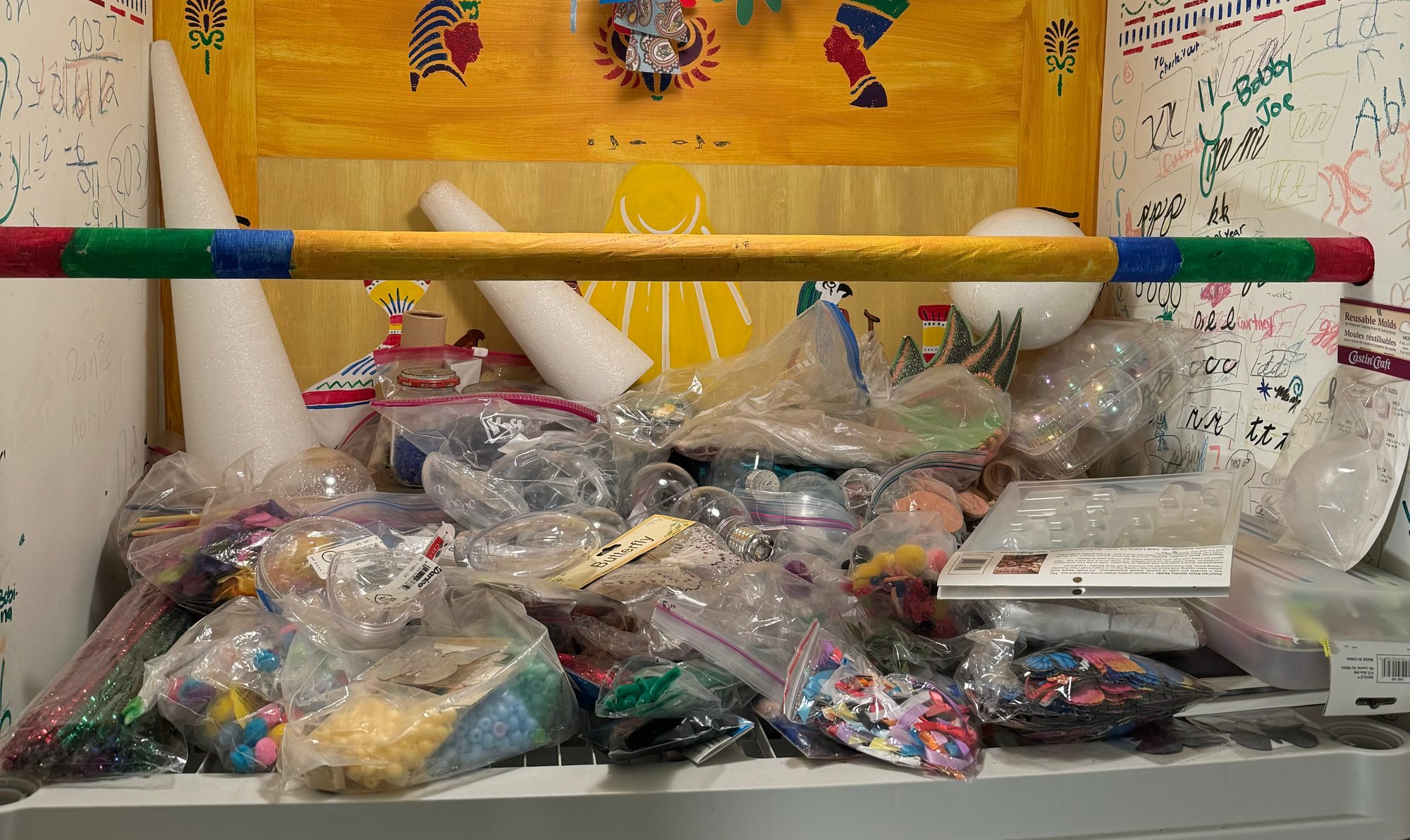 include everything on the top shelf located in the arts & crafts closet in the basement
