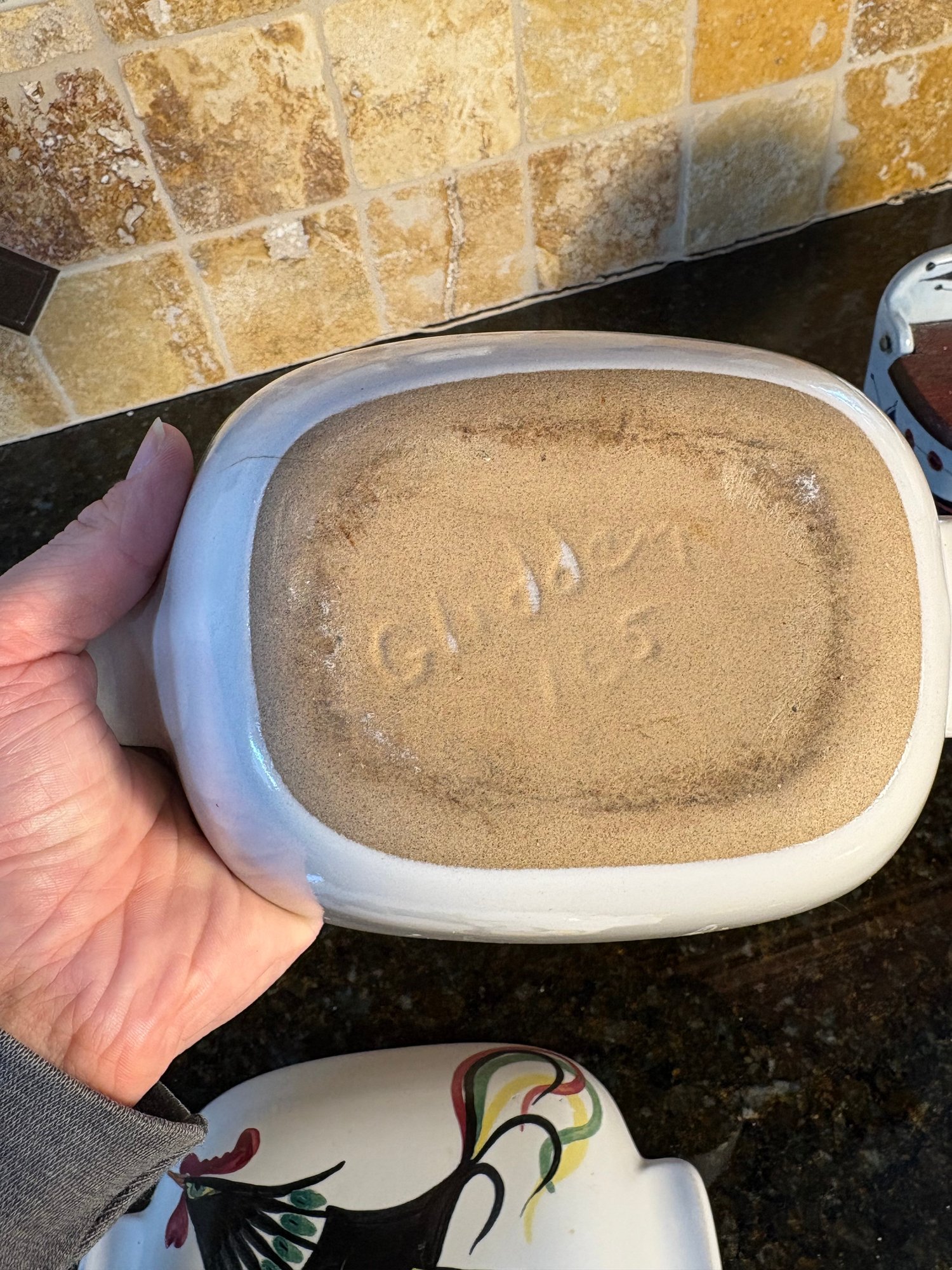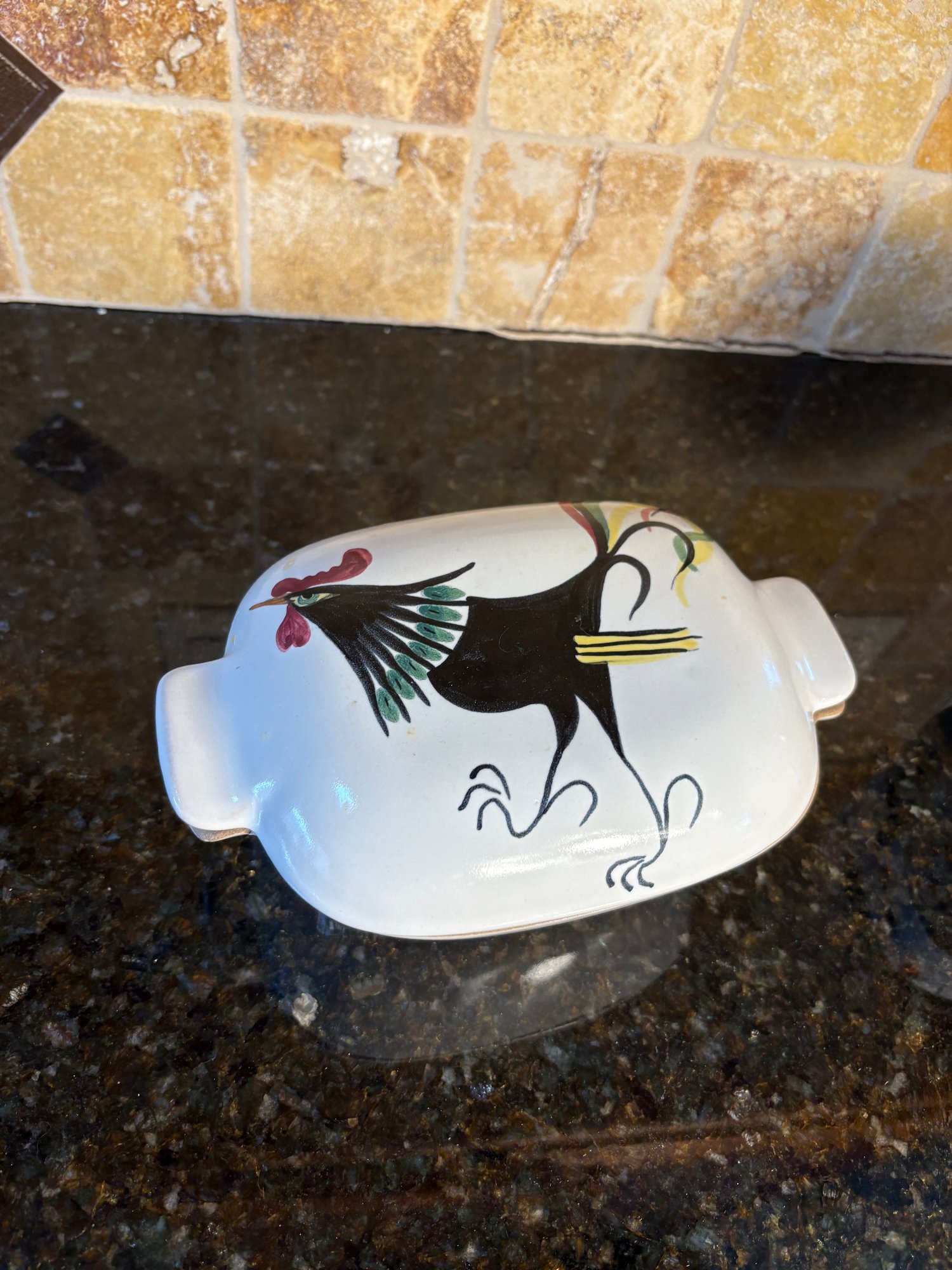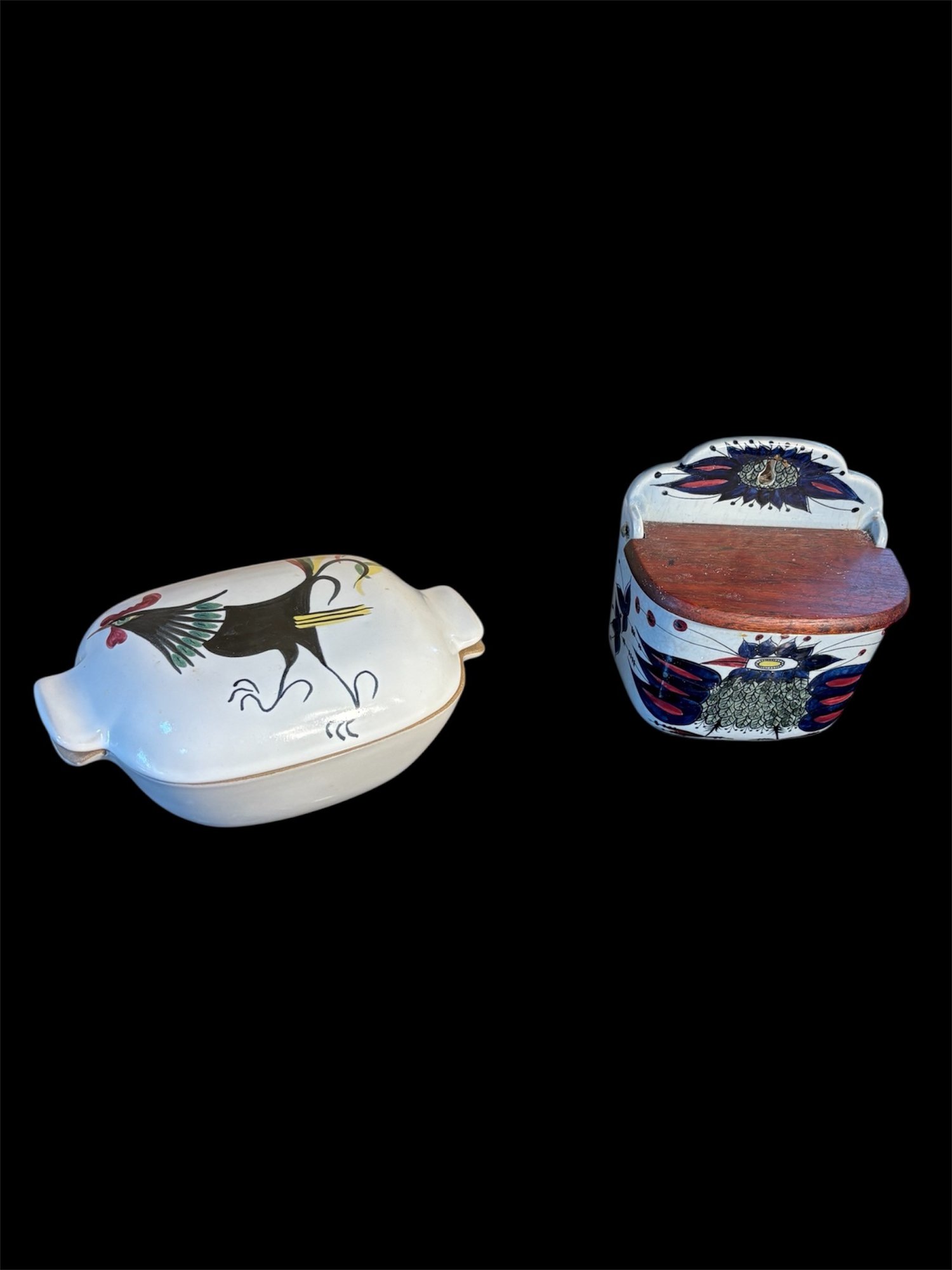 Dimensions salt holder approximately 6.5 by 5.5 inches long. Hand painted roster art dimensions approximately 2.75 inches tall