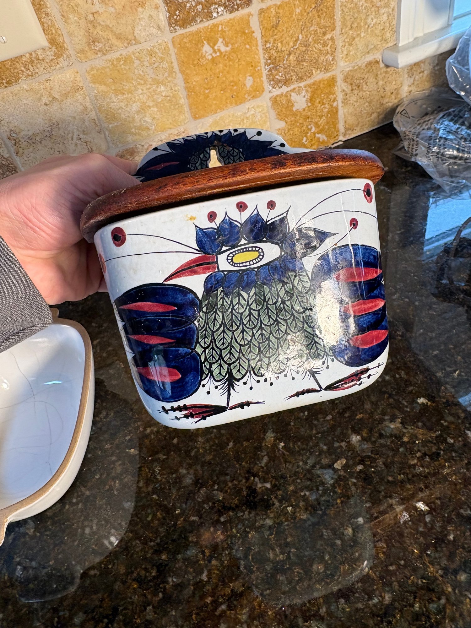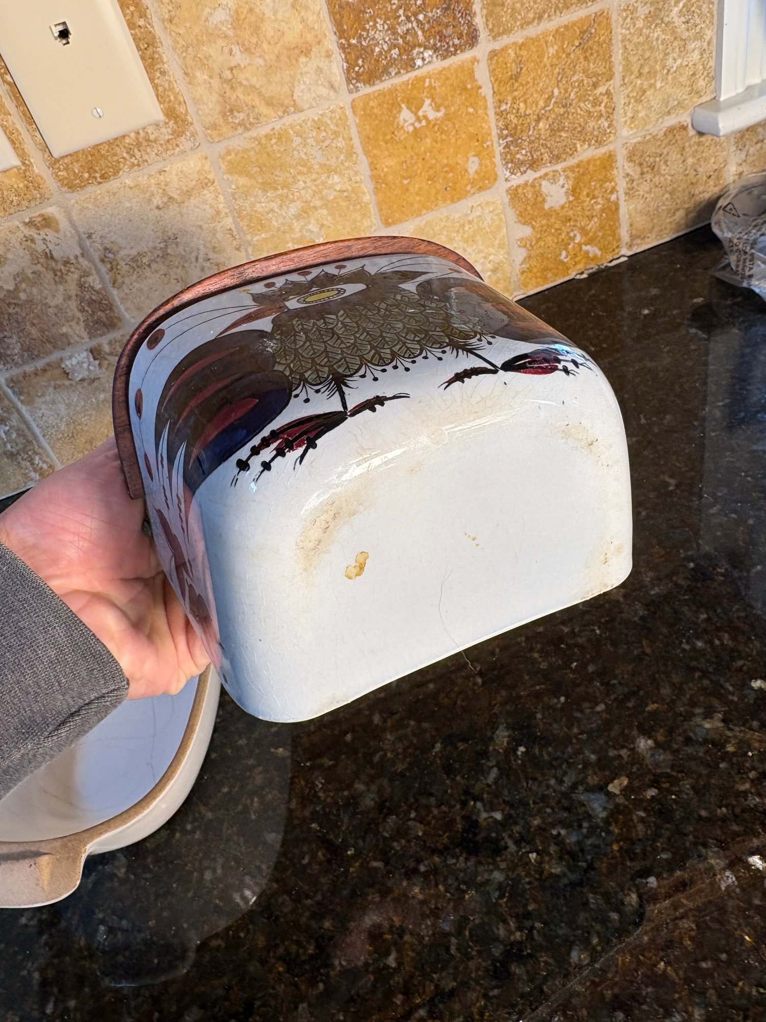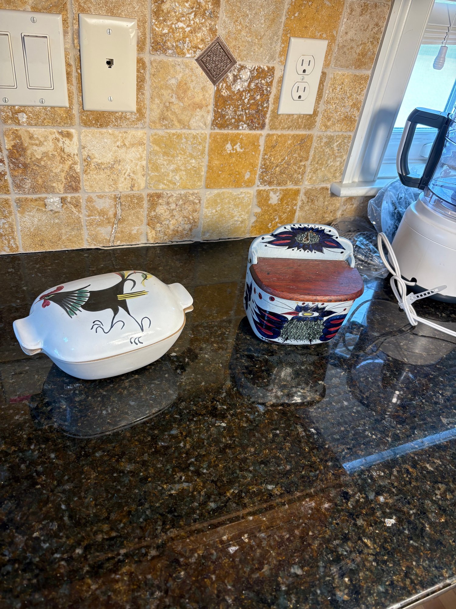 Dimensions salt holder approximately 6.5 by 5.5 inches long. Hand painted roster art dimensions approximately 2.75 inches tall