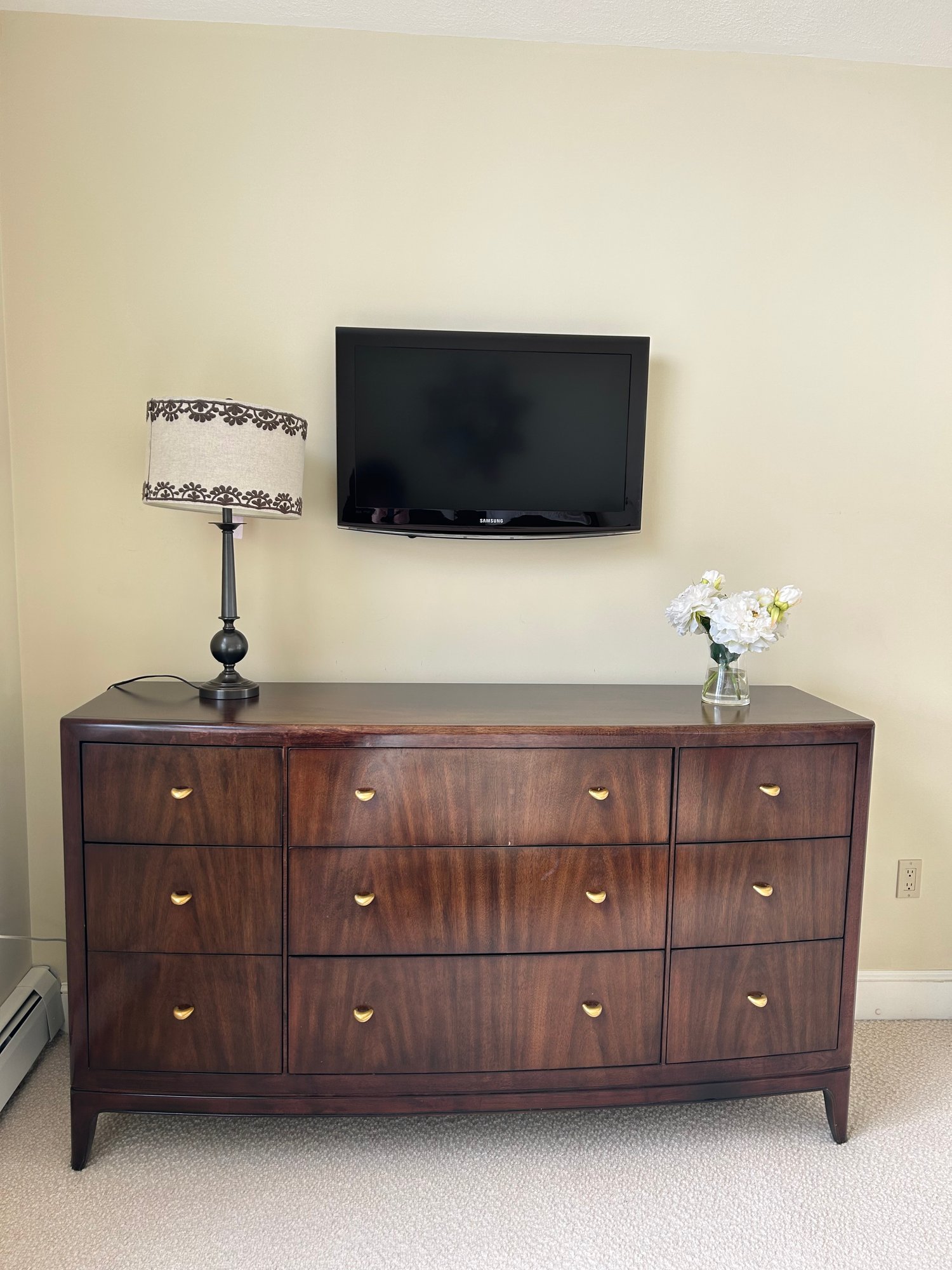 70x21x39.5 dresser. Does not include TV, flowers/vase, or lamp