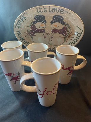 Oval snowman platter 12.5 inches x 8 inches, mugs , 5.75 inches, diameter 3 inches.
