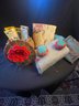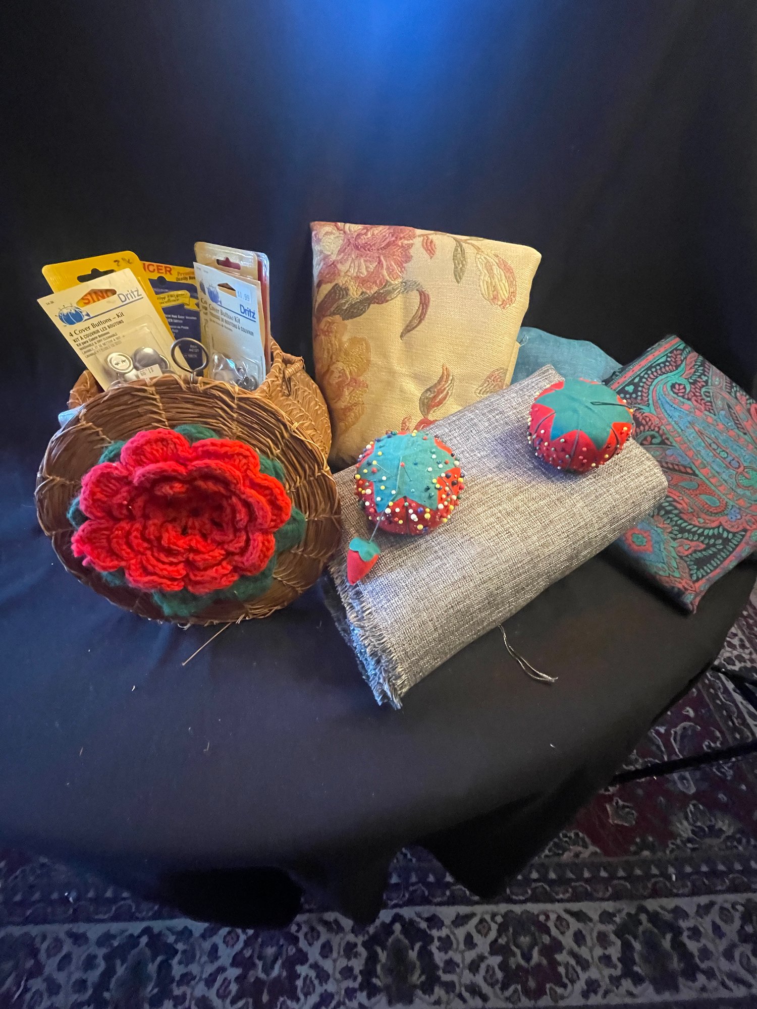 Four fabrics, 1-2 yds with round, covered sewing notion basket. Crocheted flower on top of basket, attached pin cushion on underside ( edge of cover damaged)