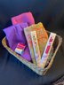 Three coordinating lightweight fabrics with two colors of matching thread and two invisible zippers, all contained in rectangular wicked and wire basket 12x9x5.5 inches