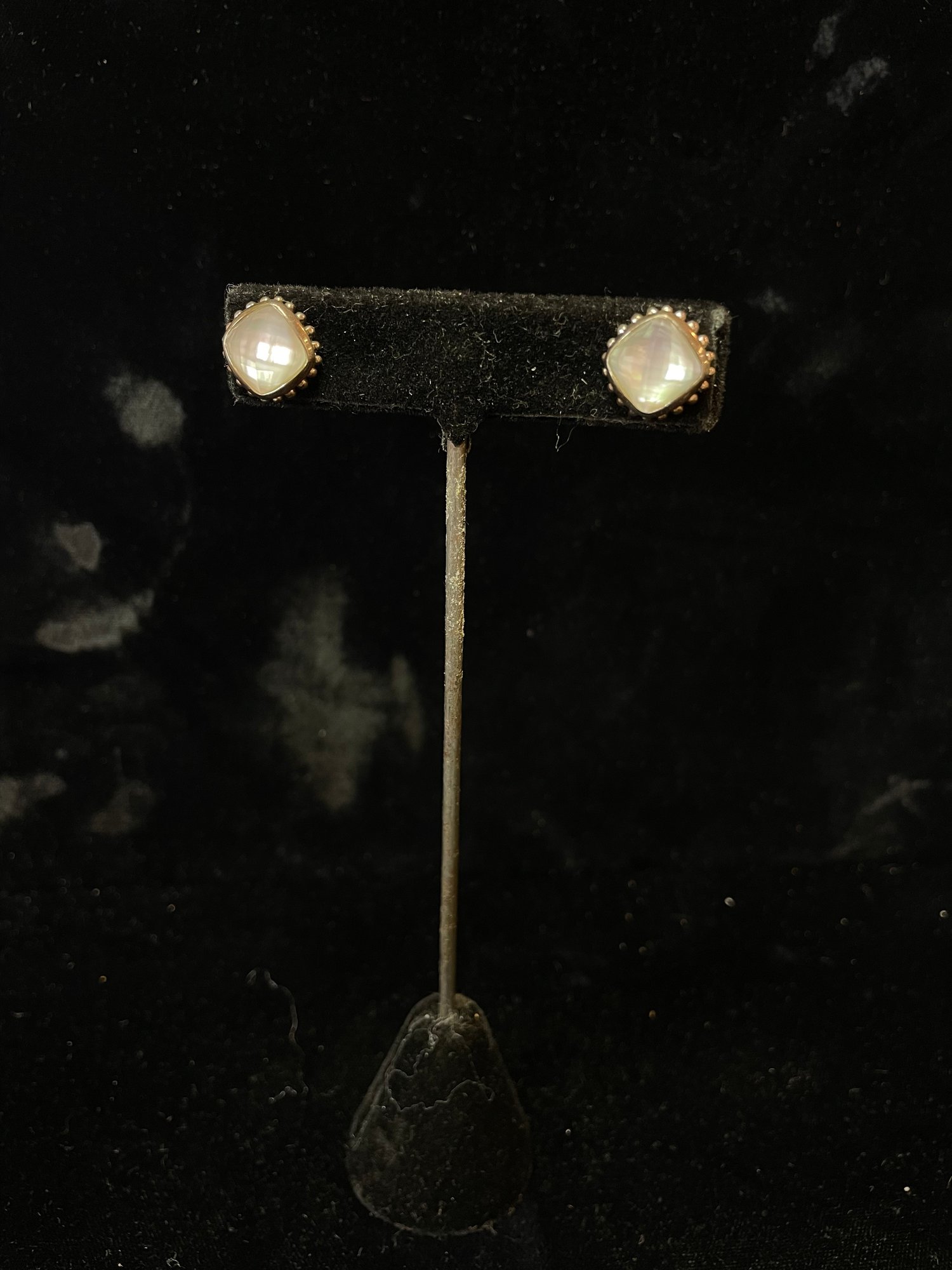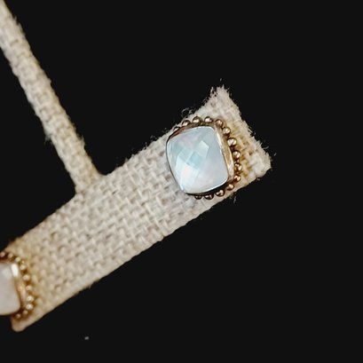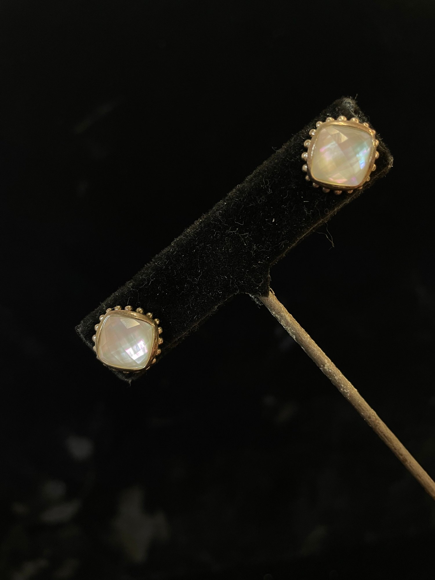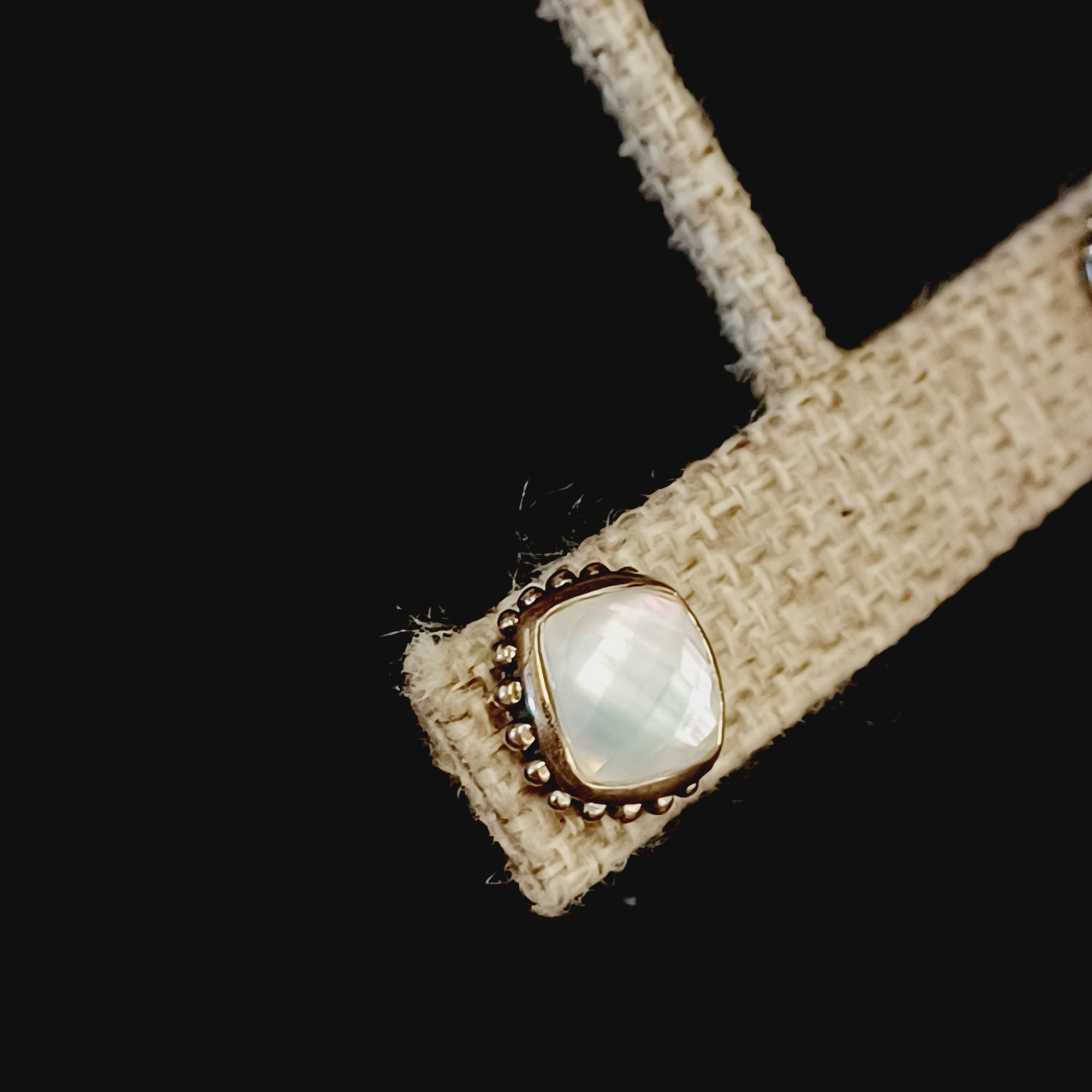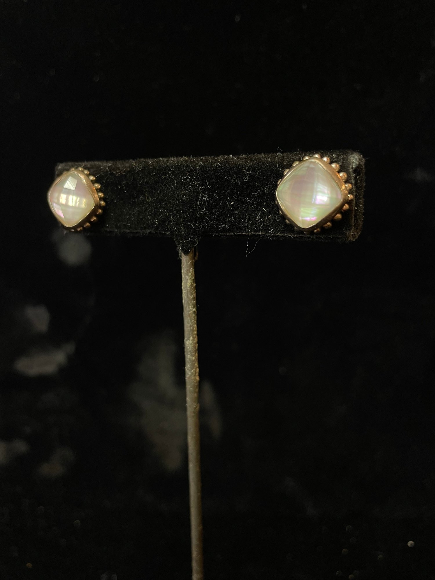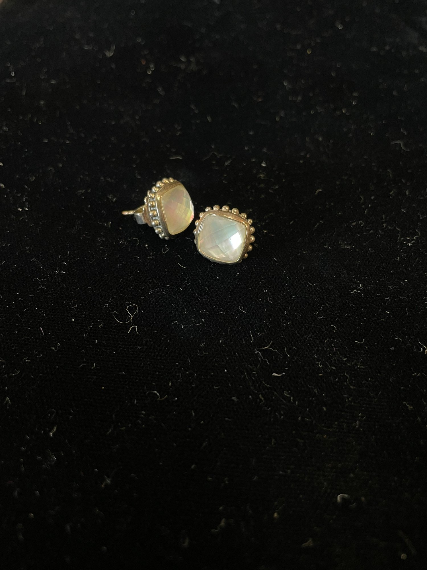 faceted glass over iridescent inlay, square with “925” posts and setting