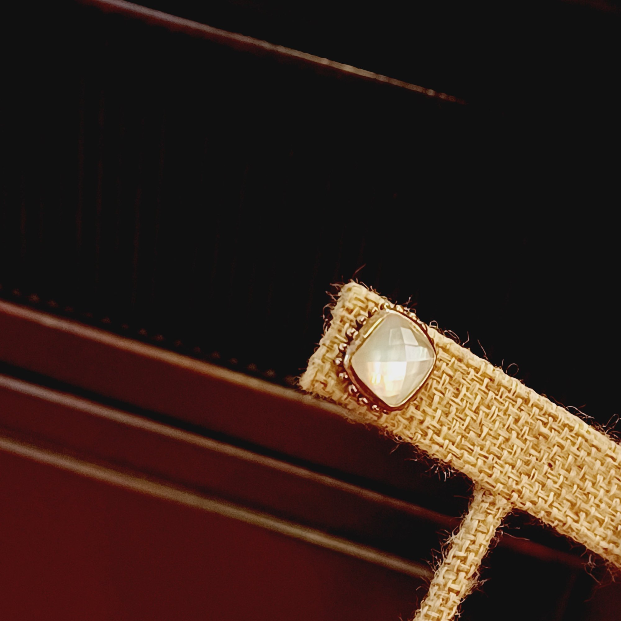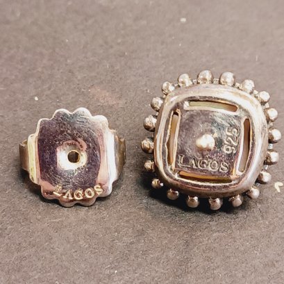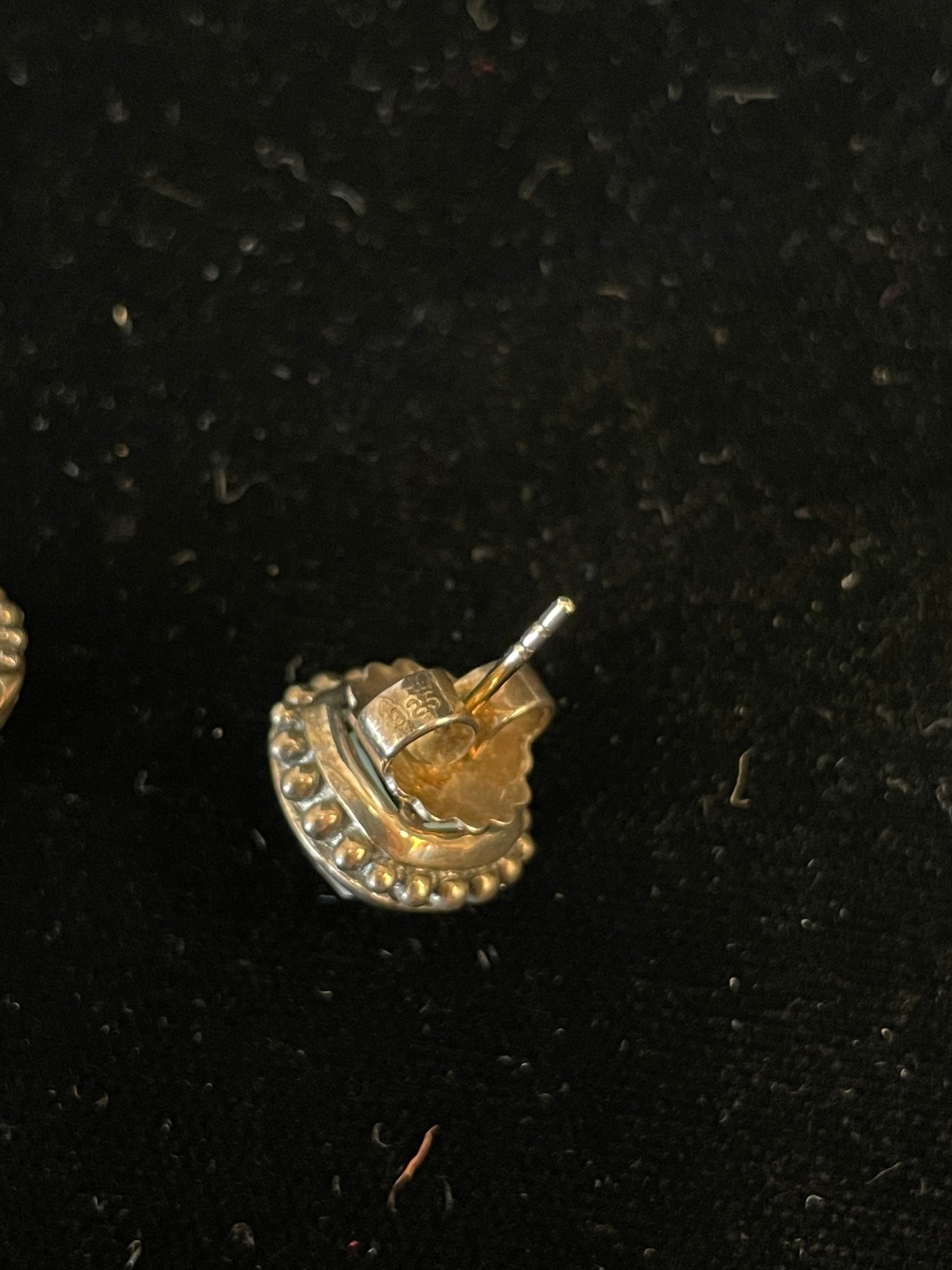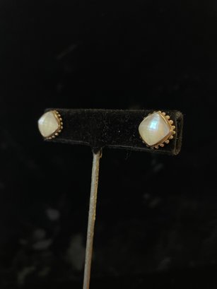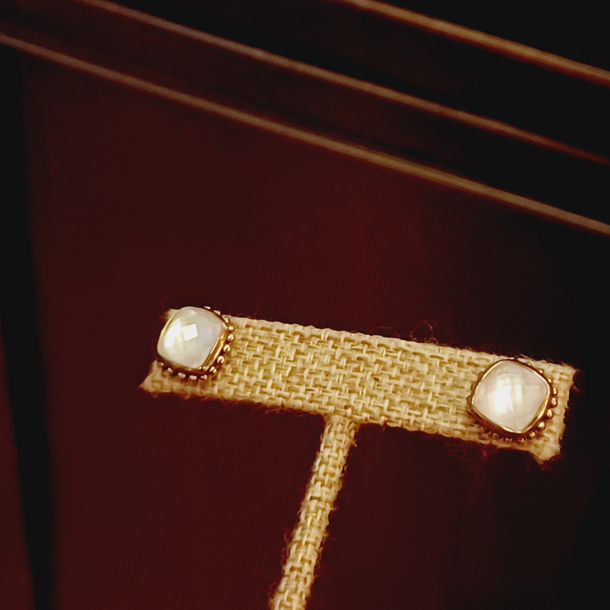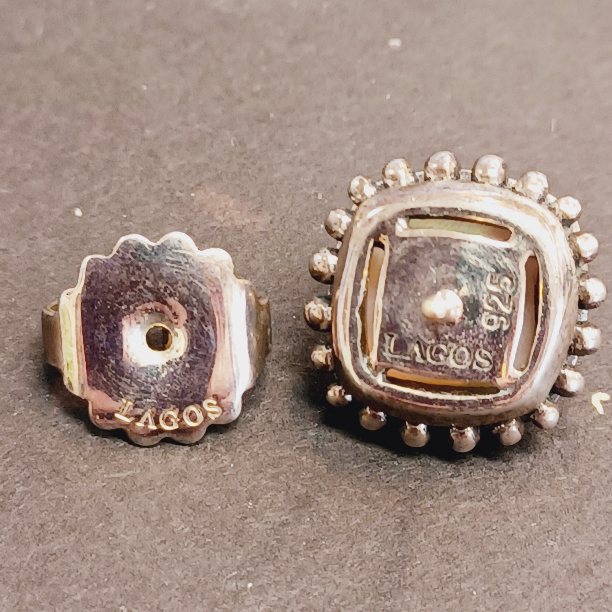 faceted glass over iridescent inlay, square with “925” posts and setting