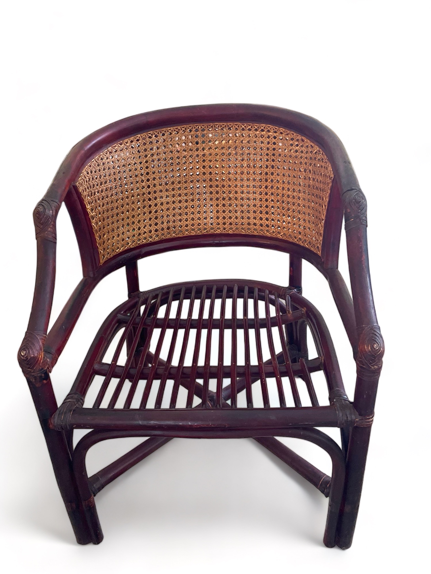 Wooden chair designed to look like bamboo with cane backing, section of a slat missing & separation see photos