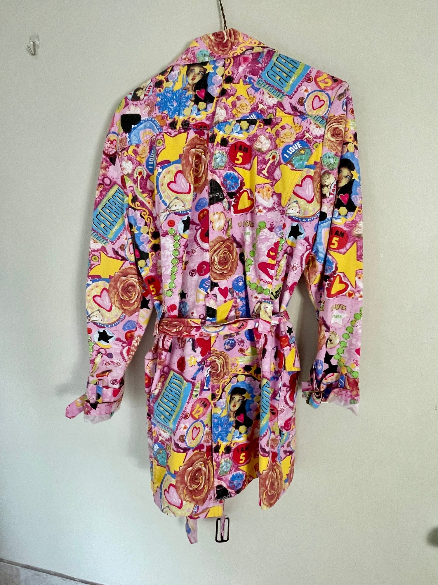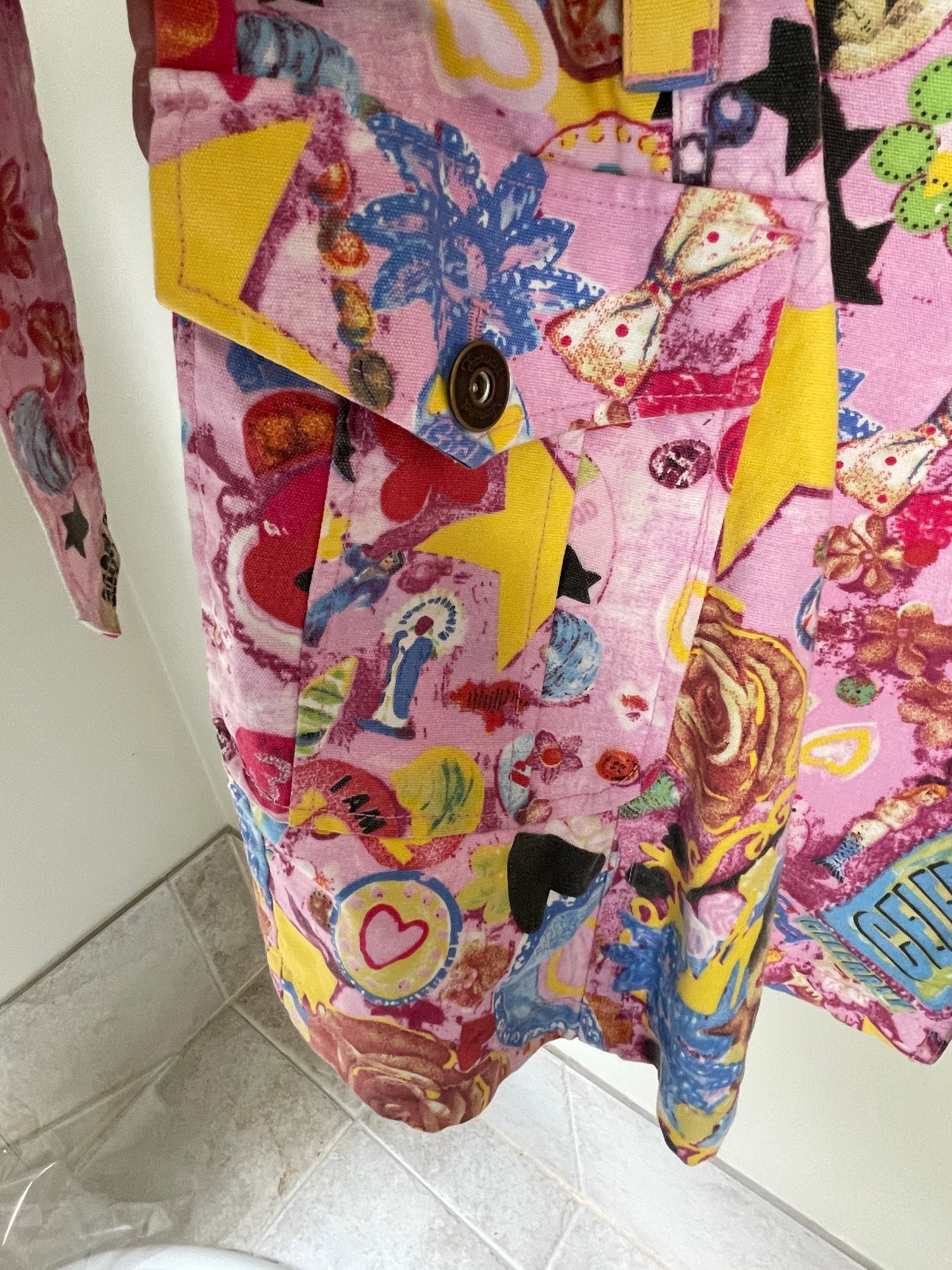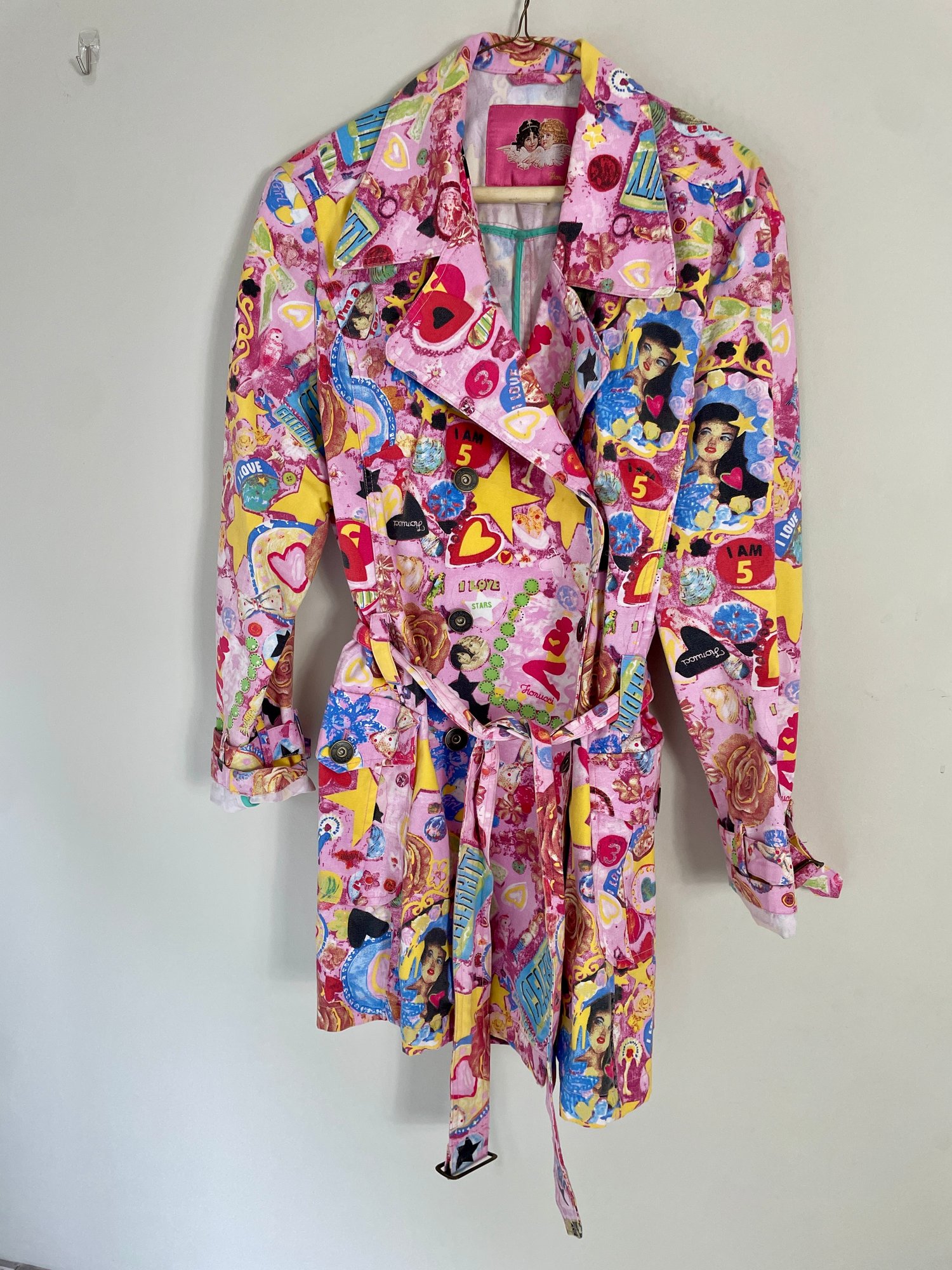 Vintage 2005 pop art trench coat with belt, side pockets and vent in back
