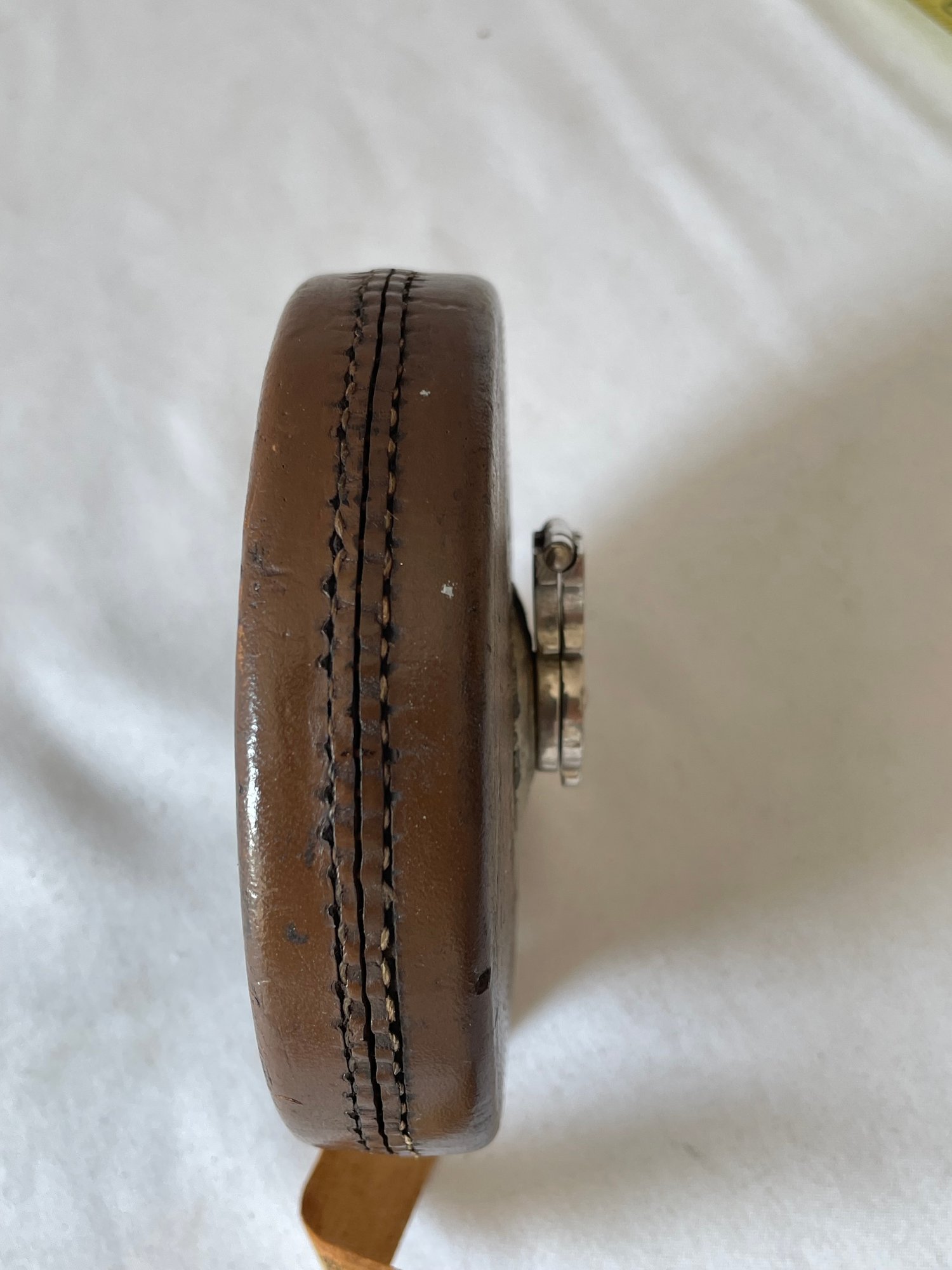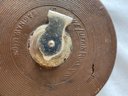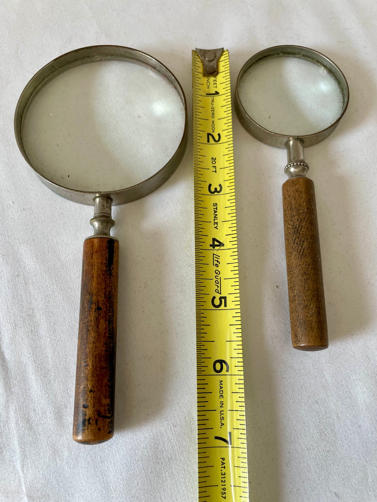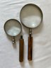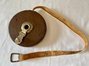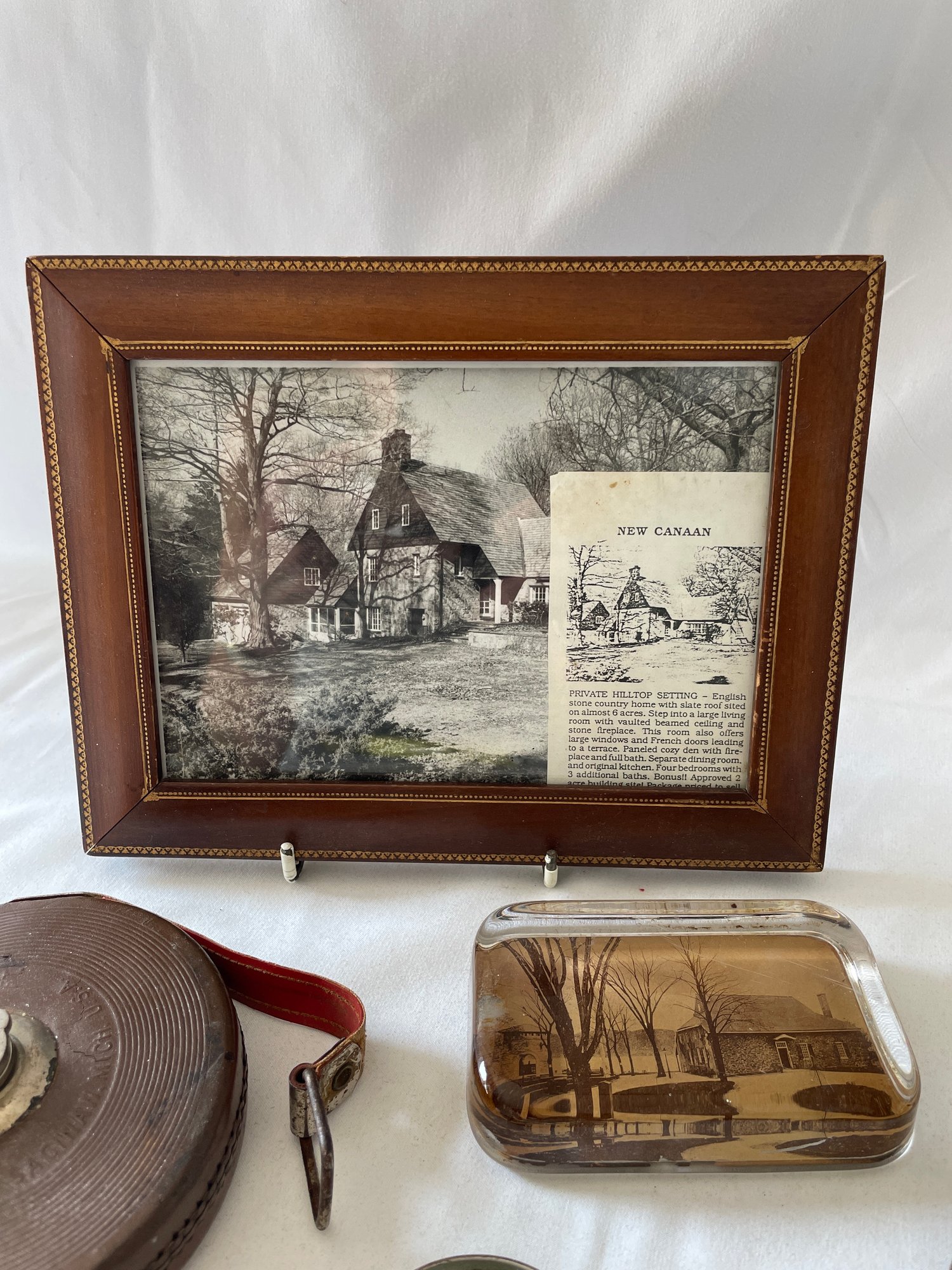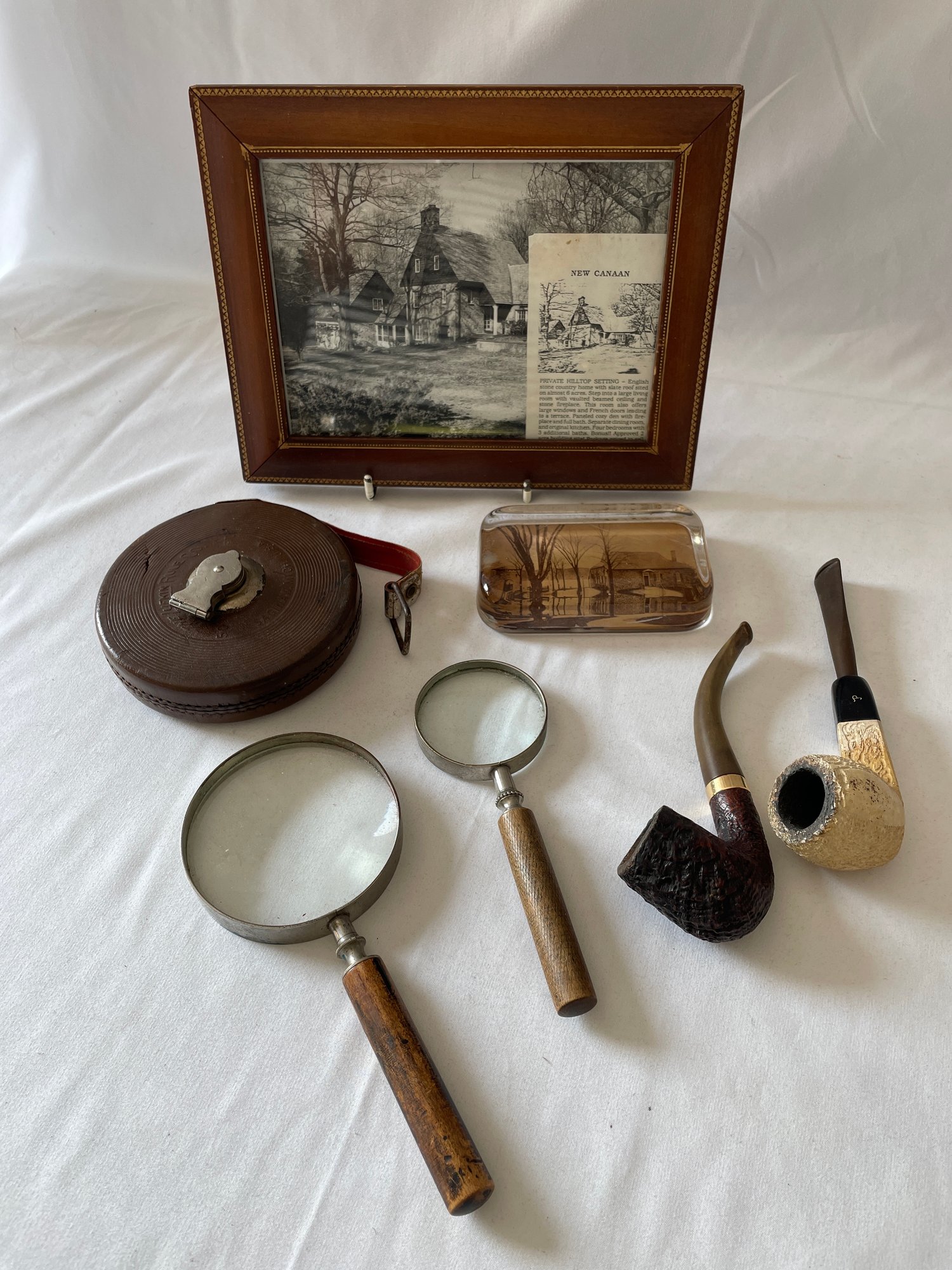 Lot of vintage items, Leather & wood frame, 2 pipes, 2 magnifying glasses, cloth measuring tape, paperweight