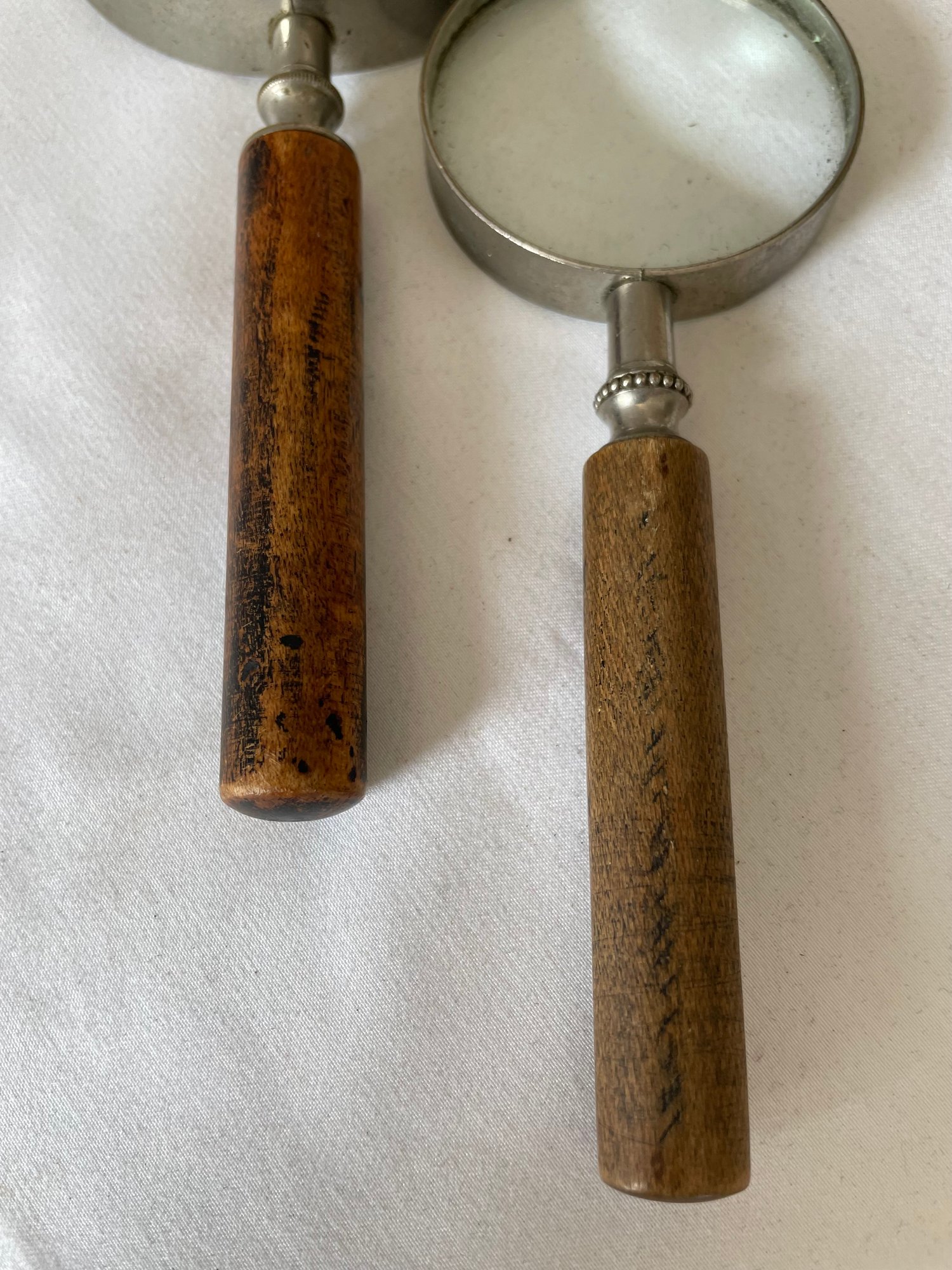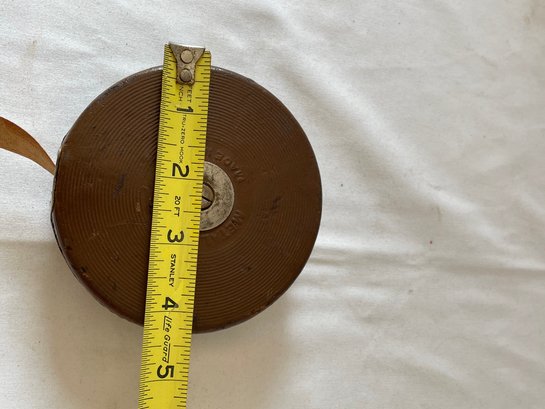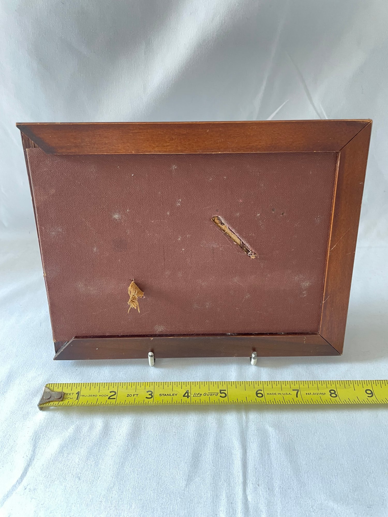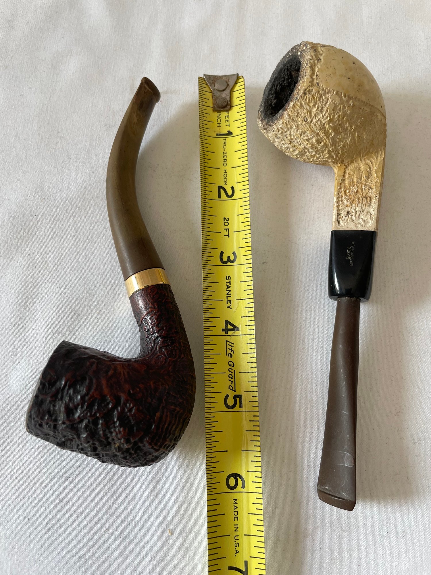 Lot of vintage items, Leather & wood frame, 2 pipes, 2 magnifying glasses, cloth measuring tape, paperweight