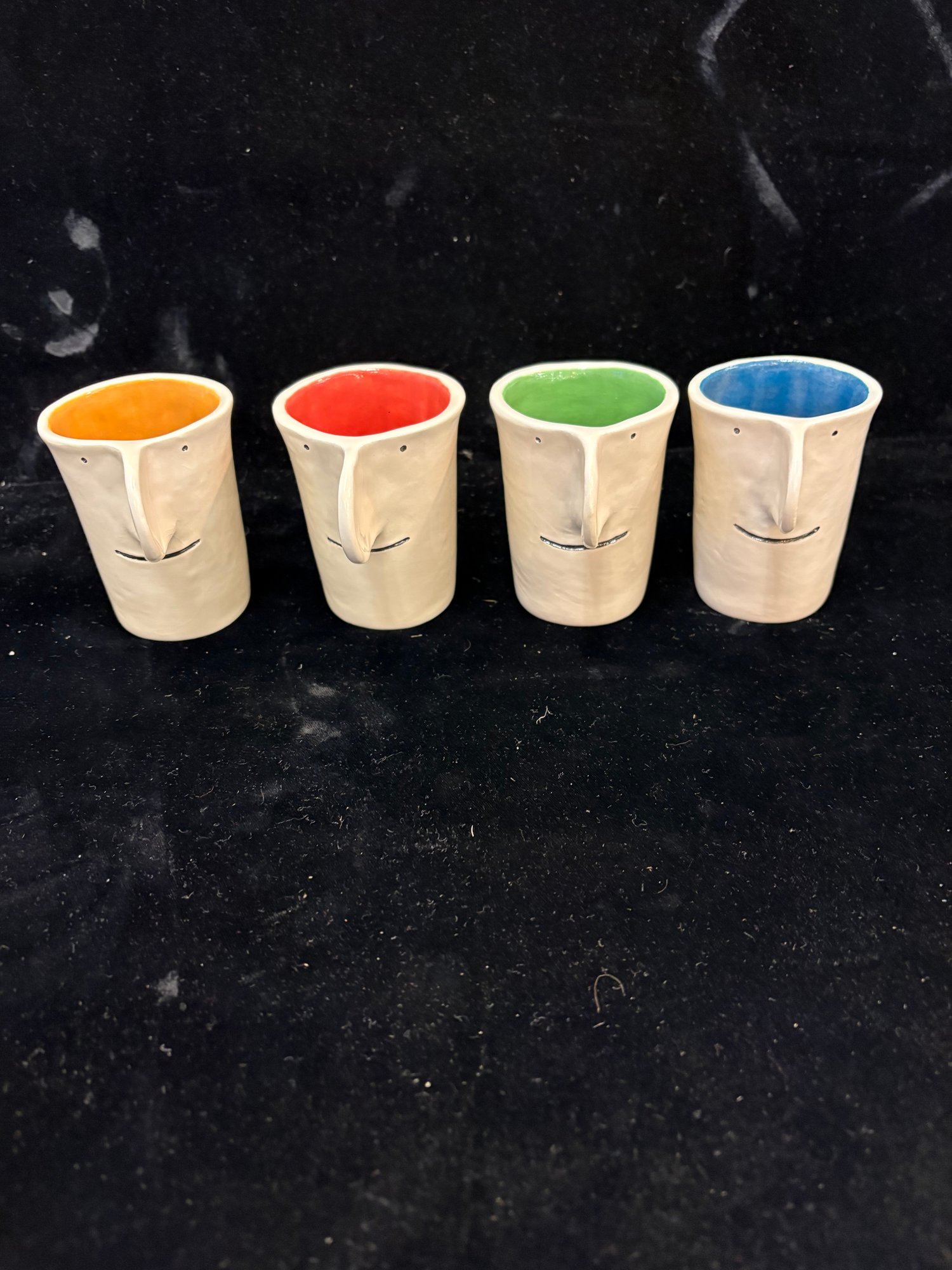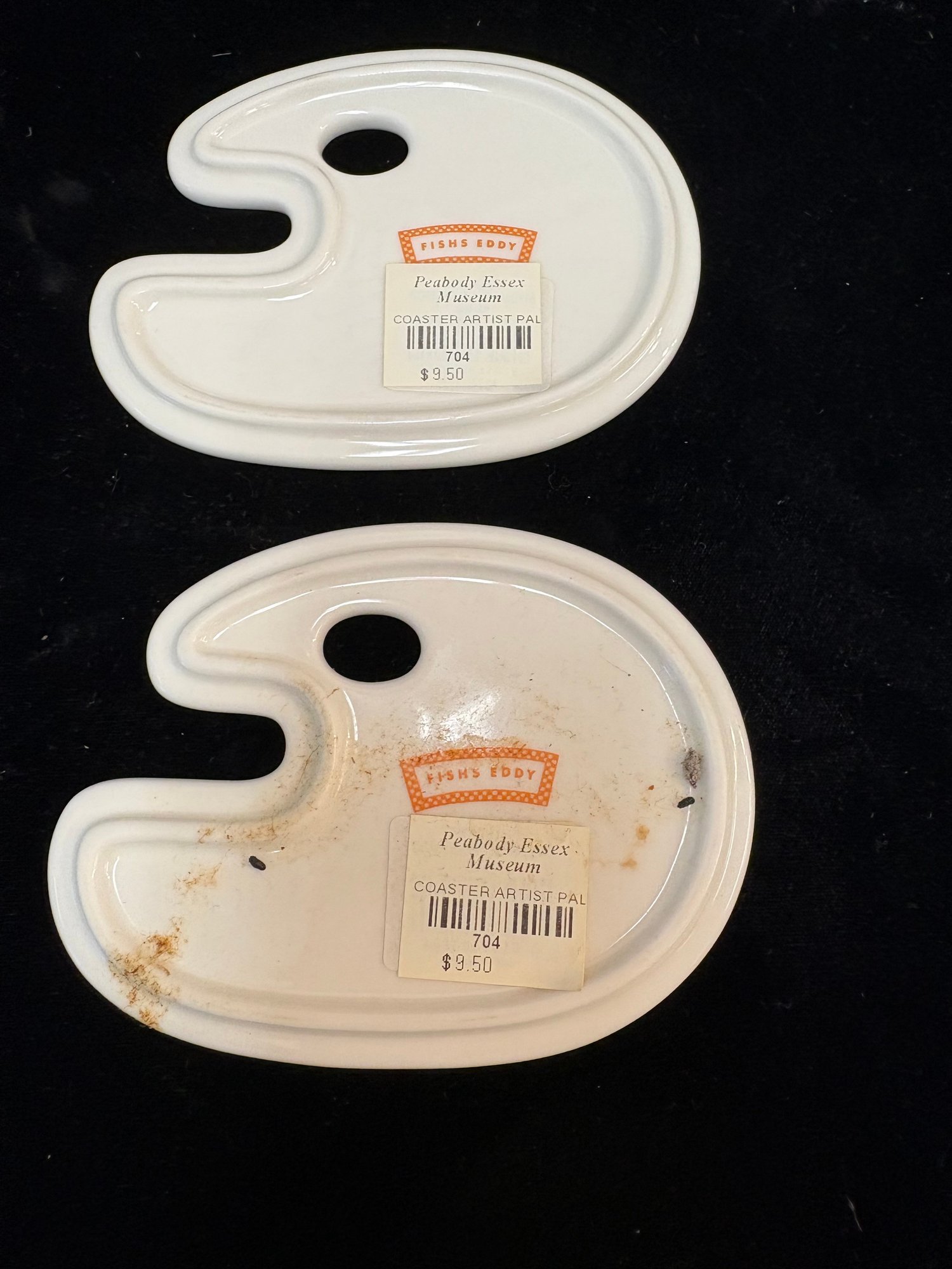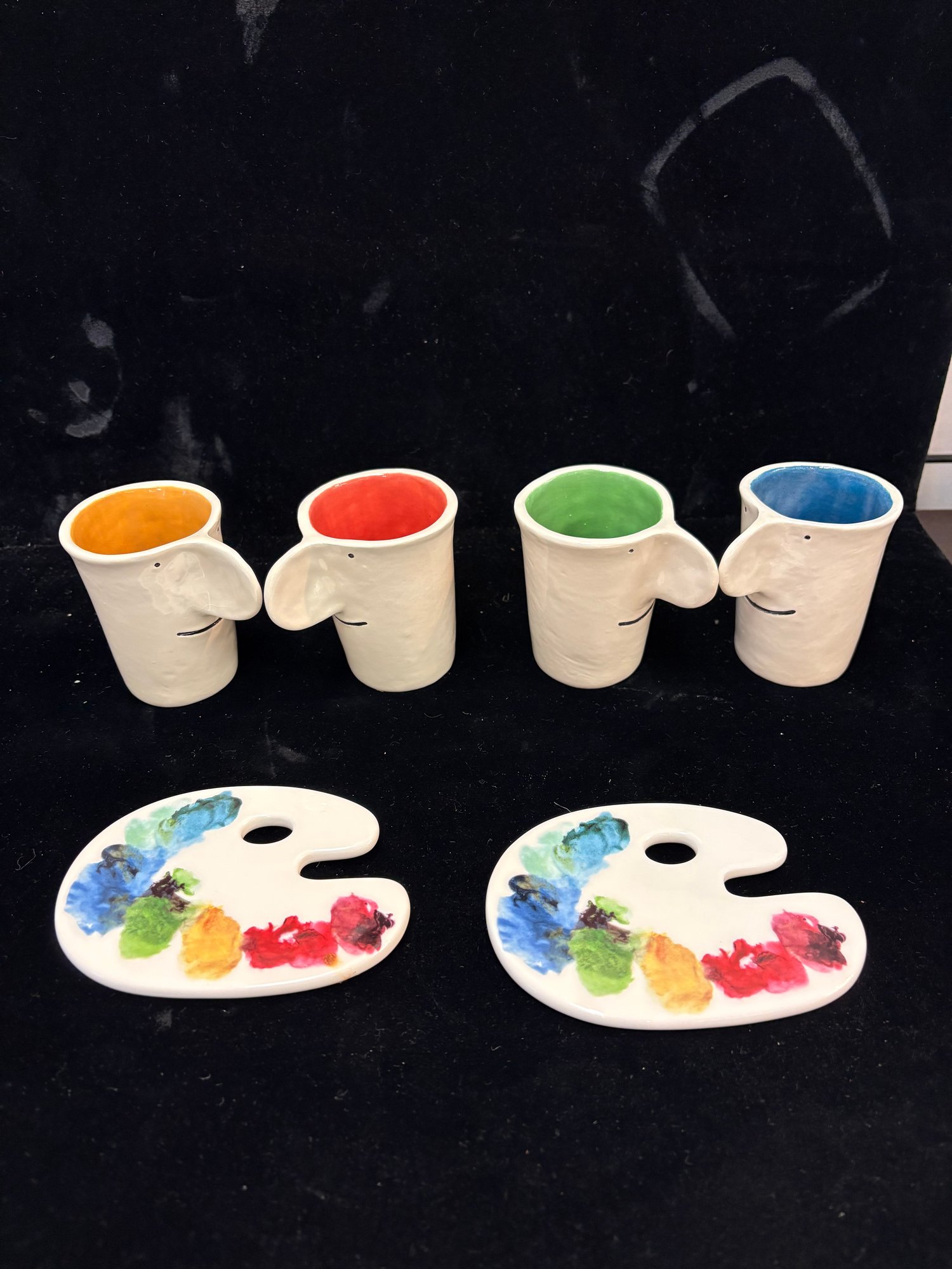 Colorful mugs and coasters from the Peabody Essex Museum all ceramic four mugs are 3 1/2 x 3 1/2“ and there’s four different colors painted inside and they all have smiley faces and the other ones are up paint pallet coasters ceramic 3 x 4“