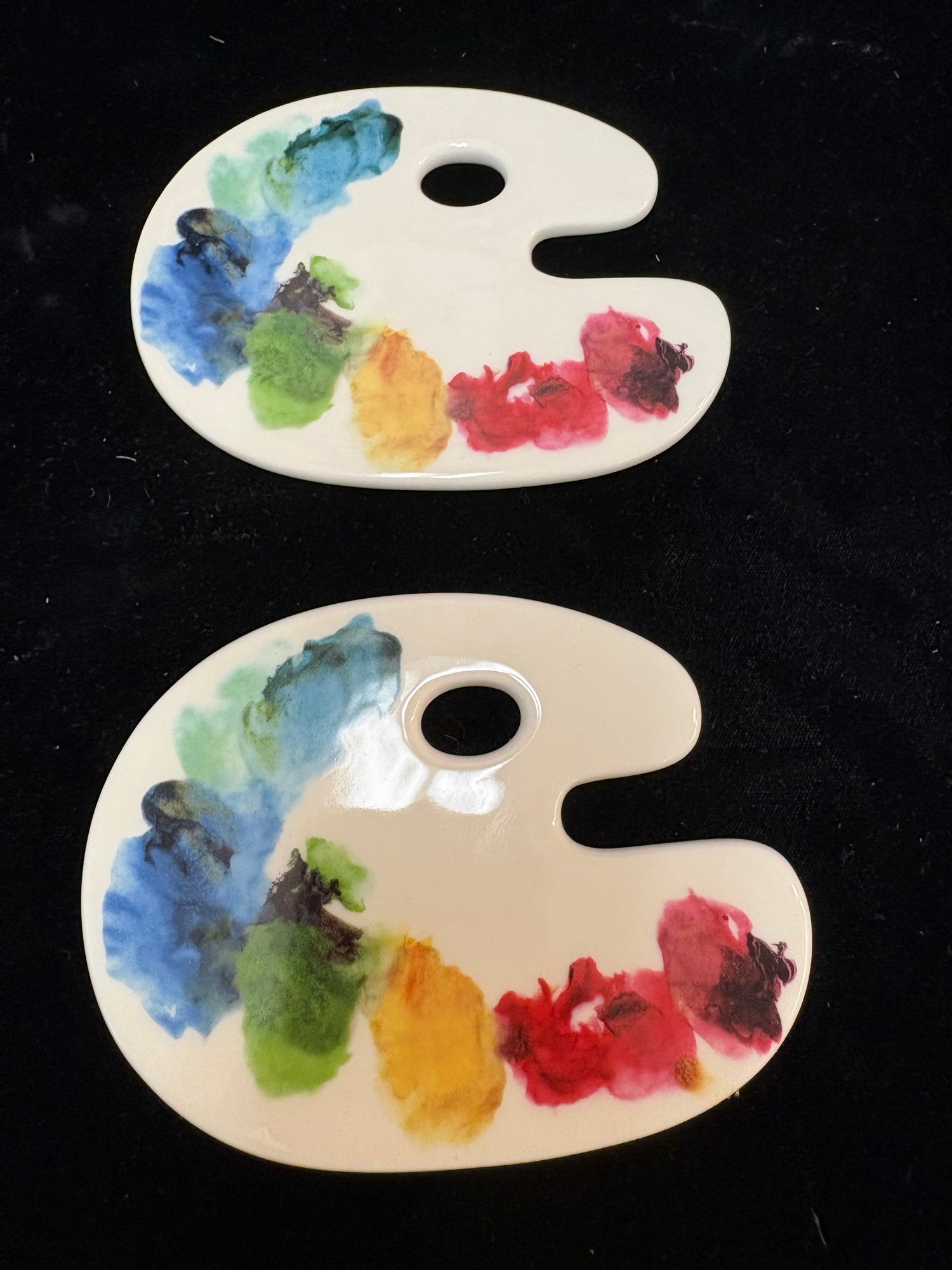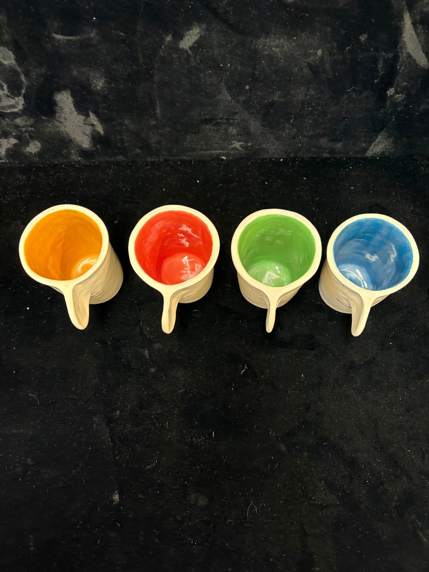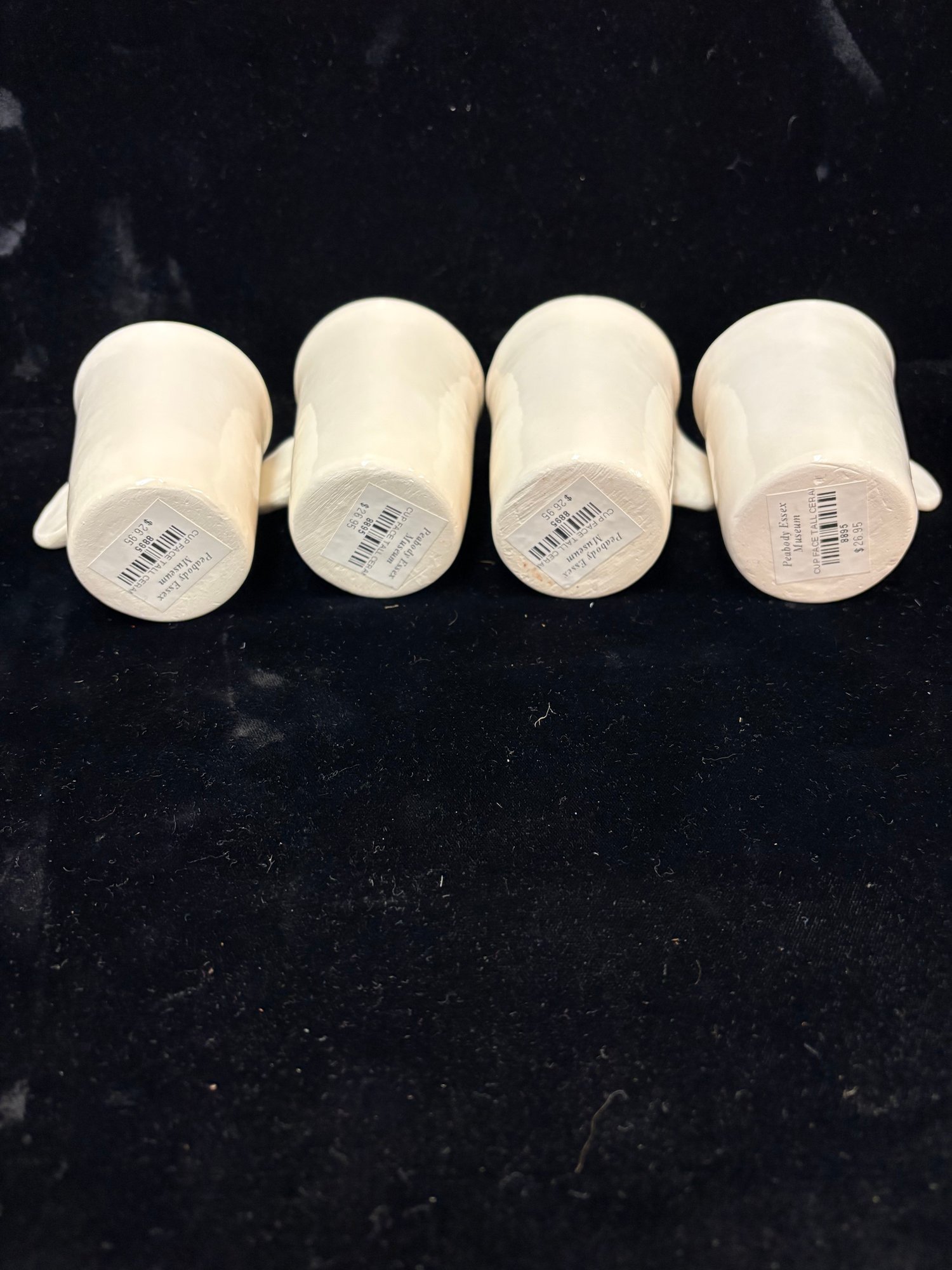 Colorful mugs and coasters from the Peabody Essex Museum all ceramic four mugs are 3 1/2 x 3 1/2“ and there’s four different colors painted inside and they all have smiley faces and the other ones are up paint pallet coasters ceramic 3 x 4“