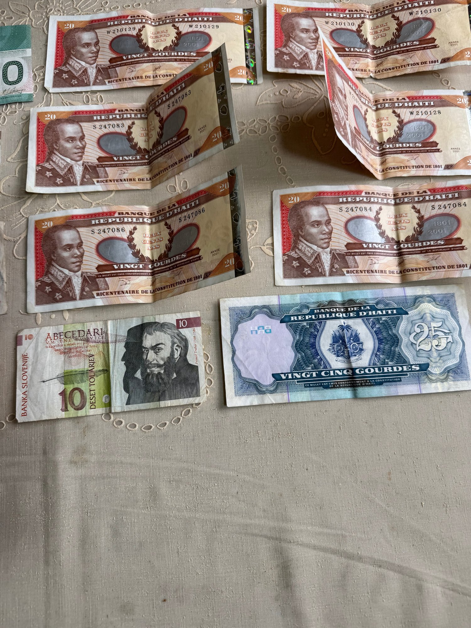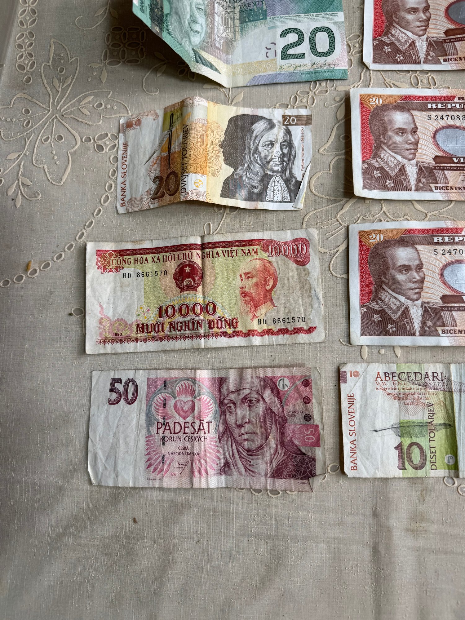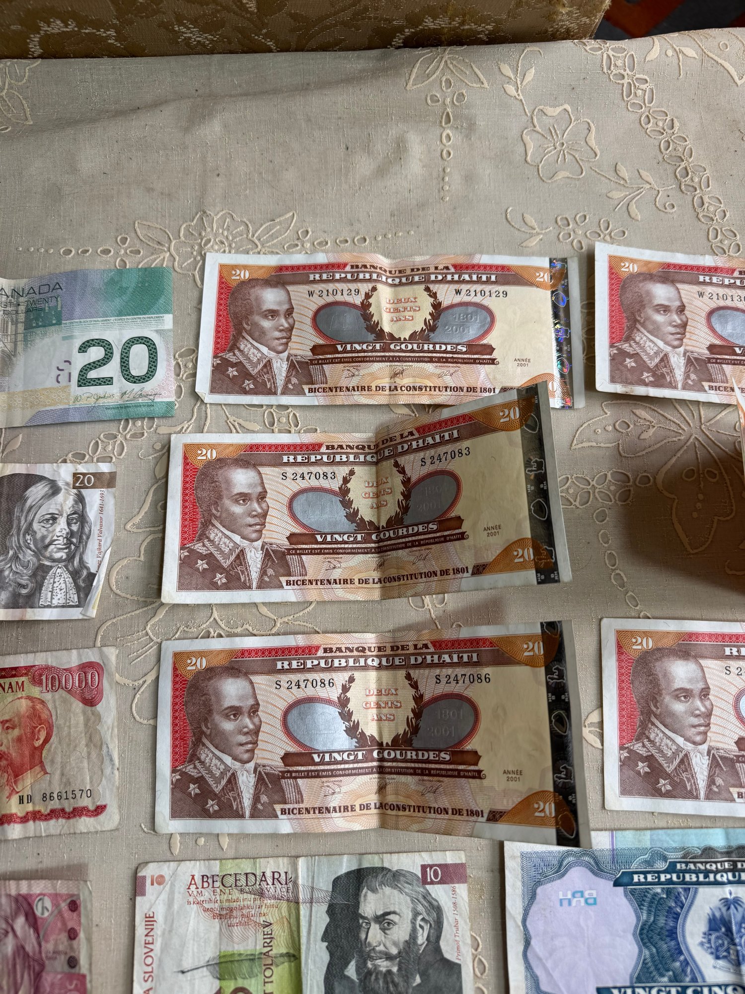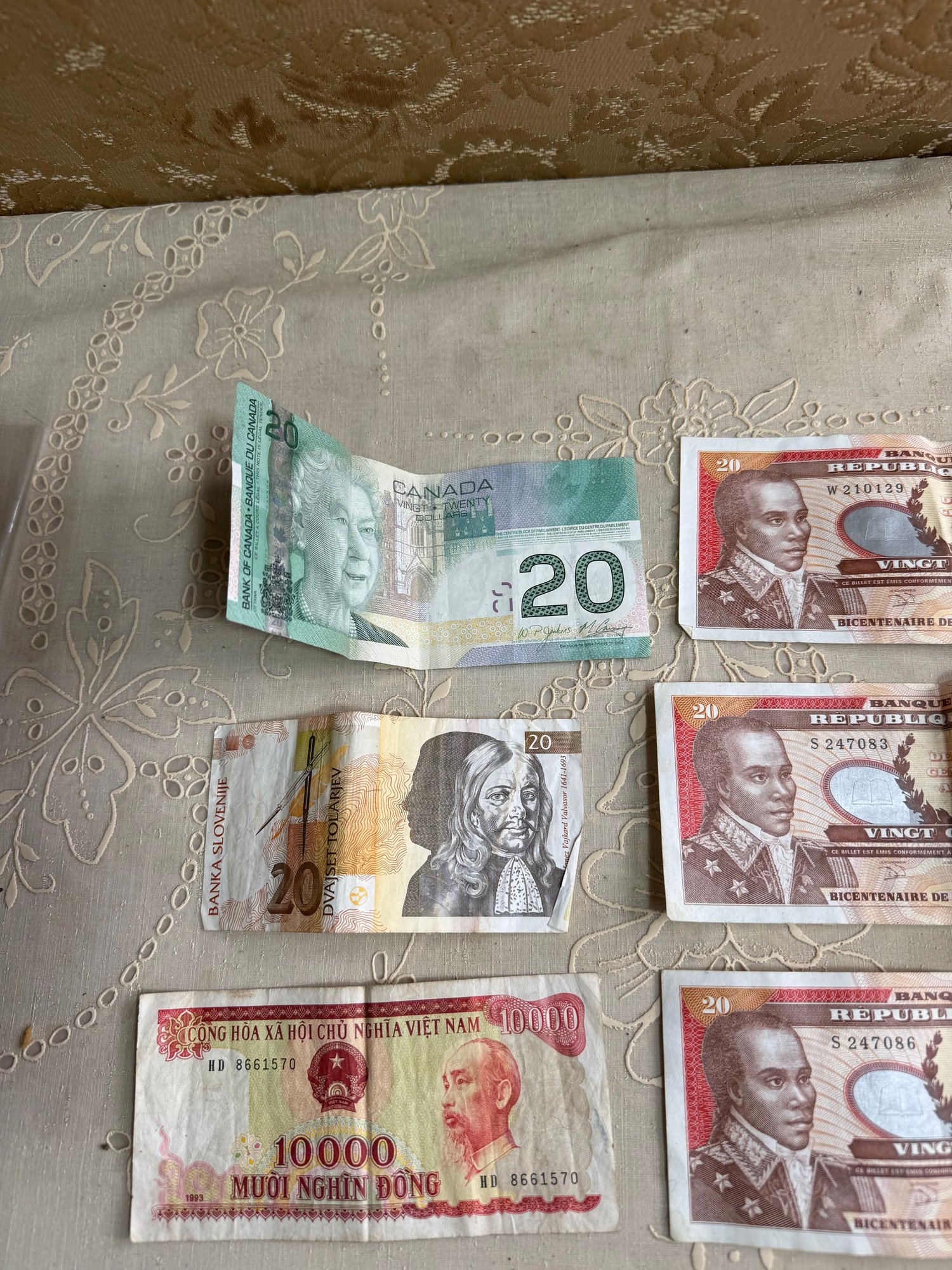 includes a group of paper money from various countries including Haiti, Canada, Vietnam, Slovenia & more