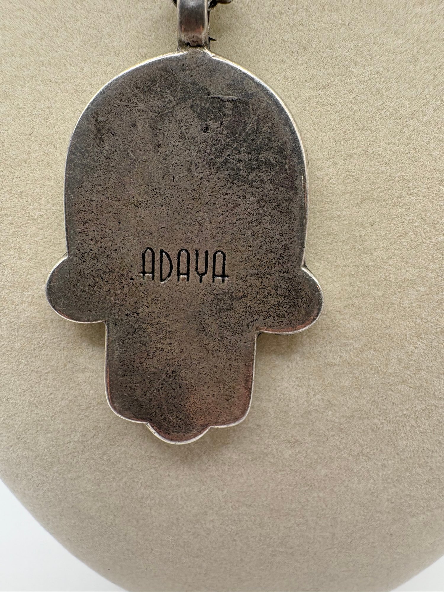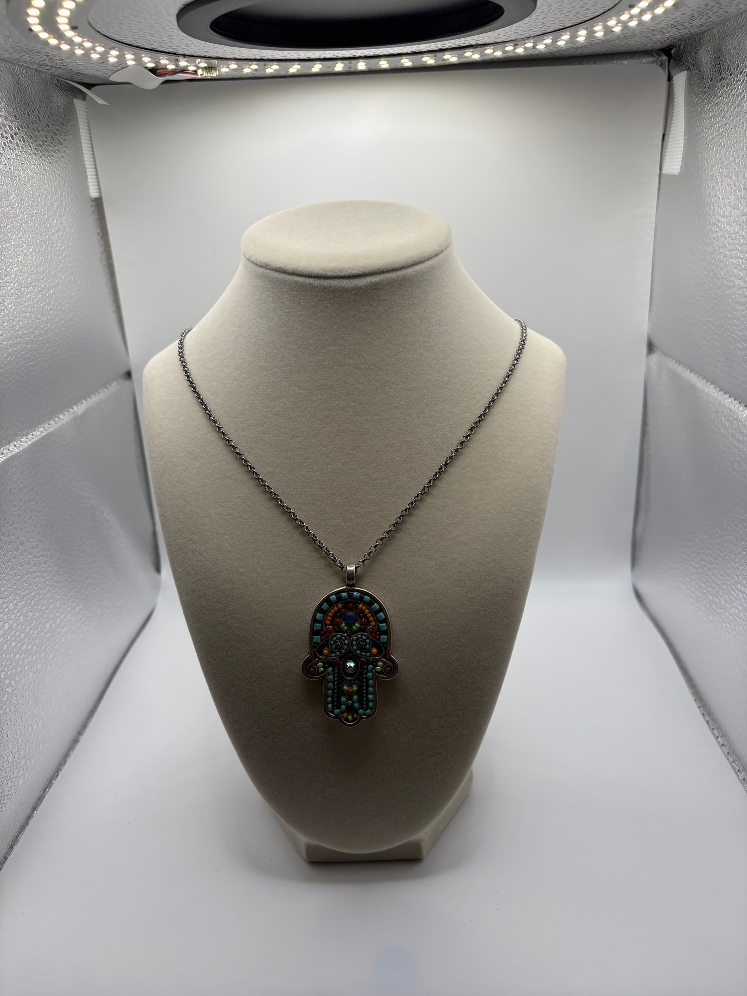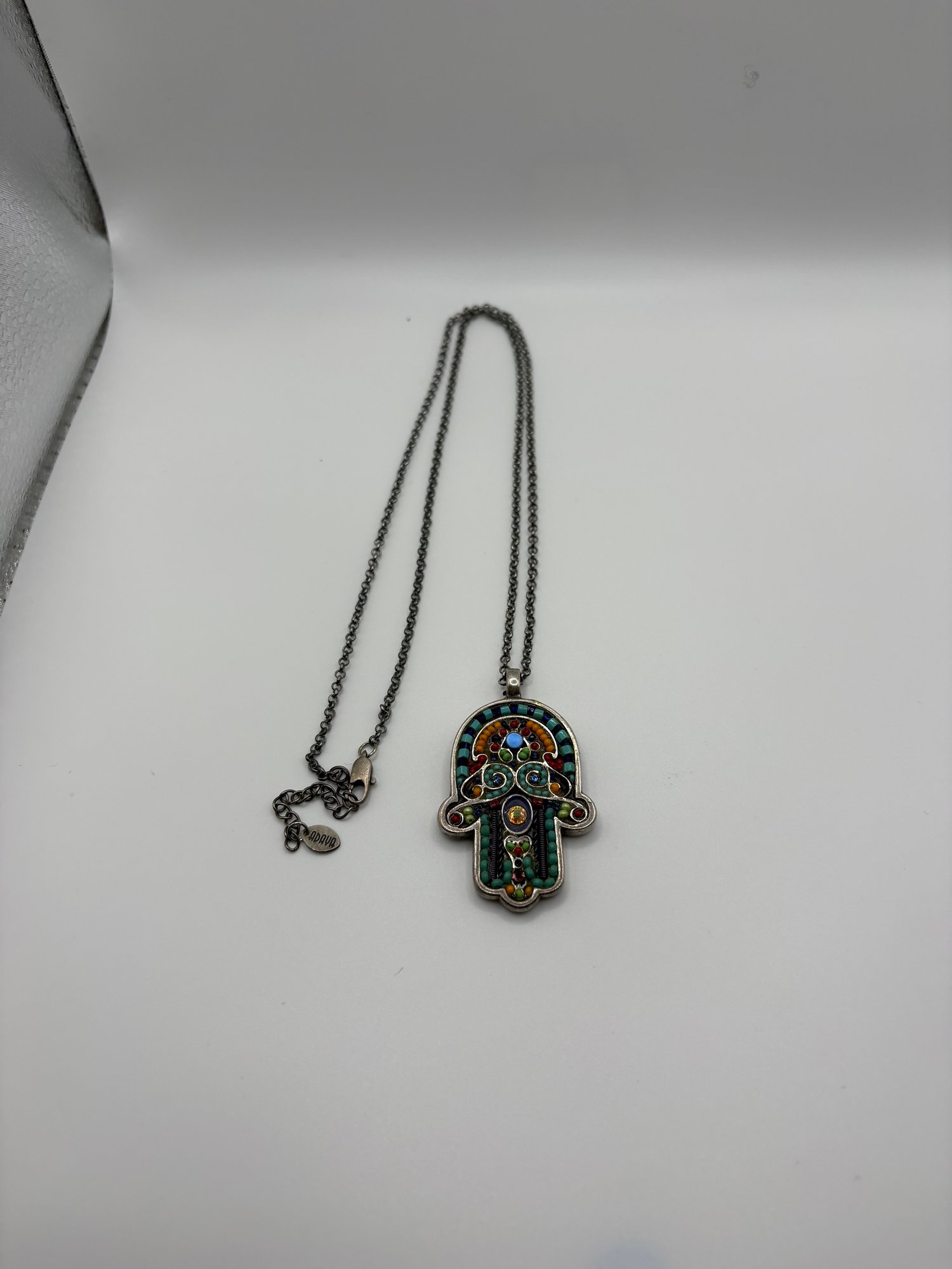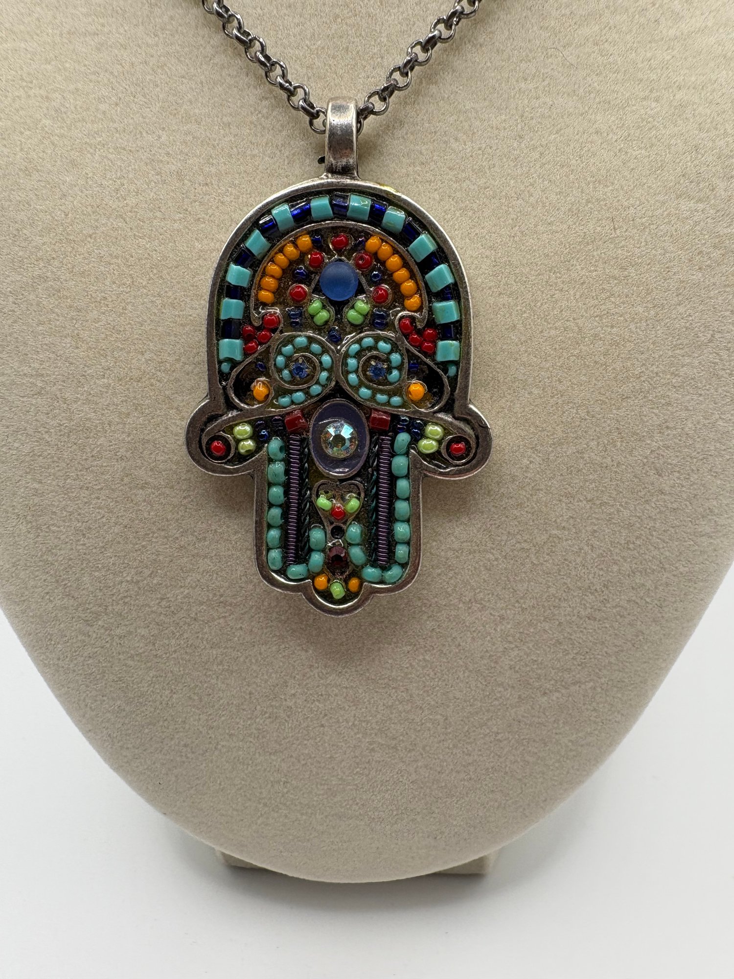 Vintage Adaya Israel Hamsa Hand Pendant Mosaic Glass Rhinestone Boho Judaica 15 in