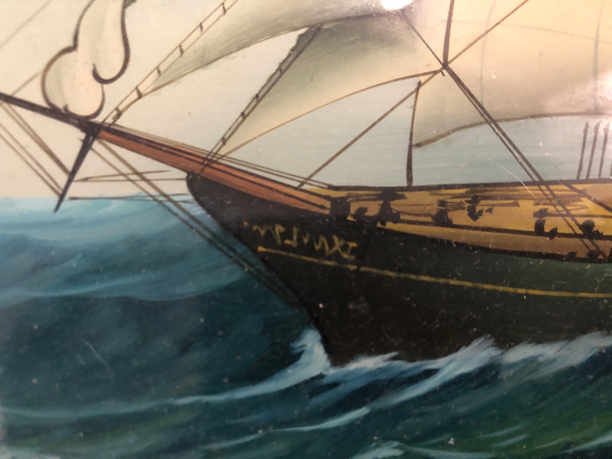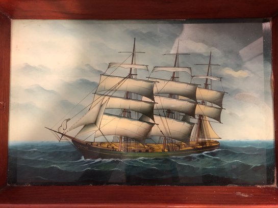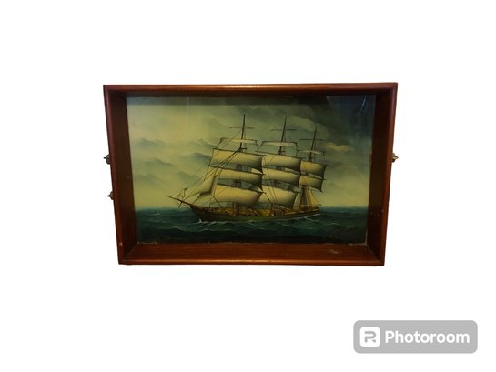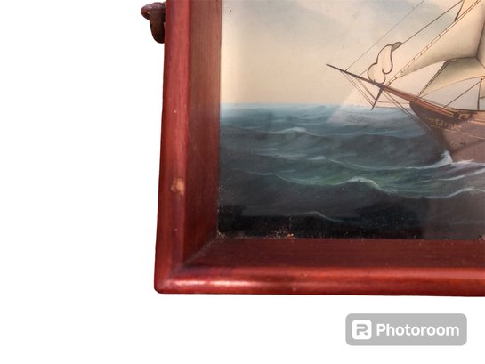Mahogony wood frame with gold-painted handle (15x10) nautical print of three-masted ship signed