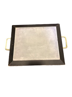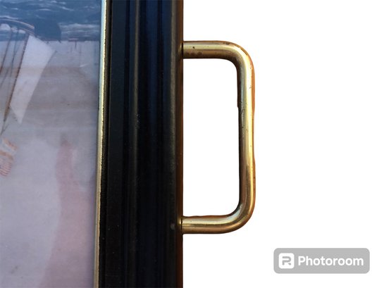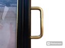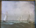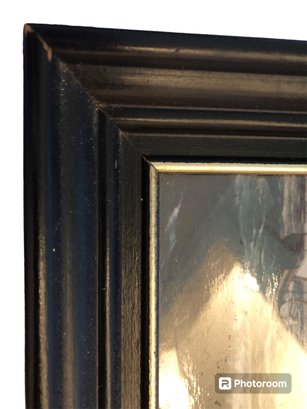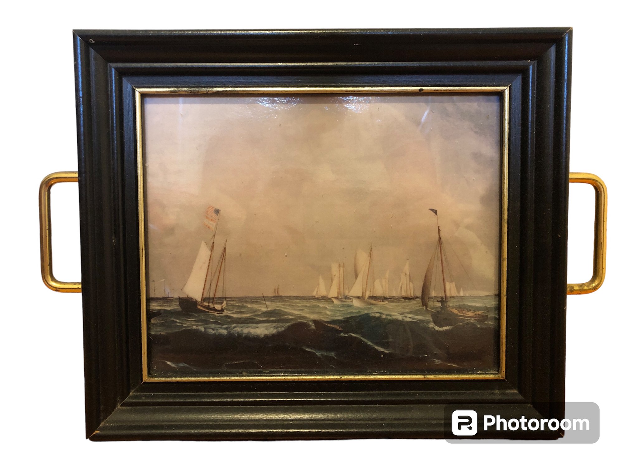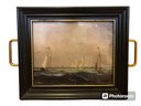 black painted wood frame with gold painted frame interior with gold-painted handle (12.l5x10.5) of harbor sailboats