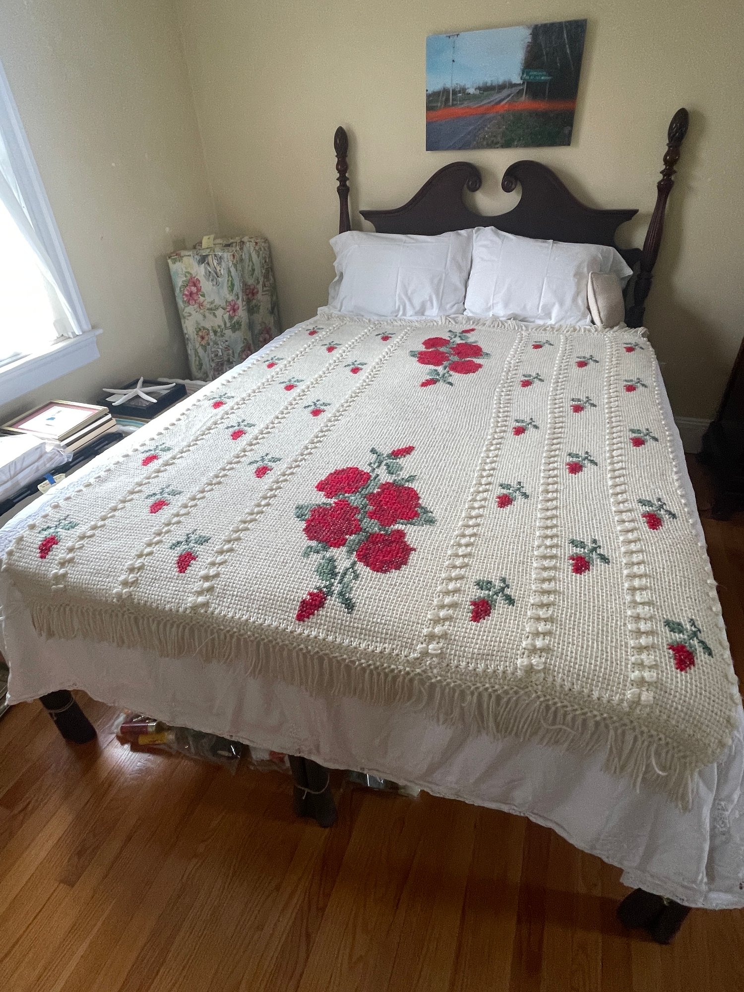 Hand made ivory color throw with red rose design, green leaves, fringe on both ends. Variety of stitches, very soft yarn. 54x70 inches