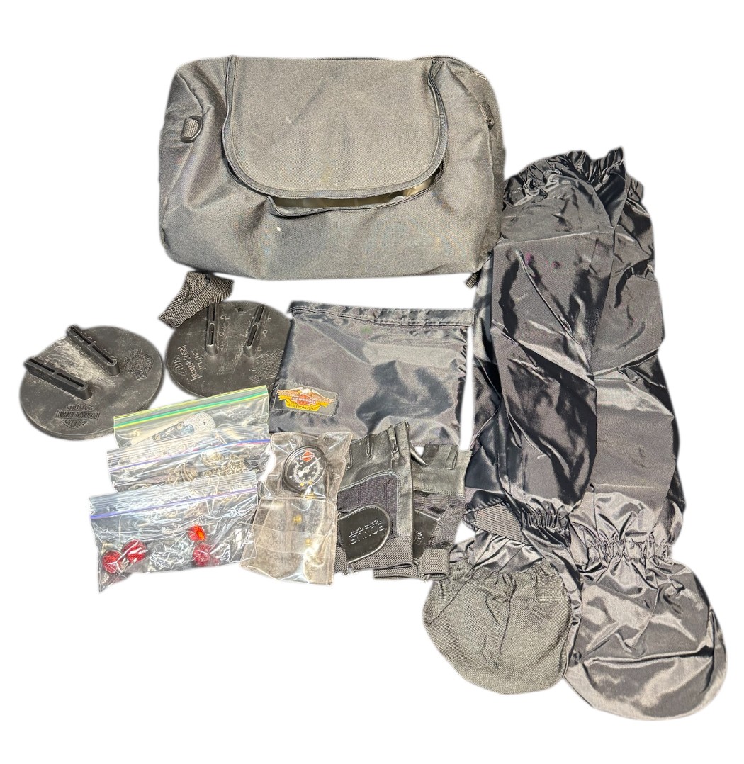 includes a Harley Davidson bag filled with assorted motorcycle accessories