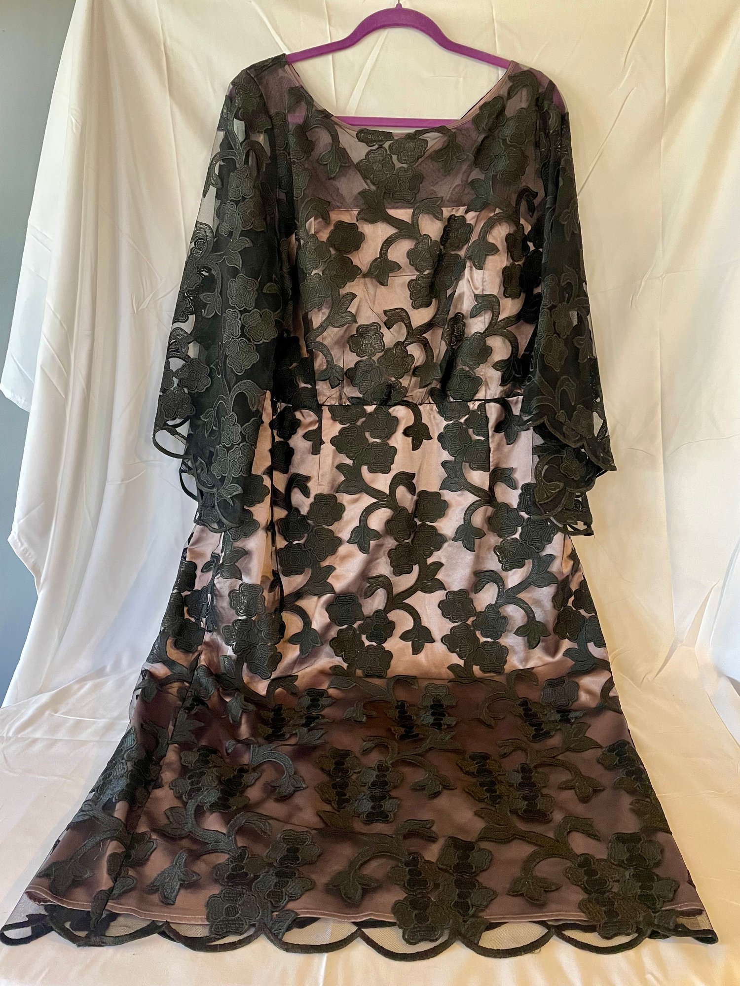 JS Collections Woman black lace over lilac bodice, bell shaped lace sleeves, size 16W