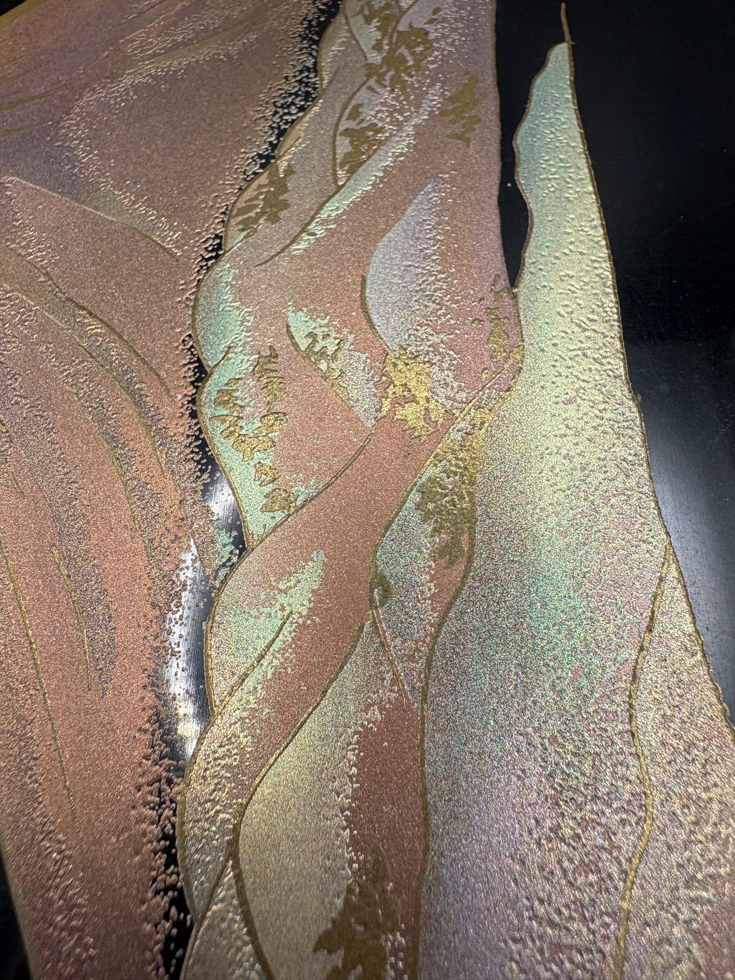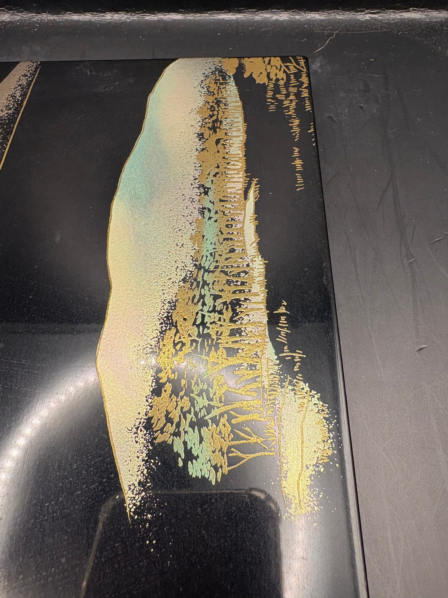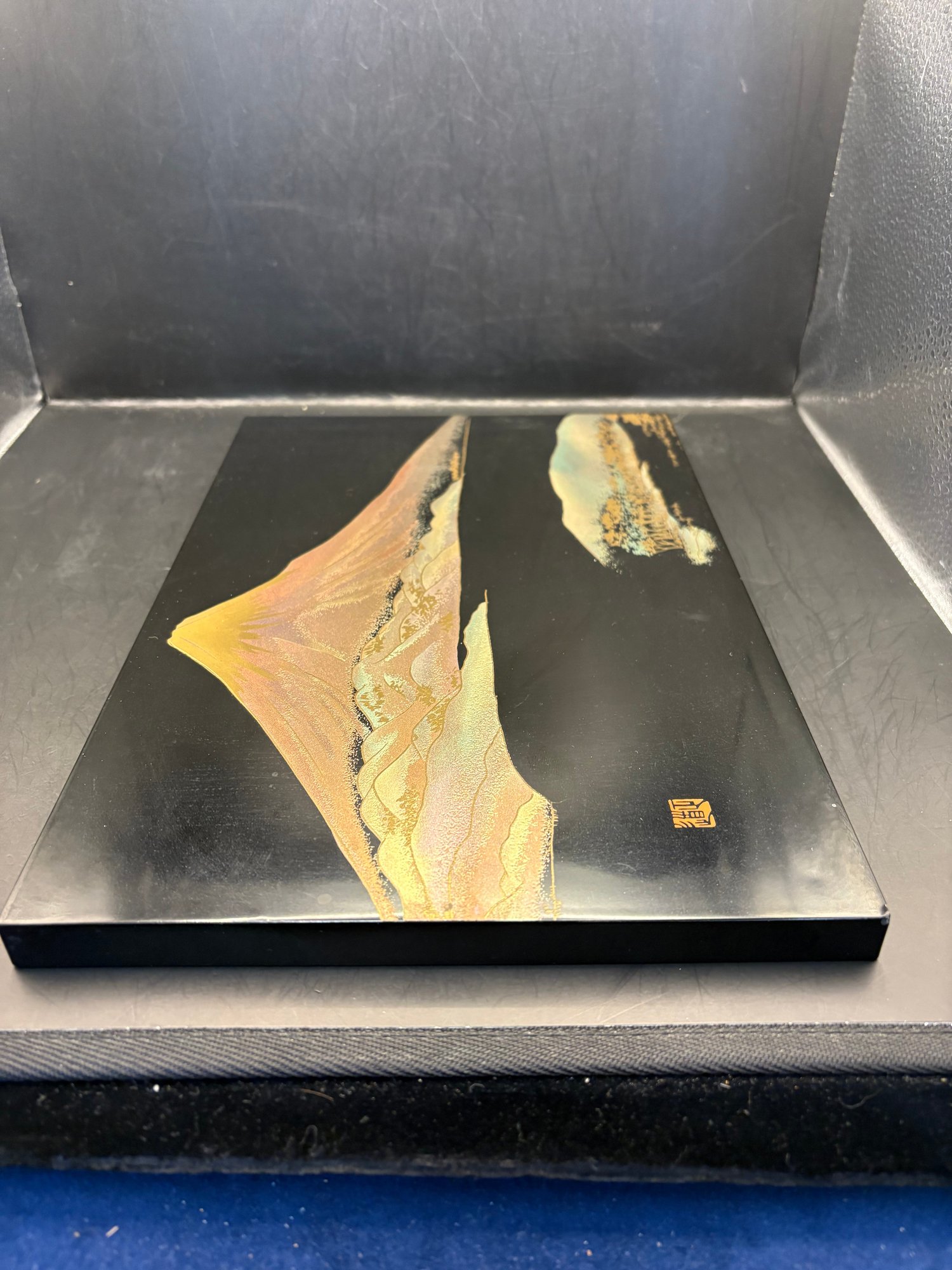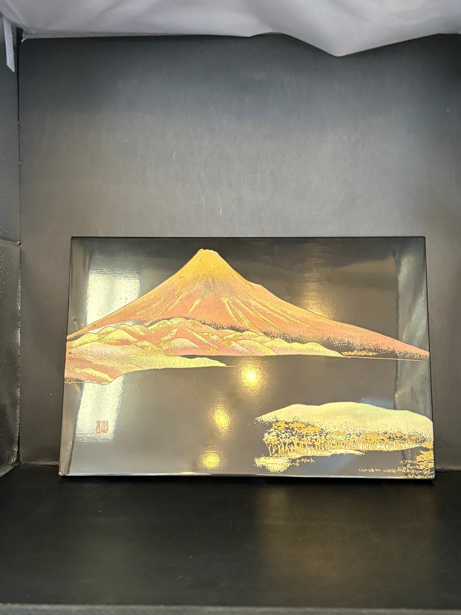 Japanese image of Mount Fuji lacquer on wood 12 x 8